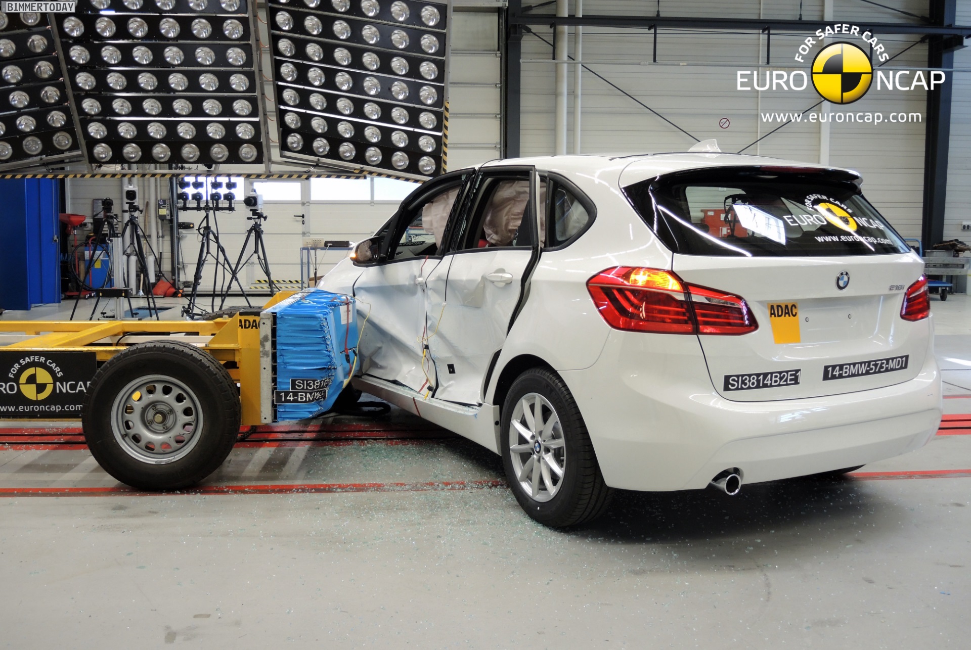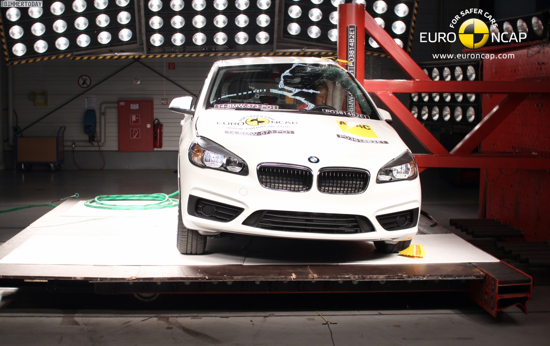 Wie bei jedem Euro NCAP Crashtest wurde auch beim BMW 2er Active Tourer nicht nur die Sicherheit beim Frontal-Crash mit 64 km/h getestet, auch ein Seitenaufprall und ein seitlicher Pfahl-Crash wurden simuliert. Gut bewertet wurden auch die Kopfstützen, die im Fall eines Heck-Aufpralls Verletzungen im Hals-Nacken-Bereich entgegenwirken.