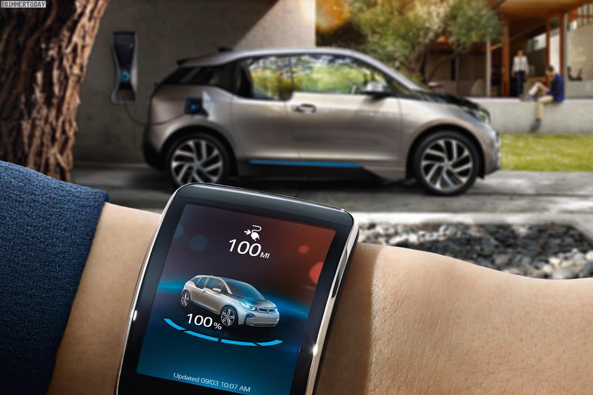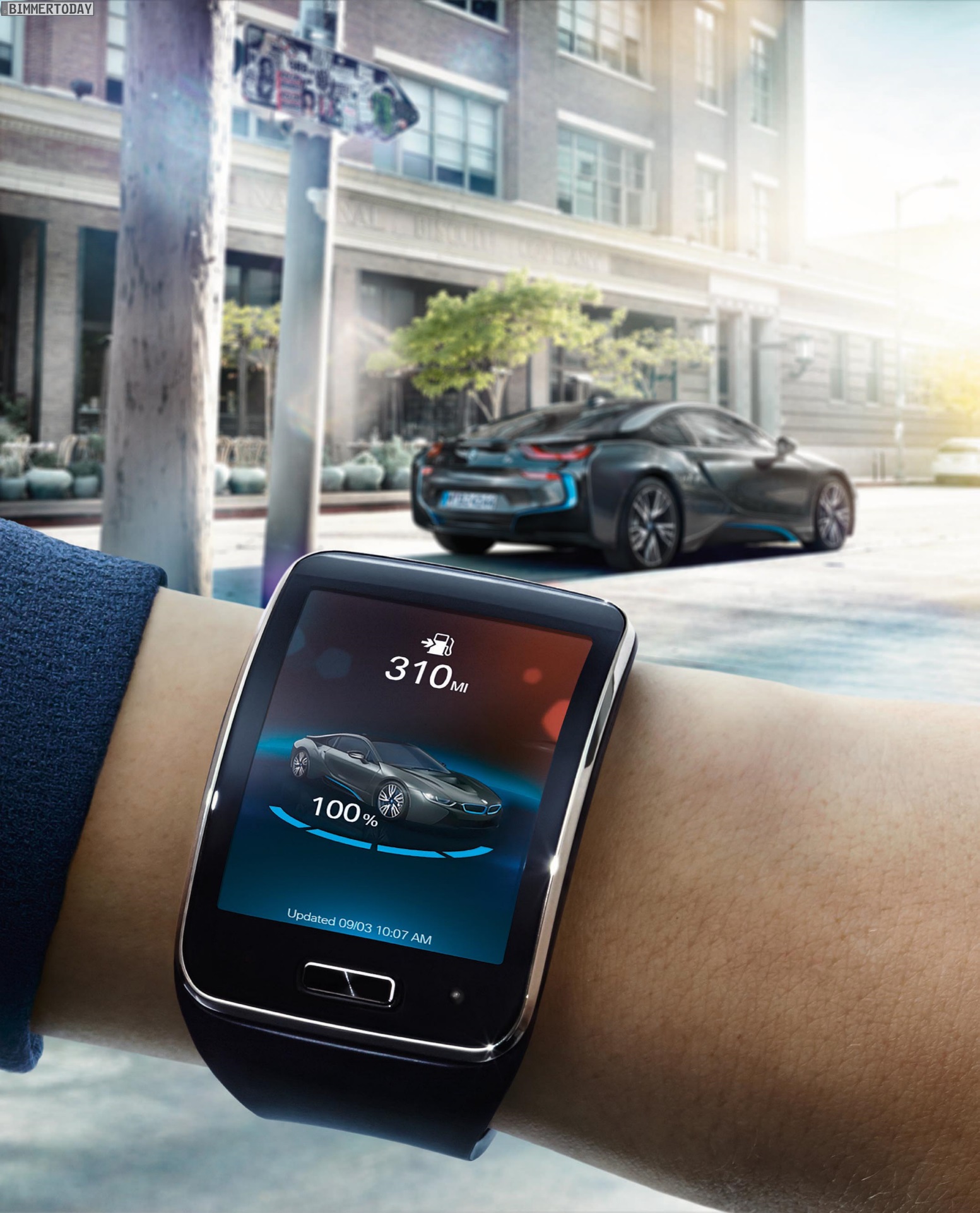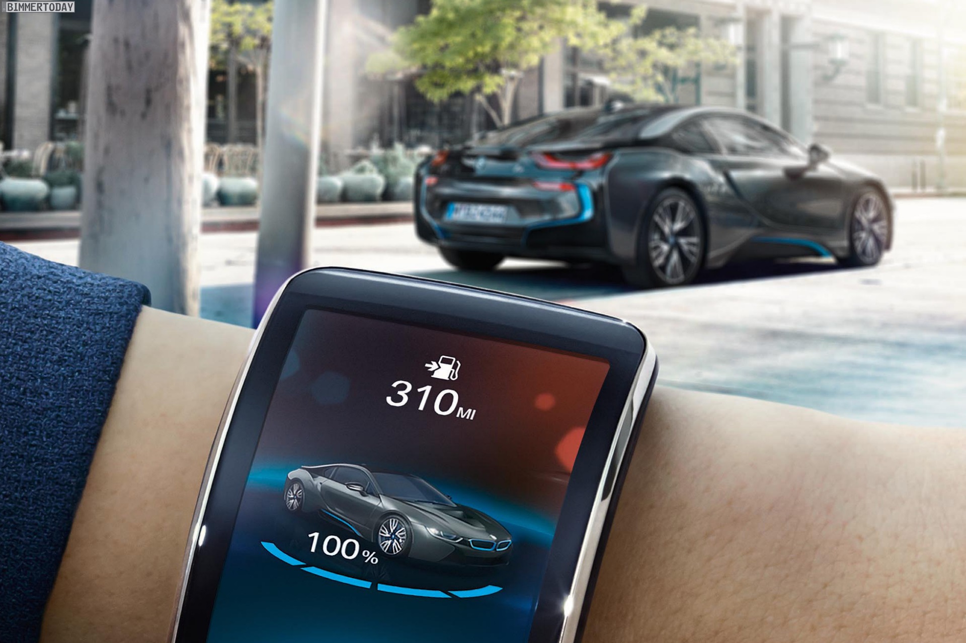 Ähnlich wie bei der App BMW Remote für gewöhnliche BMW-Modelle lässt sich das Auto mit Hilfe der BMW i Remote App bis zu einem gewissen Grad fernsteuern. Unter anderem können die Türen ent- oder verriegelt sowie die Klimatisierung angepasst werden. Im Fall des BMW i3 kommt selbstverständlich eine Information zum Ladezustand der Batterie und der resultierenden Reichweite hinzu. Das 1,63 Zoll kleine Touchscreen-Display am Handgelenk genügt zum Ablesen der wichtigsten Infos und kann natürlich auch zur Eingabe von Befehlen genutzt werden.