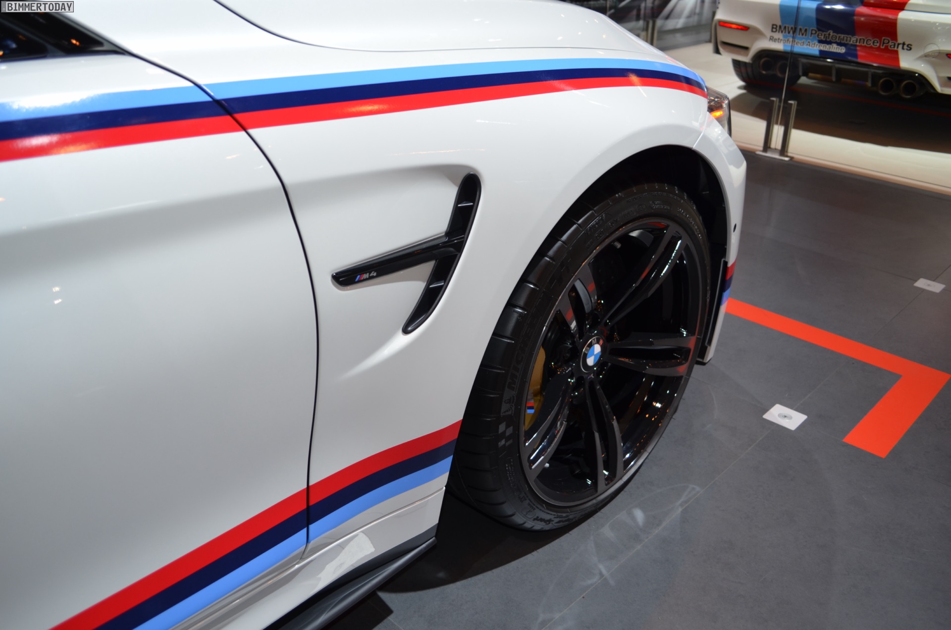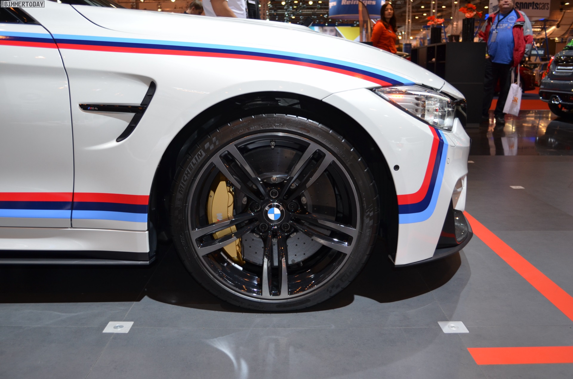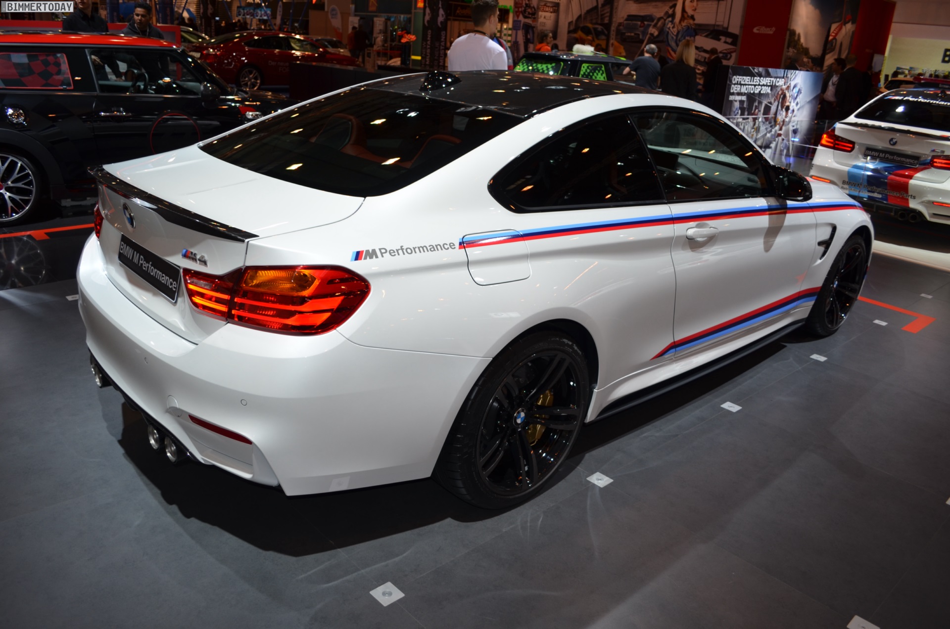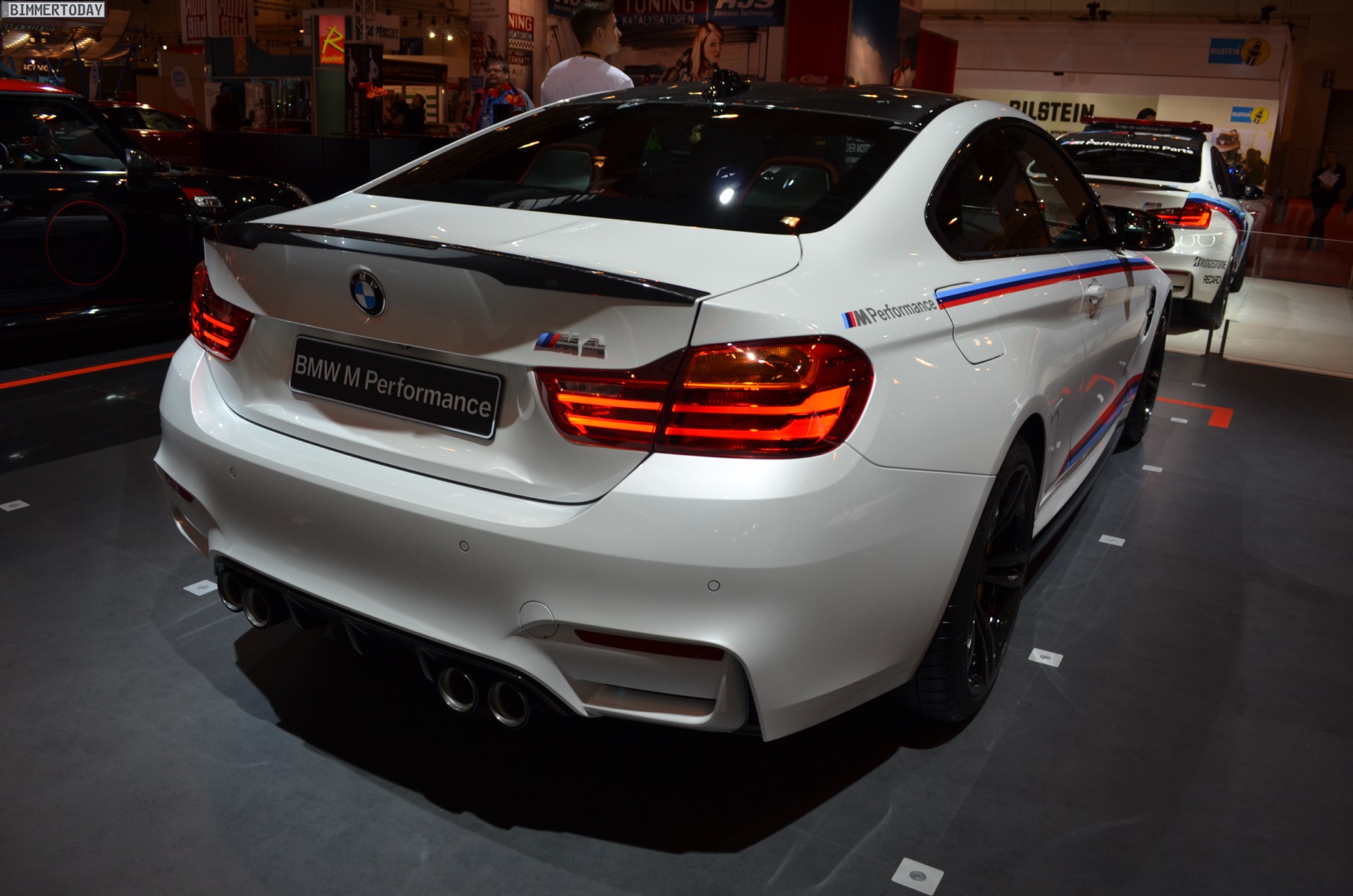 Der BMW M4 F82 mit Tuning-Zubehör von BMW M Performance präsentiert sich in Essen in einer Konfiguration, die unseren Lesern bereits von der Premiere auf der BMW M Night am Nürburgring bekannt sein dürfte – Weiße Lackierung, diverse Elemente in Schwarz oder Sicht-Carbon und natürlich die auffälligen Akzentstreifen in den Farben der BMW M GmbH:
