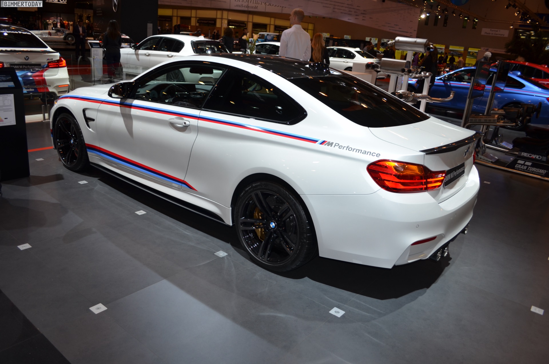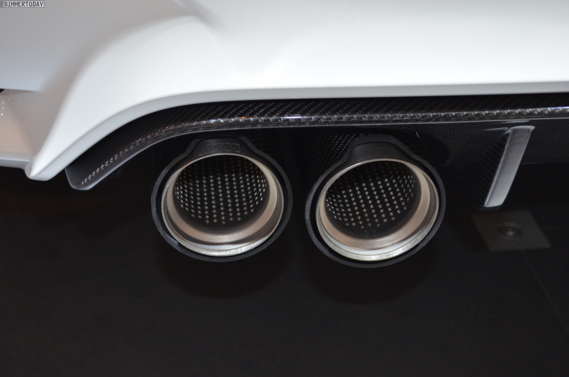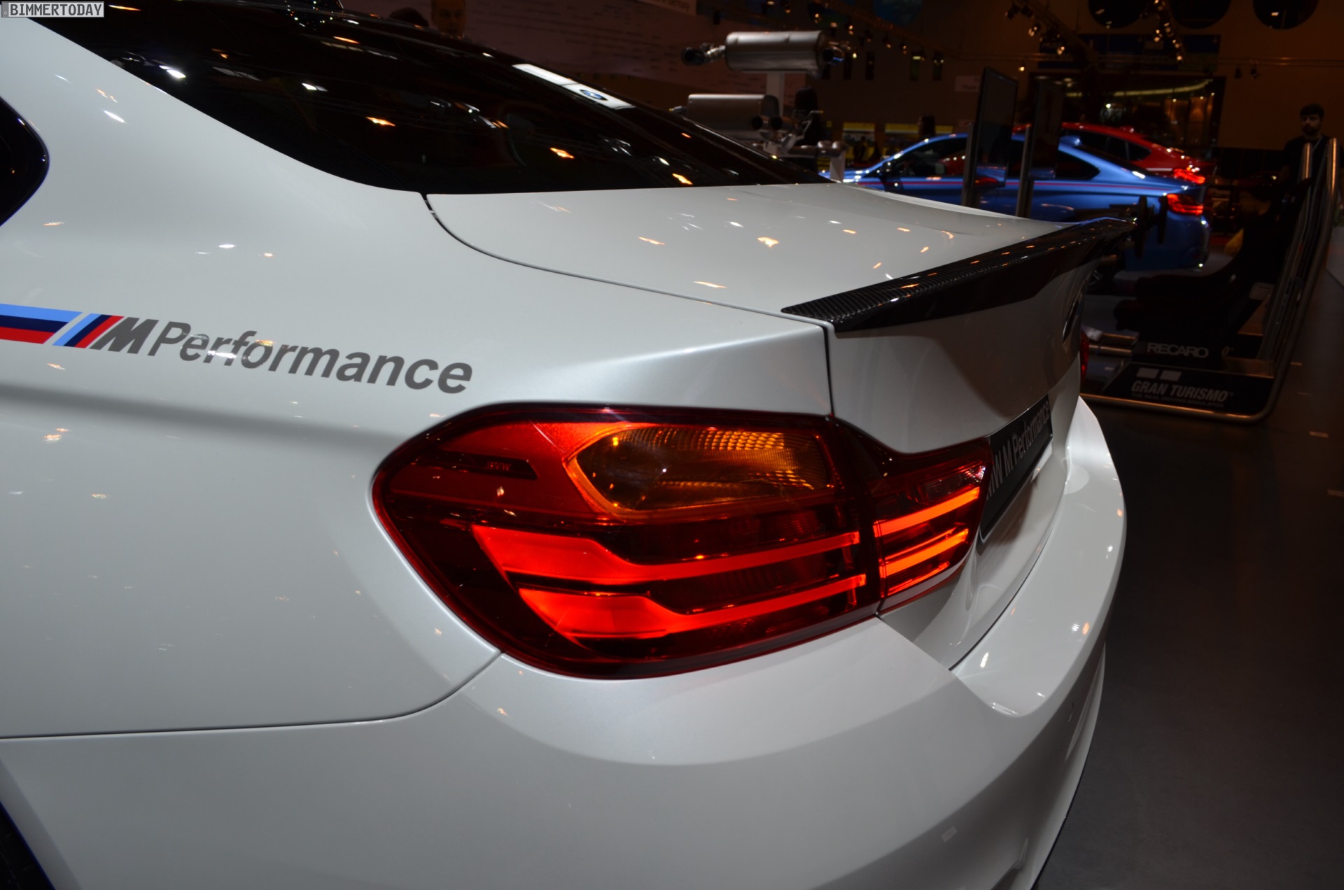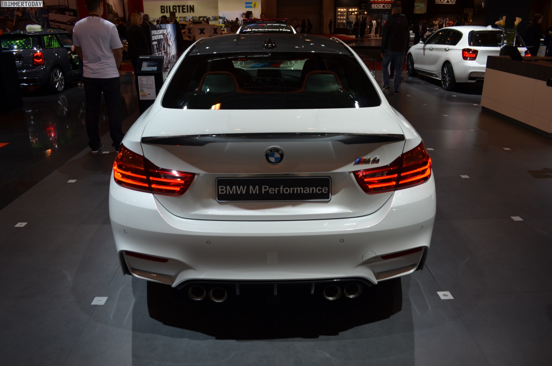 Der BMW M4 F82 mit Tuning-Zubehör von BMW M Performance präsentiert sich in Essen in einer Konfiguration, die unseren Lesern bereits von der Premiere auf der BMW M Night am Nürburgring bekannt sein dürfte – Weiße Lackierung, diverse Elemente in Schwarz oder Sicht-Carbon und natürlich die auffälligen Akzentstreifen in den Farben der BMW M GmbH: