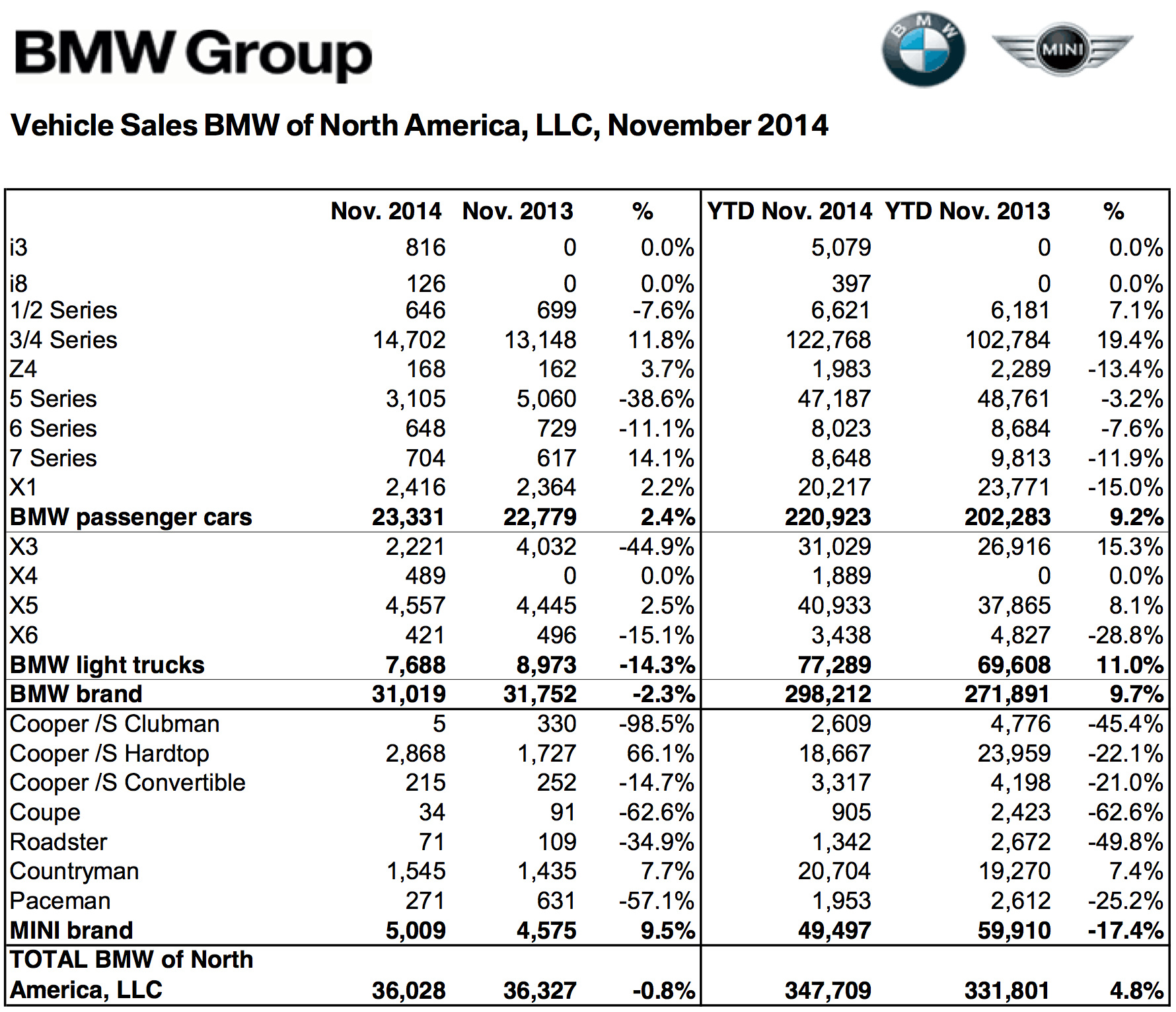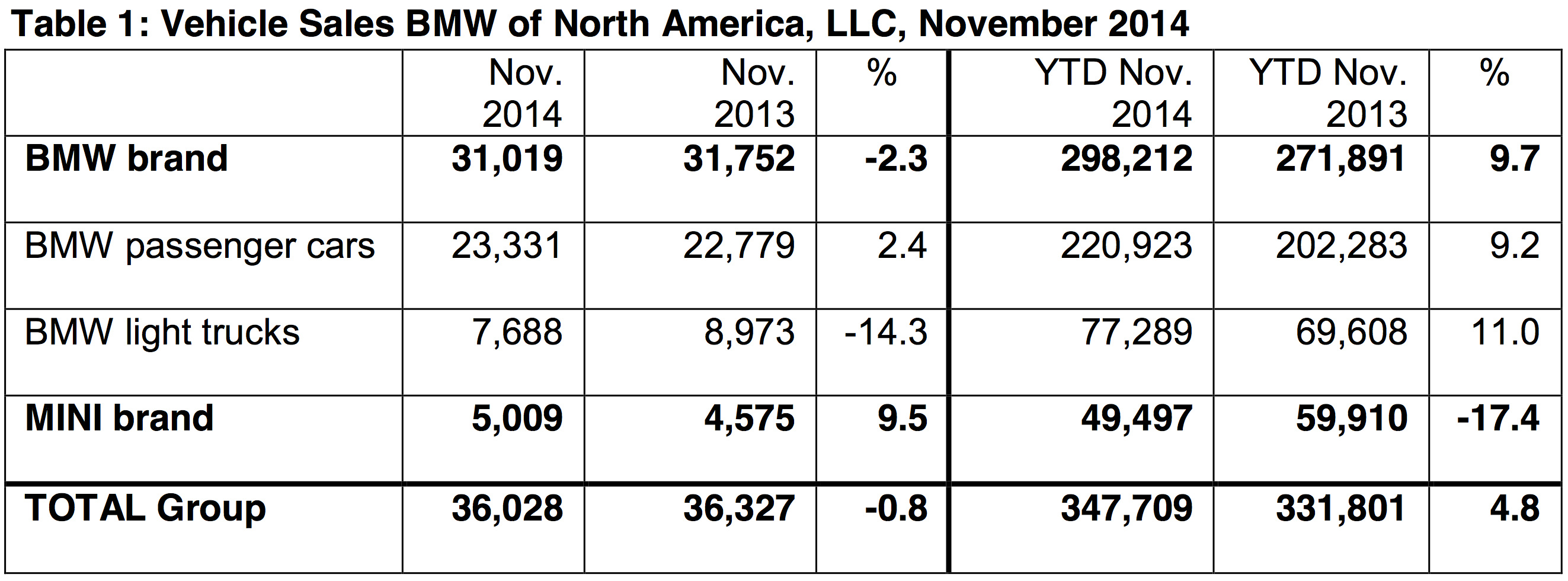Für die ersten elf Monate des Jahres 2014 ergeben sich bei der Kernmarke BMW 298.212 verkaufte Fahrzeuge und eine Steigerung um 9,7 Prozent, dem kann Mercedes im Kampf um die amerikanische Premium-Marktführerschaft 296.382 Einheiten (+6,0%) entgegensetzen. Betrachtet man auch MINI und Smart, führt die BMW Group allerdings mit über 19.000 Einheiten. Audi USA konnte bisher 162.773 Fahrzeuge verkaufen und liegt damit 15,4 Prozent über dem Vorjahreszeitraum.