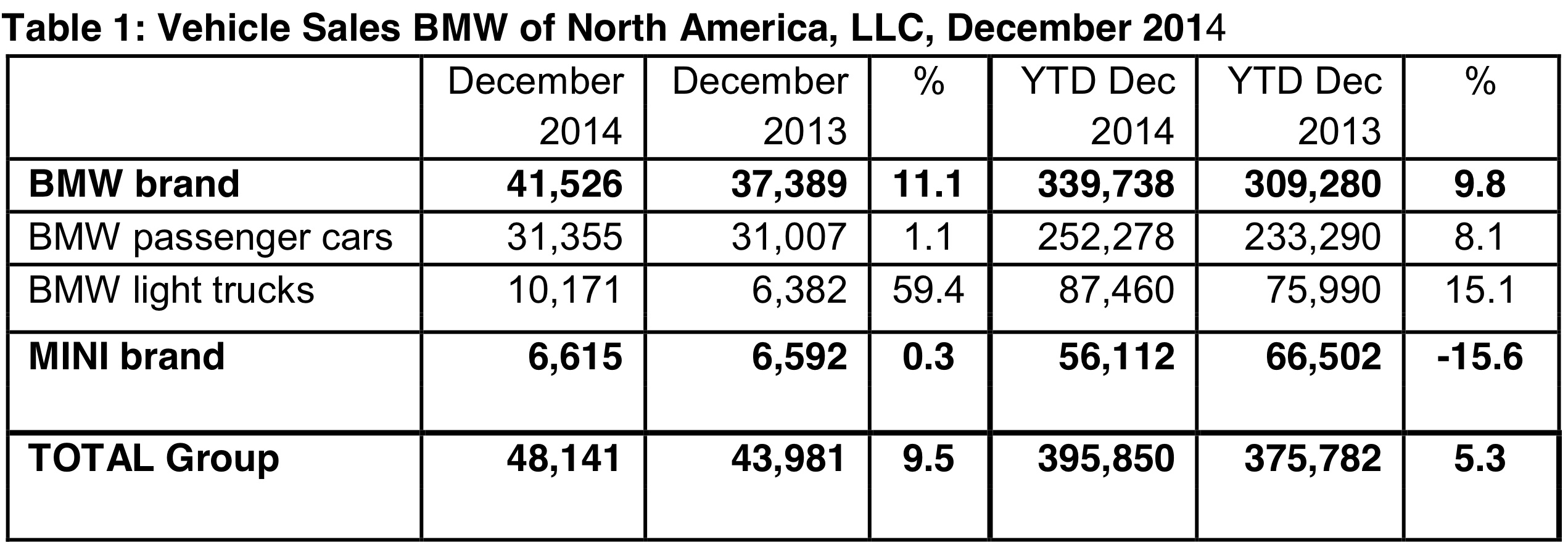 Für das Gesamtjahr 2014 ergeben sich bei der Kernmarke BMW 339.738 verkaufte Fahrzeuge und eine Steigerung um 9,8 Prozent, dem setzt Mercedes-Benz im Kampf um die amerikanische Premium-Marktführerschaft 330.391 Einheiten (+5,7%) entgegen. Betrachtet man auch MINI und Smart, führt die BMW Group mit über 29.000 Einheiten. Audi USA konnte 182.011 Fahrzeuge verkaufen und lag damit 15,2 Prozent über dem Vorjahr, aber klar hinter den Wettbewerbern.