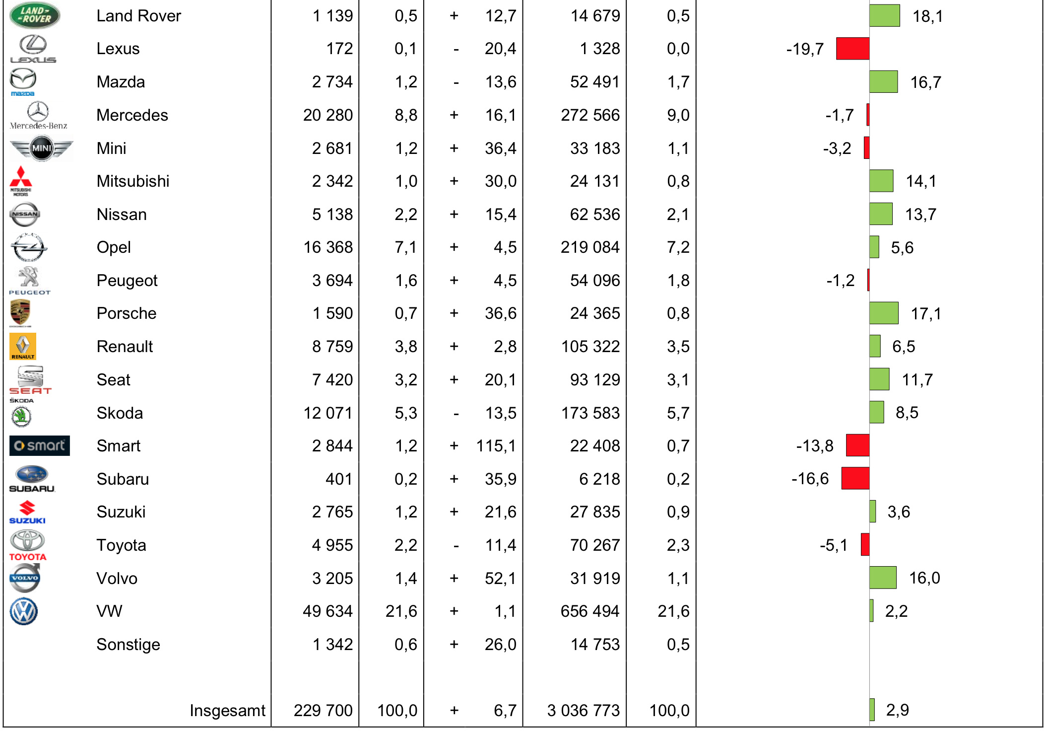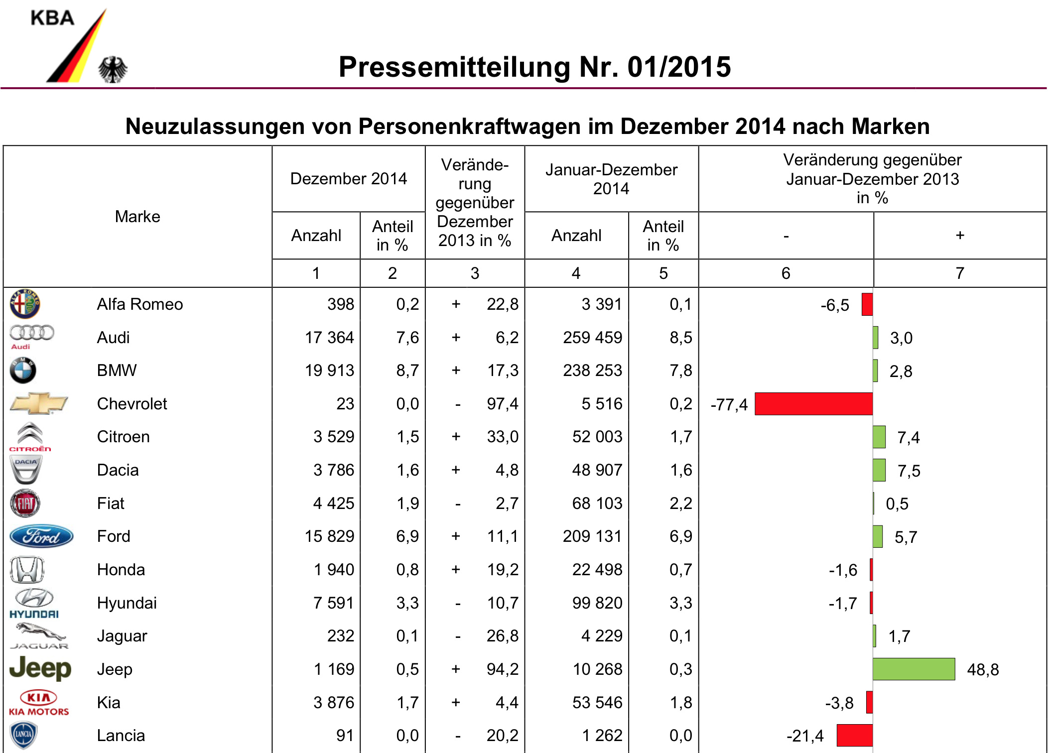 Für das Gesamtjahr 2014 kommt die BMW Group auf einen Absatz von 271.436 Einheiten. Audi wuchs um 3,0 Prozent auf 259.459 verkaufte Fahrzeuge und liegt damit nur knapp unter den Verkaufszahlen von BMW und MINI zusammen. Mercedes (272.566 /-1,7%) und Smart (22.408 / -13,8%) liegen mit zusammen 294.974 verkauften Fahrzeugen klar an der Spitze.