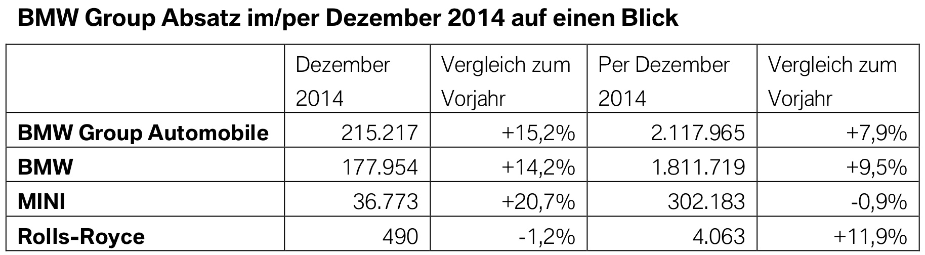 Das vierte Rekordjahr in Folge ist perfekt: Die BMW Group hat ihren Absatz im Gesamtjahr 2014 auf weltweit 2.117.965 Fahrzeuge gesteigert und den Rekord aus dem Vorjahr souverän um 7,9 Prozent übertroffen. Das starke Ergebnis wurde auch mit einer Steigerung um 15,2 Prozent im Dezember 2014 sichergestellt, allein im letzten Monat des Jahres wurden 215.217 Fahrzeuge der Marken BMW und MINI verkauft.