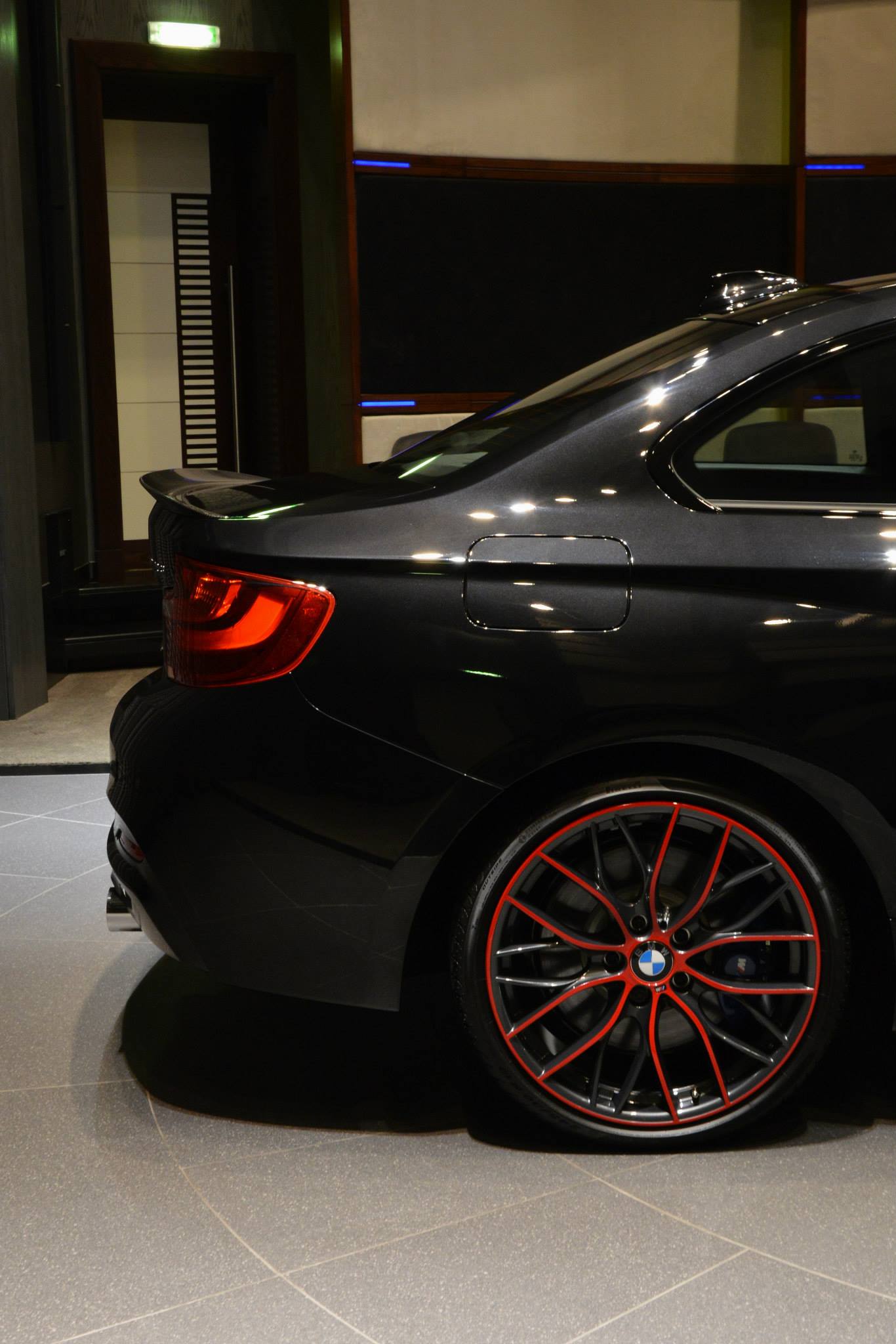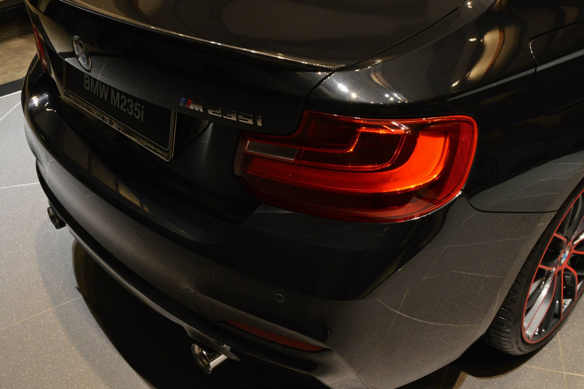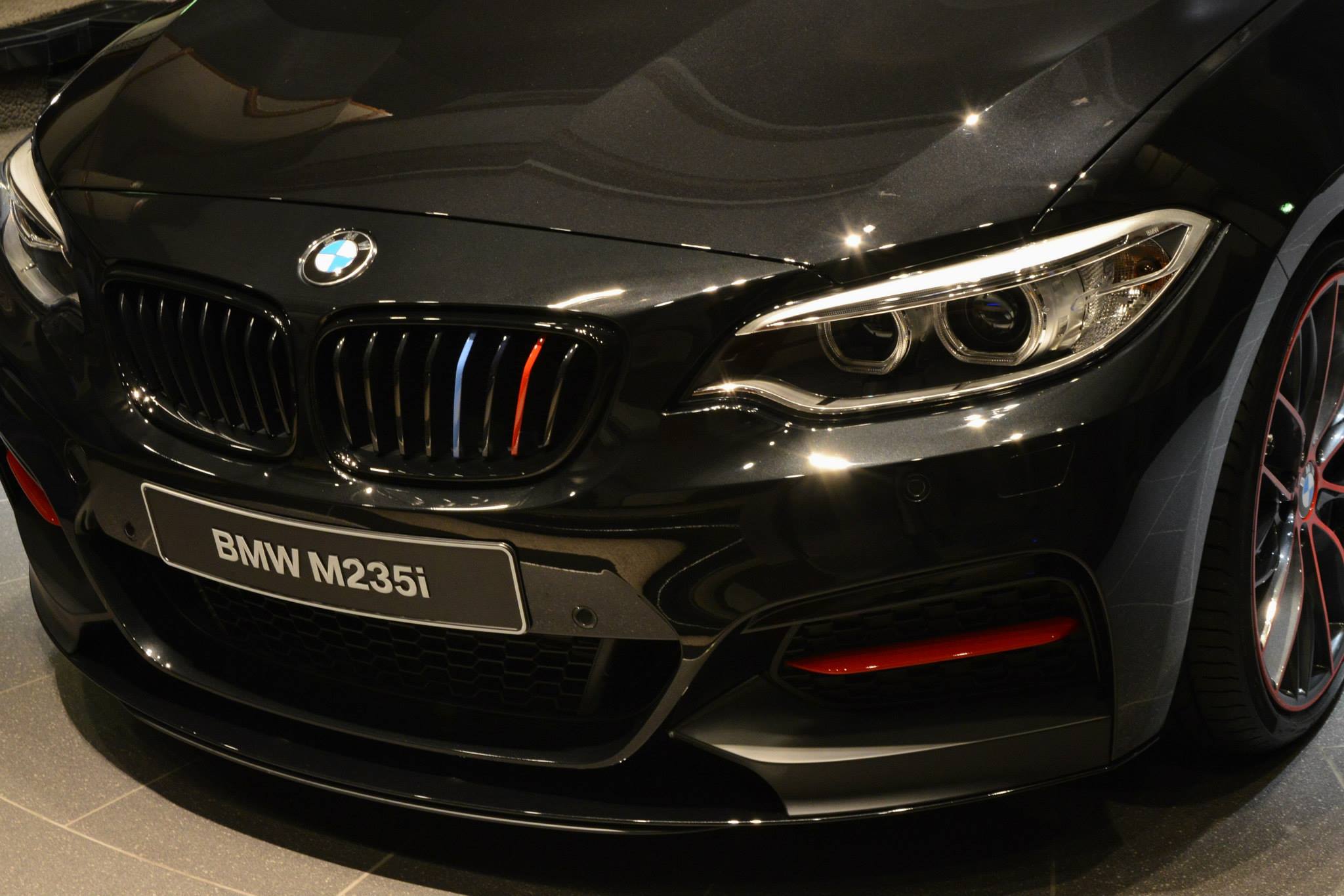 Der scharfe Kontrast von roten Akzenten und dunkler Haupt-Lackierung sticht auch zufälligen Beobachtern sofort ins Auge und unterstreicht den sportlichen Anspruch des M235i. Die Farben der BMW M GmbH auf den Nierenstreben runden das mit vergleichsweise wenig Aufwand realisierte Tuning-Bild ab: