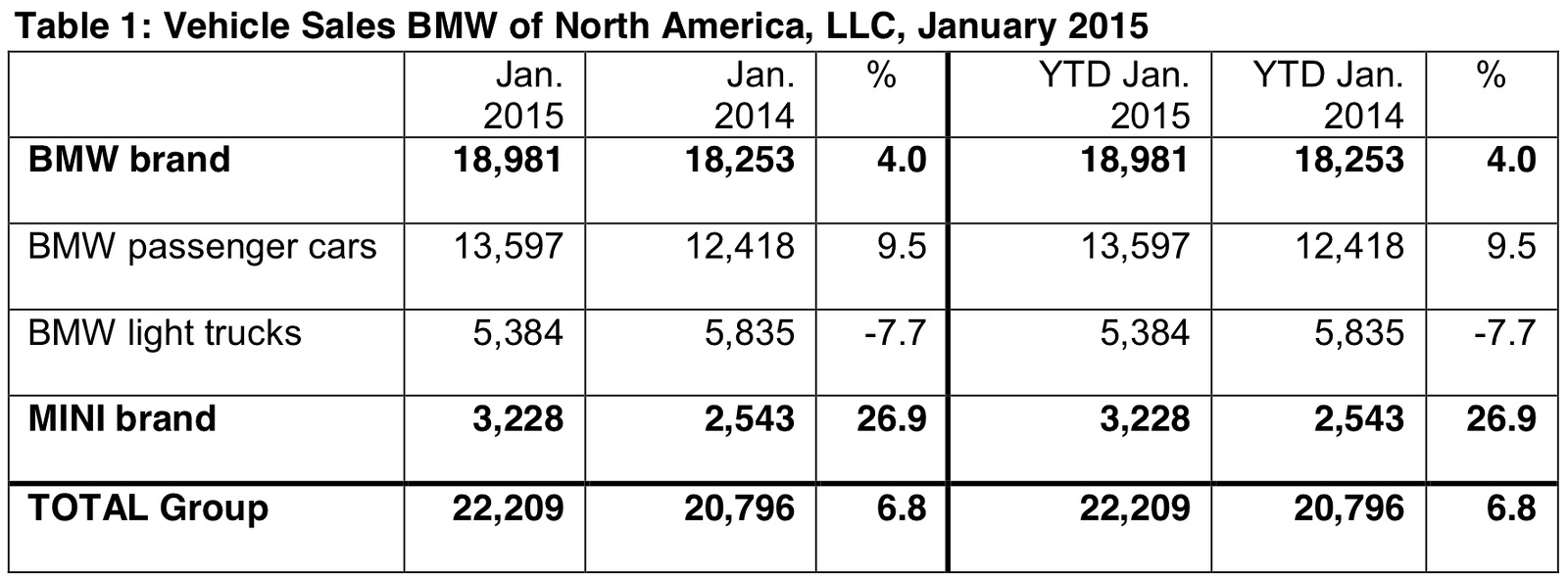 Auch dank des starken Zuwachses bei MINI ergibt sich für die BMW Group insgesamt eine Absatz-Steigerung von 6,8 Prozent im Januar 2015. Gemeinsam kommen die beiden Marken auf einen Absatz von 22.209 Fahrzeugen.