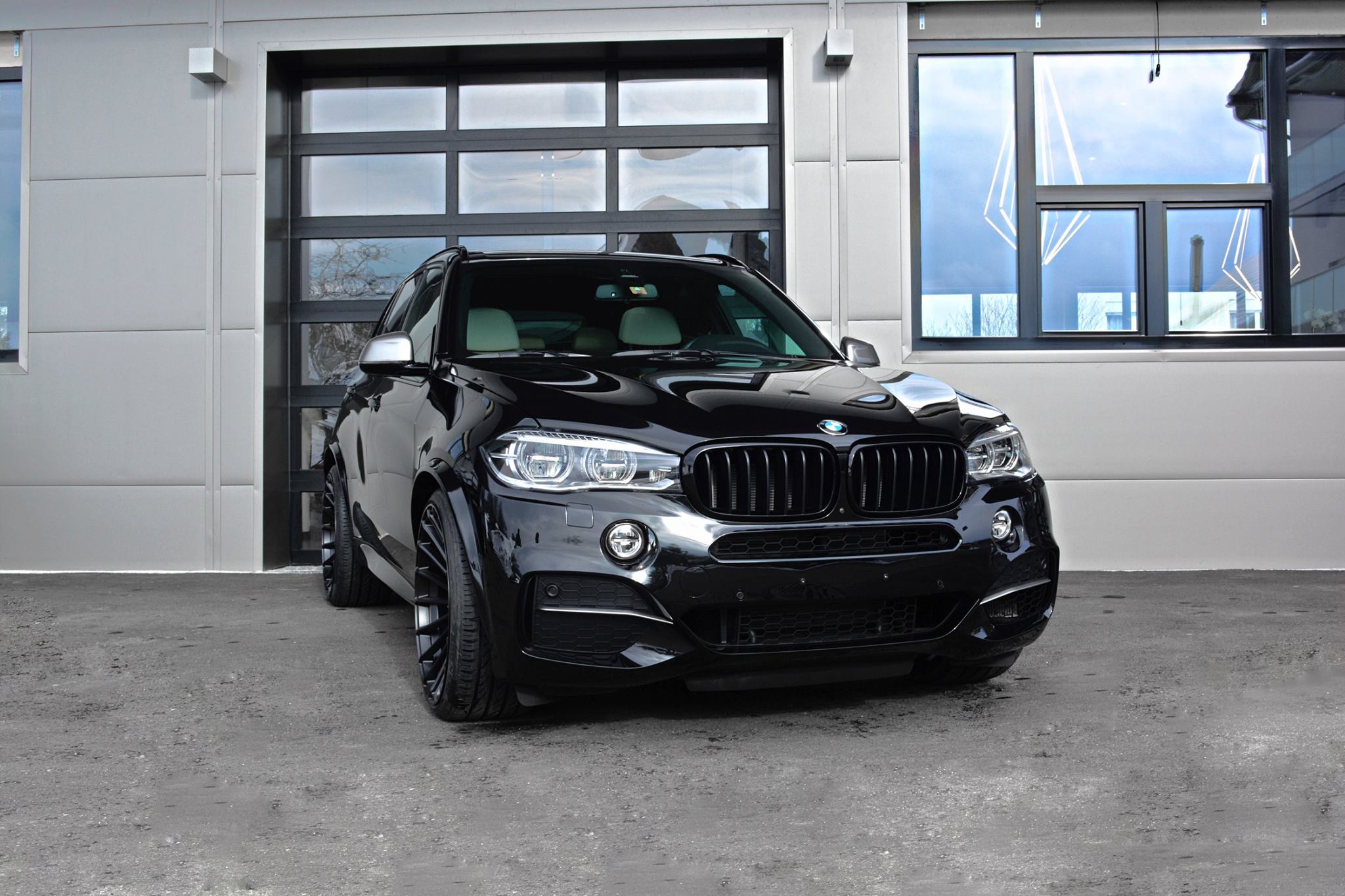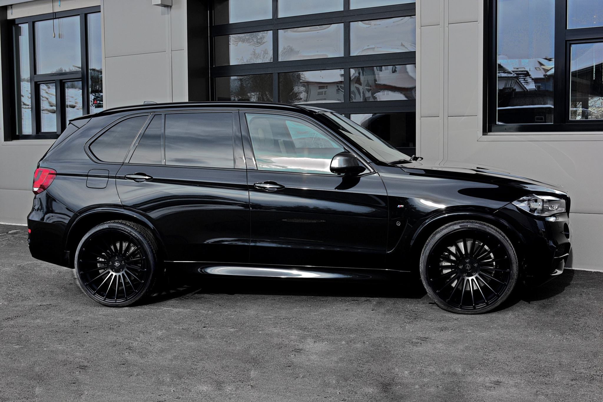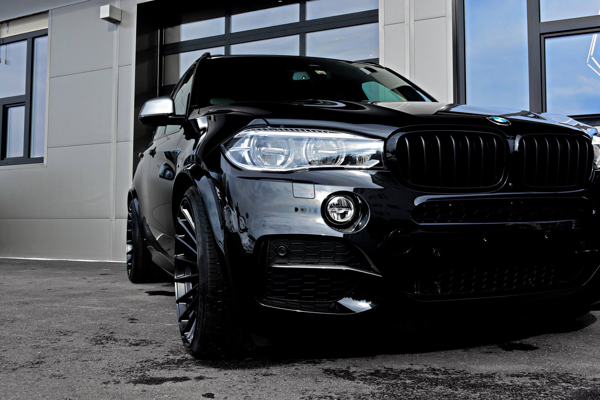 Sieht man von den Außenspiegeln und den dezenten Luftleit-Elementen in den äußeren Lufteinlässen der Frontschürze, die in Ferric Grey gehalten und dem BMW X5 M5od mit Triturbo-Diesel vorbehalten sind, präsentiert sich dieser F15 praktisch durchgehend schwarz. Für eine weitere Abgrenzung von der Serie und einen sportlichen Touch sorgen die Tuning-Elemente von Hamann Motorsport, wobei vor allem die riesigen Felgen ins Auge stechen: