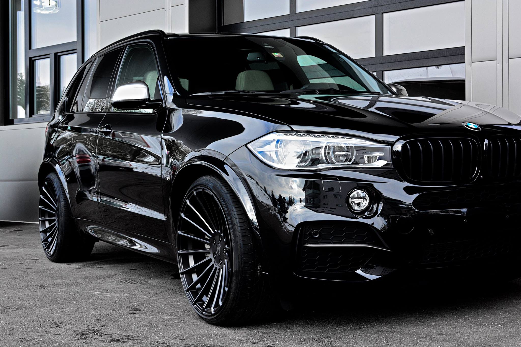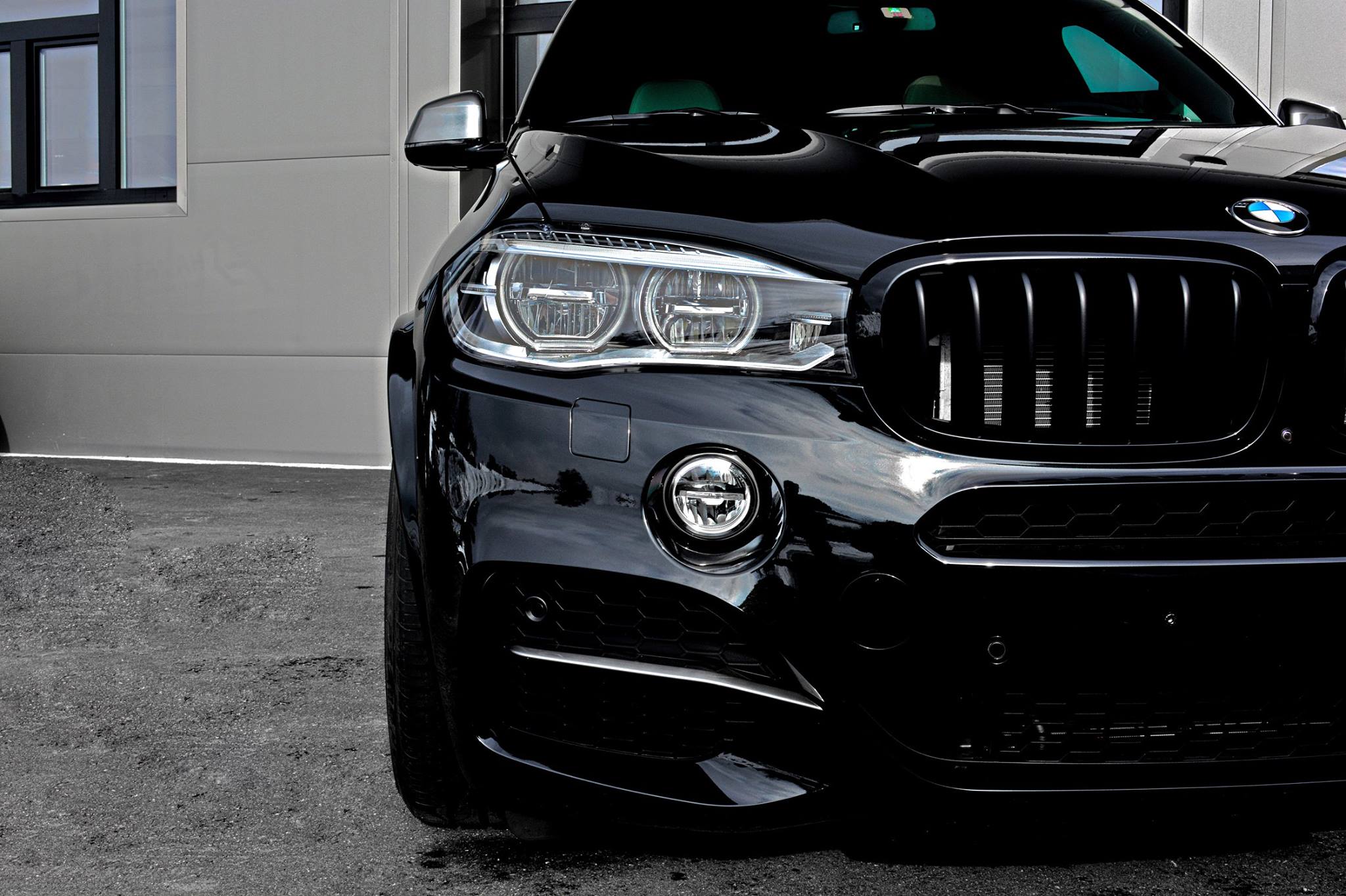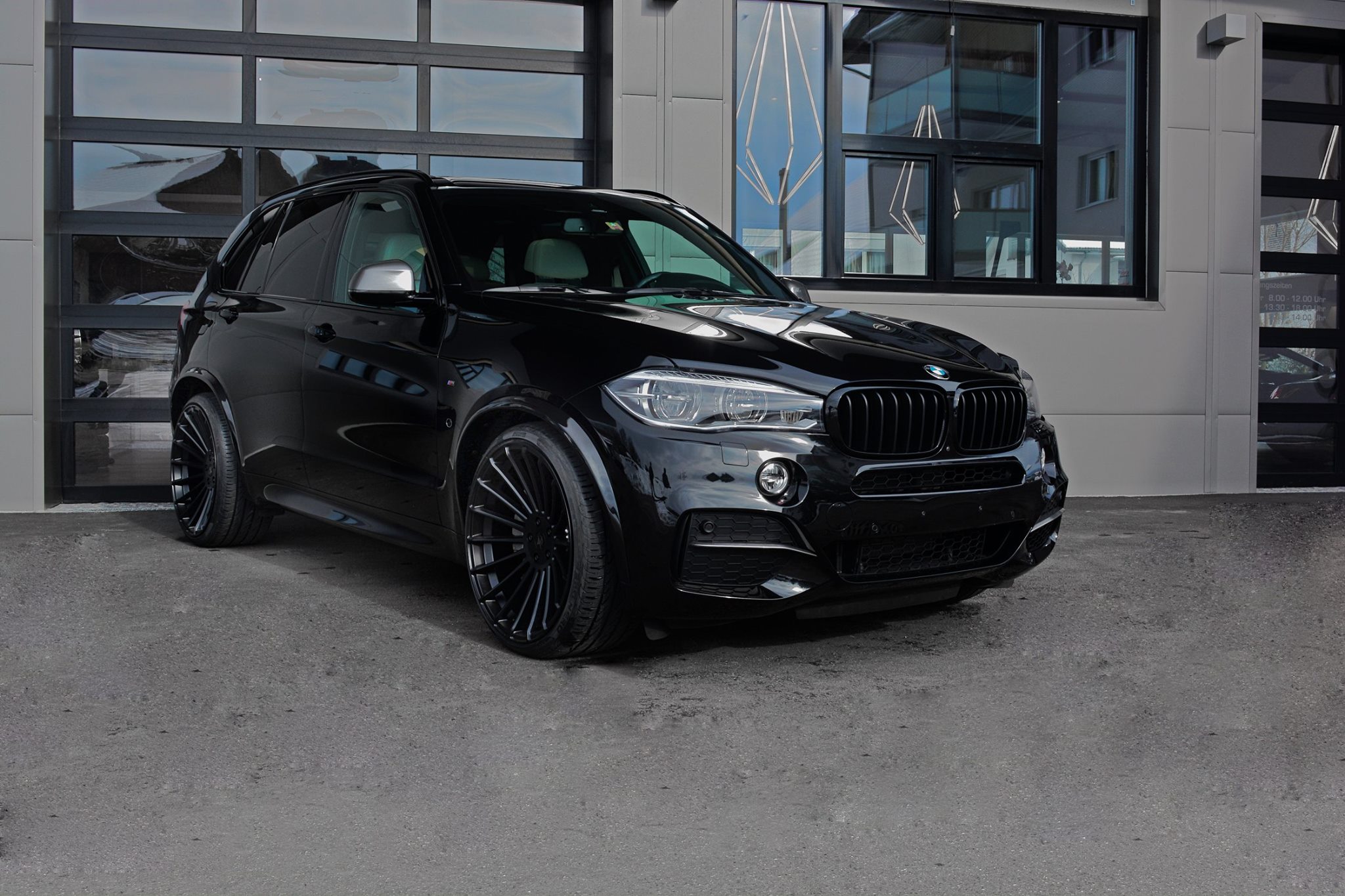 Sieht man von den Außenspiegeln und den dezenten Luftleit-Elementen in den äußeren Lufteinlässen der Frontschürze, die in Ferric Grey gehalten und dem BMW X5 M5od mit Triturbo-Diesel vorbehalten sind, präsentiert sich dieser F15 praktisch durchgehend schwarz. Für eine weitere Abgrenzung von der Serie und einen sportlichen Touch sorgen die Tuning-Elemente von Hamann Motorsport, wobei vor allem die riesigen Felgen ins Auge stechen: