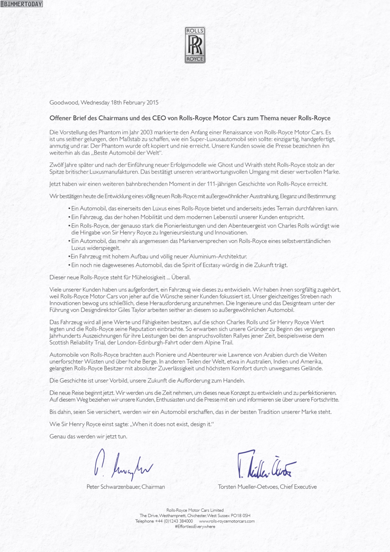 Die seit langem kolportierten Pläne für ein Rolls-Royce SUV werden heute mit einem offenen Brief von Peter Schwarzenbauer und Torsten Müller-Ötvös offiziell bestätigt. Der Chairman und der CEO von Rolls-Royce Motor Cars äußern sich dabei gleichermaßen ausführlich wie unmissverständlich zu den Plänen für ein “Automobil, das einerseits den Luxus eines Rolls-Royce bietet und anderseits jedes Terrain durchfahren kann.”