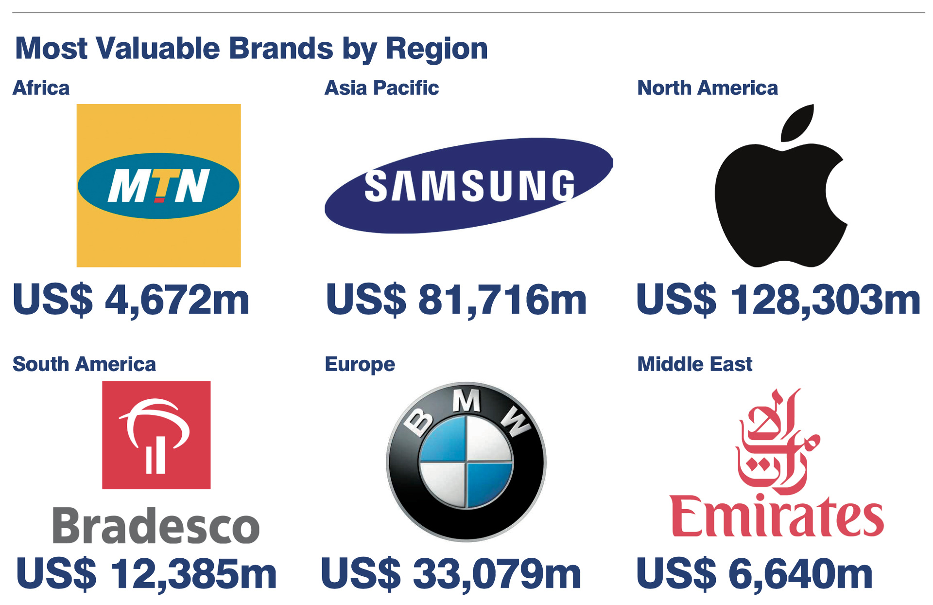 Regional betrachtet ist BMW die wertvollste Marke Europas, sämtliche noch wertvoller eingeschätzten Marken kommen aus Nordamerika oder Asien. Knapp hinter BMW folgen die Telekom, Volkswagen, Shell und Mercedes auf den weiteren Rängen des Europa-Rankings.