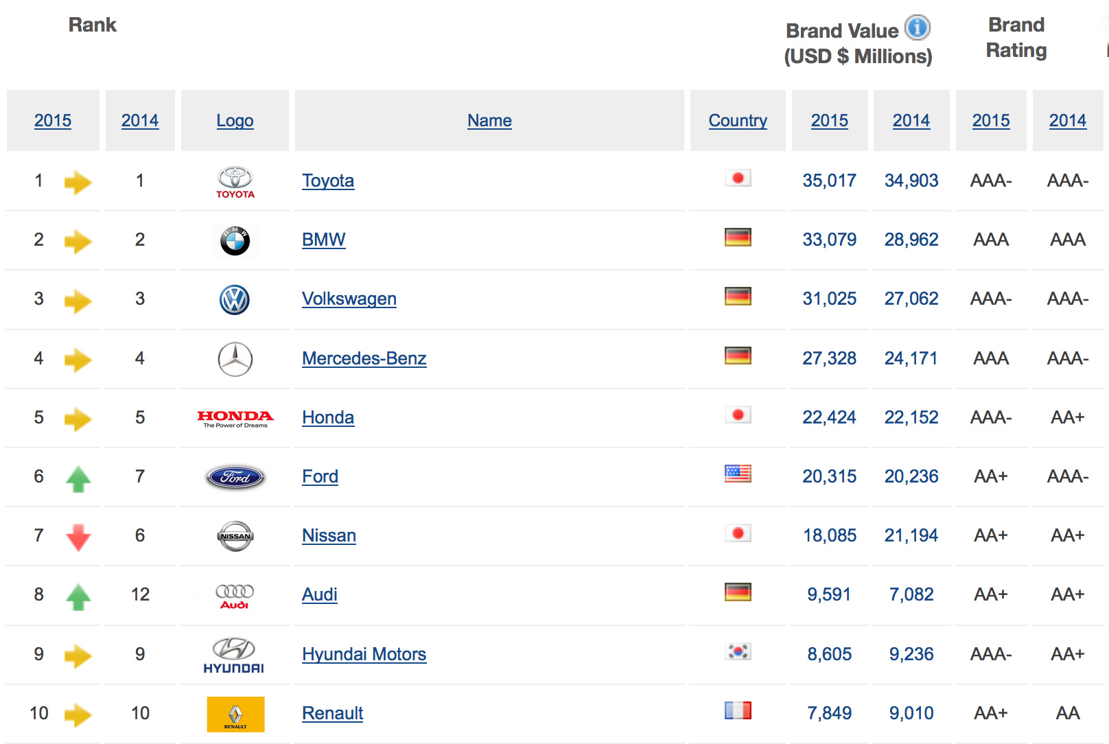 Auch auf den Rängen 3 und 4 der Autobauer-Top 10 folgen mit Volkswagen und Mercedes Hersteller aus Deutschland, Audi liegt mit deutlichem Abstand auf dem 8. Rang. Die Ingolstädter VW-Tochter befindet sich damit zwar noch hinter Nissan, holt aber mit großen Schritten auf und konnte sich gegenüber dem Vorjahr um 4 Positionen verbessern.