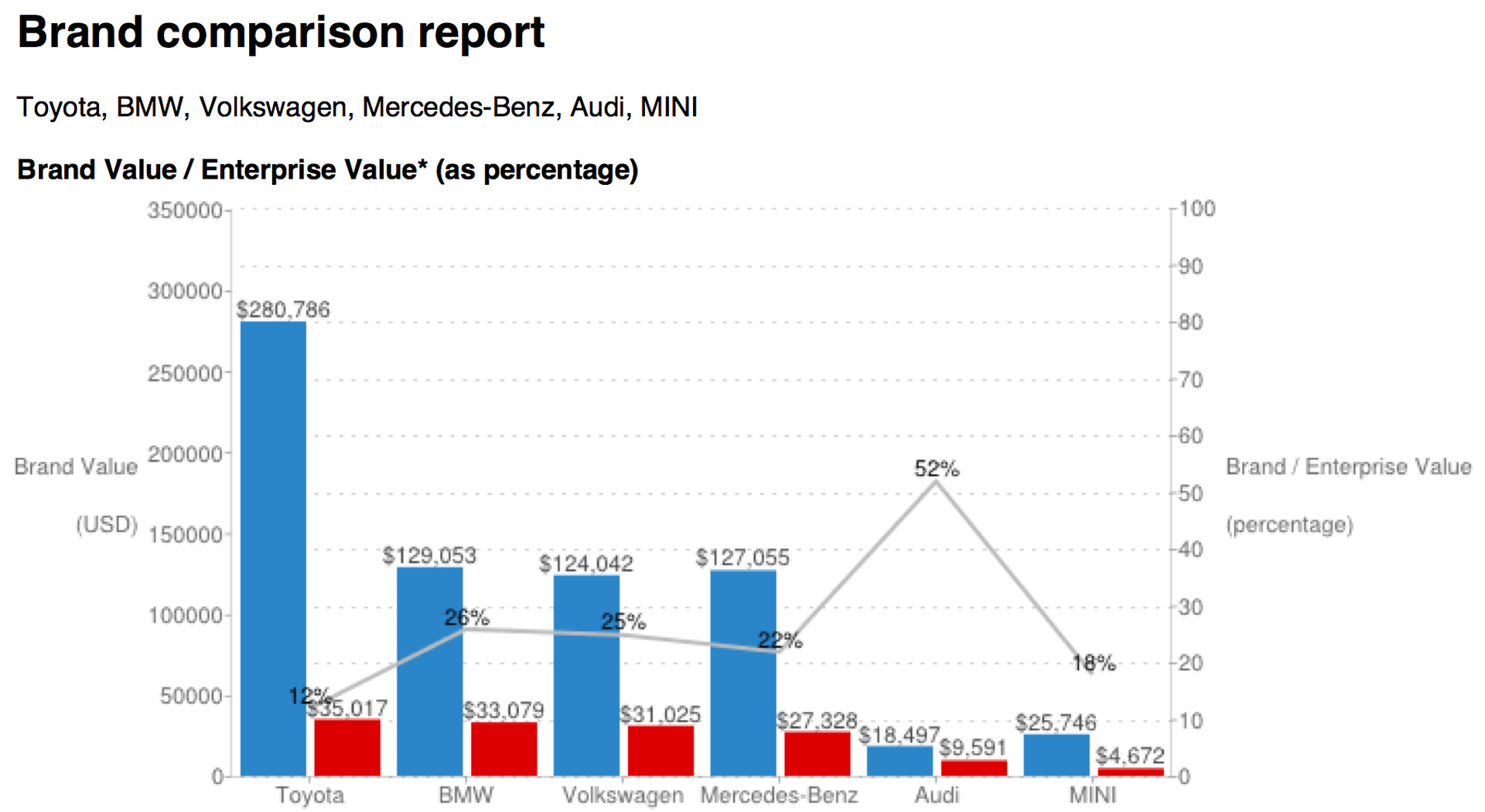 Betrachtet man lediglich die Autobauer, befindet sich der weltweite Absatz-Spitzenreiter Toyota mit einem Wert von 35 Milliarden US-Dollar auch beim Markenwert an der Spitze. Auf dem zweiten Rang folgt der weltweit erfolgreichste Anbieter von Premium-Automobilen, der Wert der Marke BMW wird im aktuellen Ranking auf 33 Milliarden US-Dollar geschätzt.
