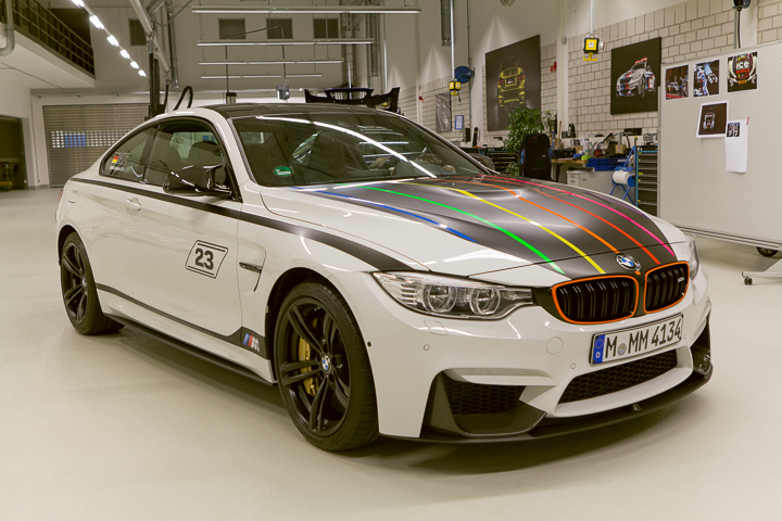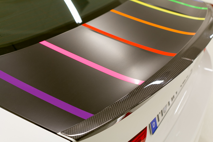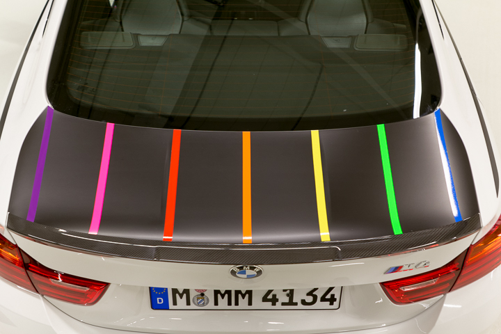 Die auffällige Sonderedition ist überwiegend weiß lackiert, wie beim BMW M4 DTM-Rennwagen von Marco Wittmann spielen aber auch Schwarz und die Farben von Sponsor Ice Watch eine wichtige Rolle: Kofferraum- und Motorhaube sind mattschwarz lackiert, bunte Streifen weisen auf das farbenfrohe Angebot des Uhrenherstellers hin.