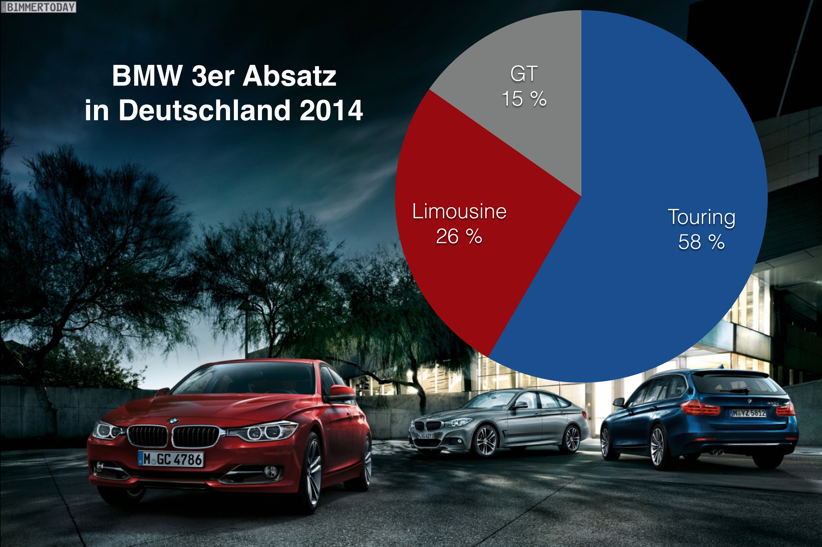 Der Anteil der klassischen BMW 3er Limousine fällt mit 26 Prozent noch deutlich höher aus. Die weltweit nach wie vor mit Abstand wichtigste Karosserievariante muss sich damit in Deutschland klar dem BMW 3er Touring geschlagen geben, denn der bei Privat- und Firmenkunden gleichermaßen beliebte Kombi steht 2014 für mehr als die Hälfte aller in Deutschland verkauften 3er-BMW.