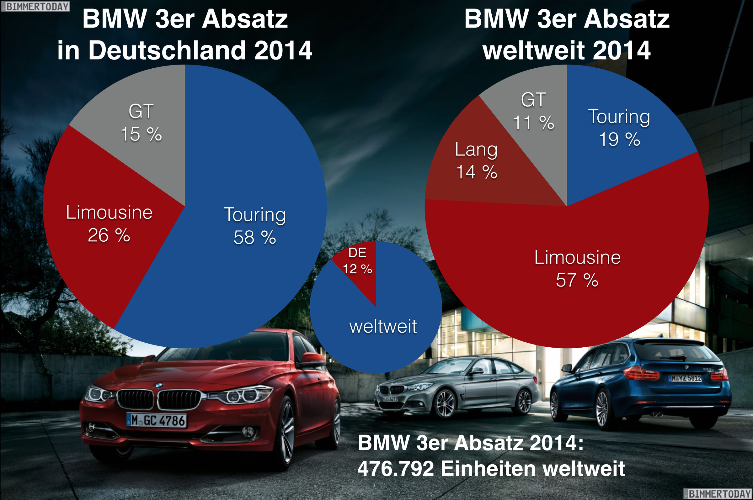 Rechnet man die Langversion hinzu, kommen die Stufenheck-Varianten der BMW 3er-Reihe auf einen gemeinsamen Anteil von beachtlichen 71 Prozent. Der in Deutschland dominierende BMW 3er Touring steht weltweit für 19 Prozent des Absatzes. Abgerundet wird die 3er-Familie seit 2013 vom Gran Turismo, der 2014 weltweit 50.430 Kunden überzeugt und seinen Platz innerhalb der Münchner Mittelklasse gefunden hat.