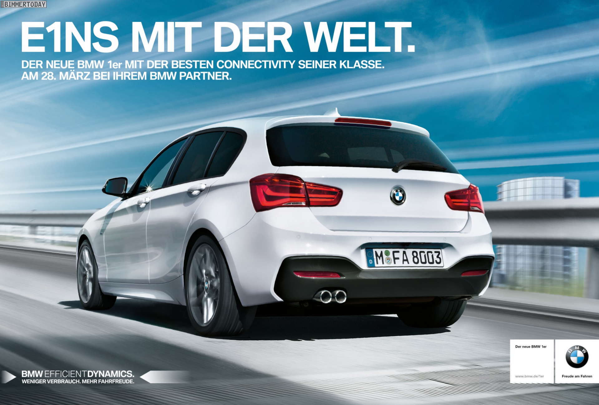 Unter dem Motto E1NS MIT DER WELT startet die offizielle Werbe-Kampagne zum BMW 1er Facelift 2015. Die ersten zwei Motive zeigen den gründlich überarbeiteten 1er als weißen Fünftürer (F20 LCI) mit M Sportpaket, in identischer Konfiguration war die Modellpflege auch auf den offiziellen Fotos zum Facelift und den Wallpaper-Motiven zu sehen.