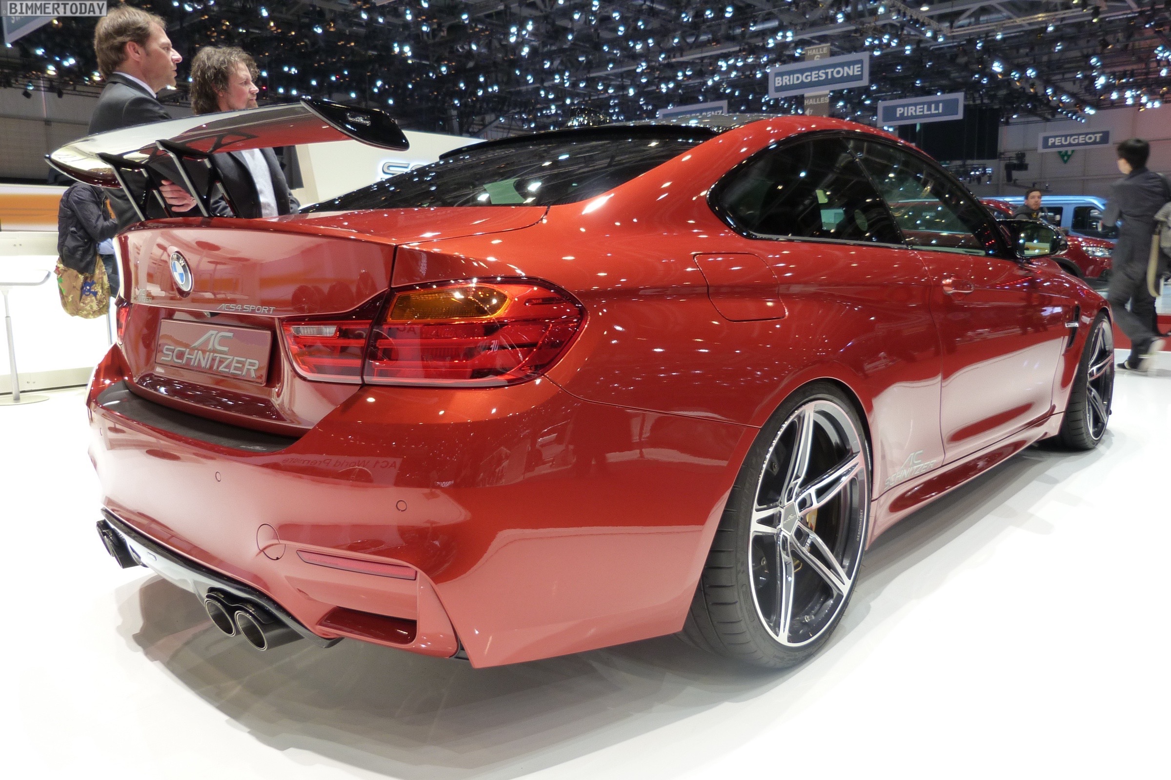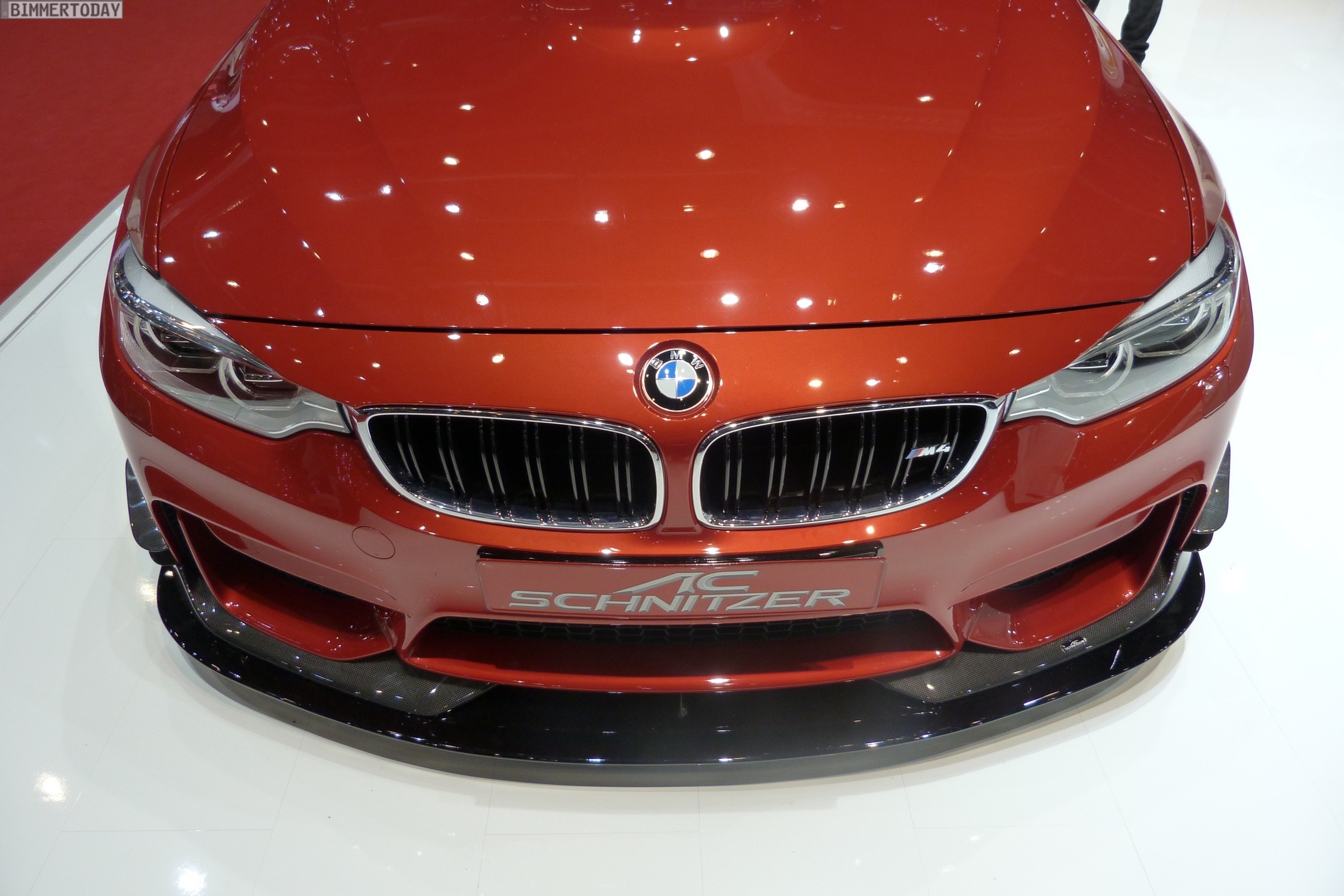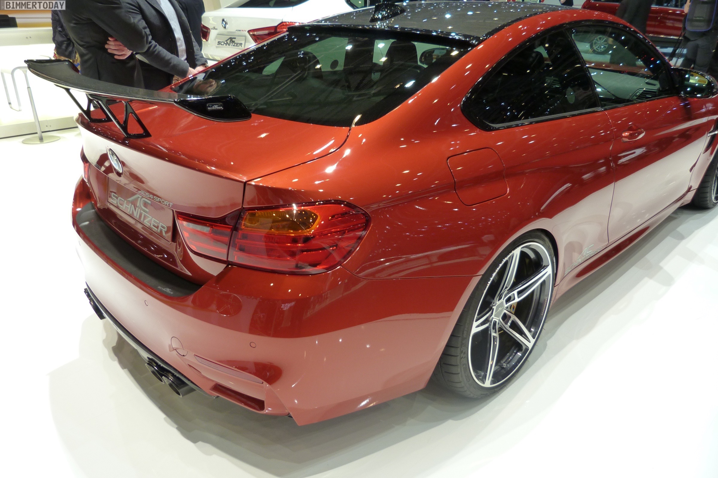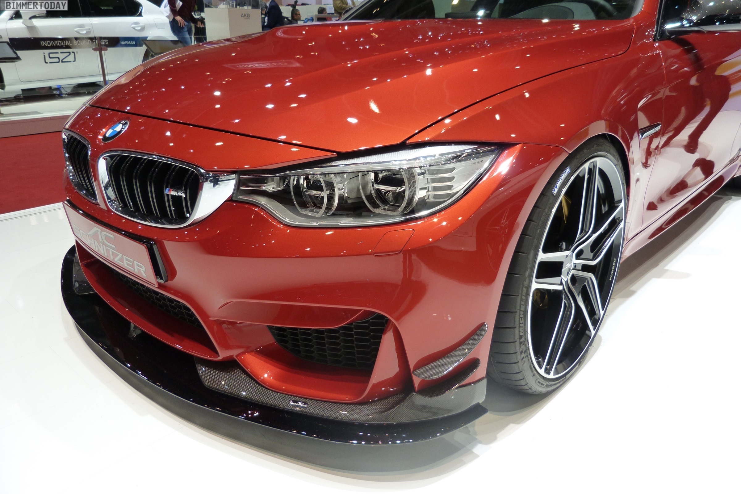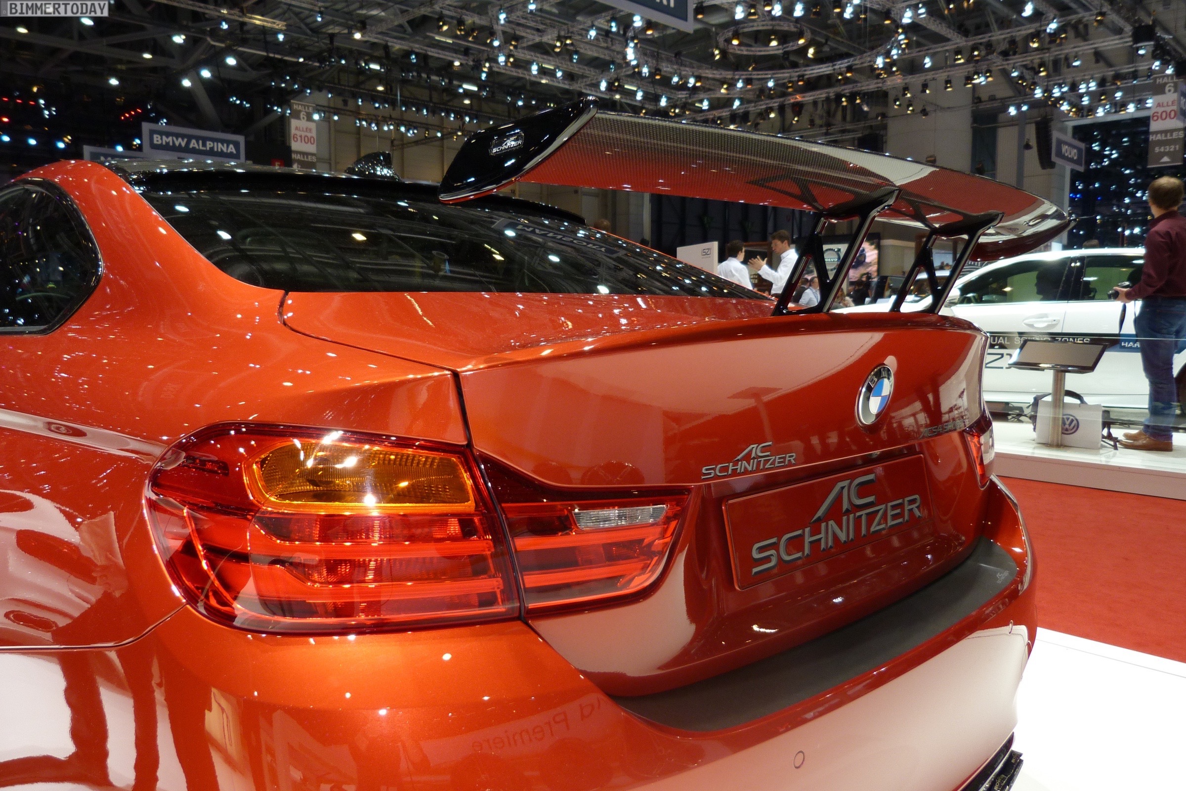 Einen besonders sportlichen Hingucker in Sakhir Orange präsentiert AC Schnitzer auf dem Genfer Autosalon 2015. Das BMW M4 Coupé mit zahlreichen Tuning-Komponenten aus Aachen präsentiert sich aus jeder Perspektive im Rennsport-Look und erinnert mit Frontsplitter, Flaps und großem Heckflügel eher an eine Motorsport-Variante als an ein Serienfahrzeug. Die auffälligen Bauteile dienen nicht nur der Optik, sondern sorgen auch für spürbar mehr Anpressdruck an Vorder- und Hinterachse.