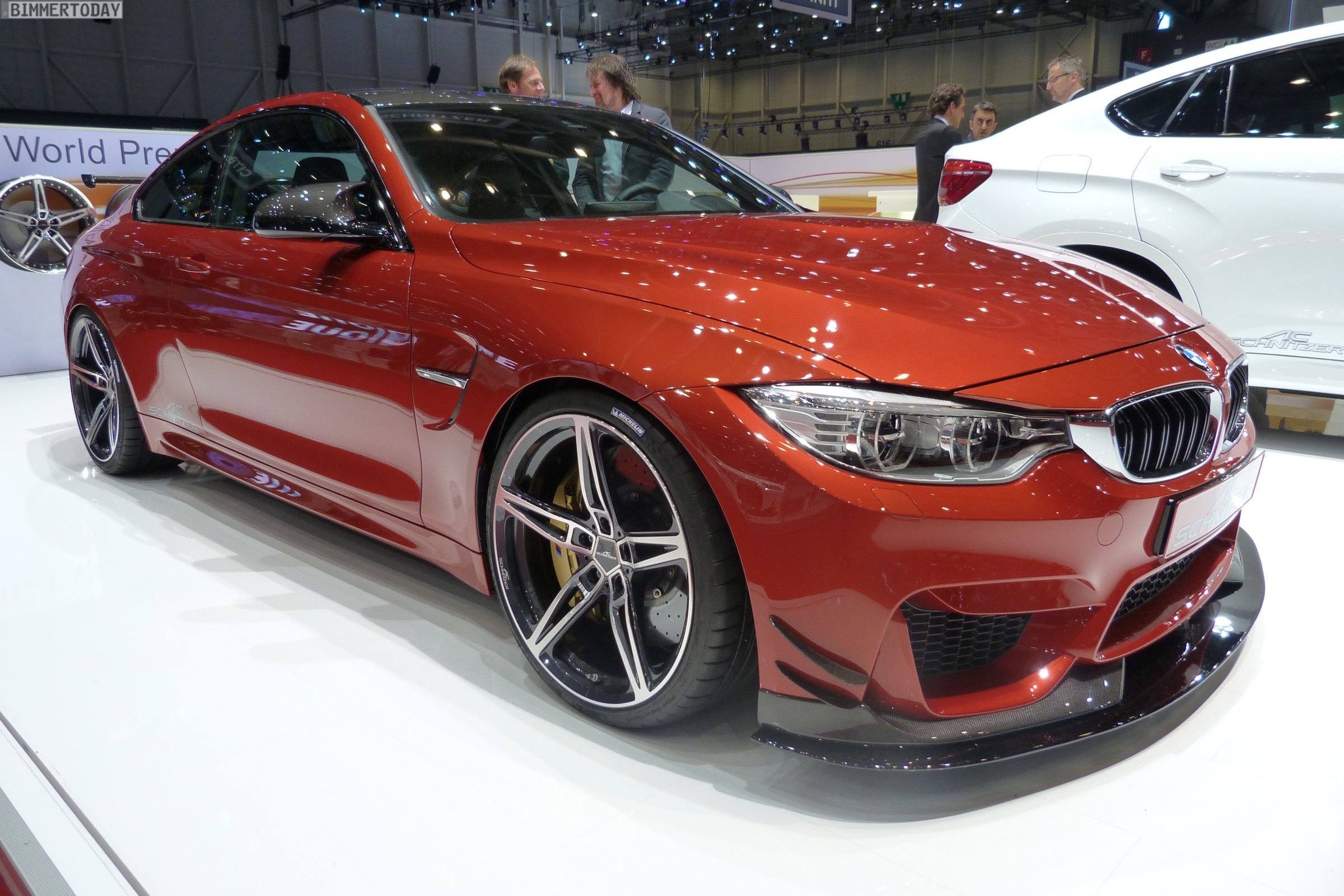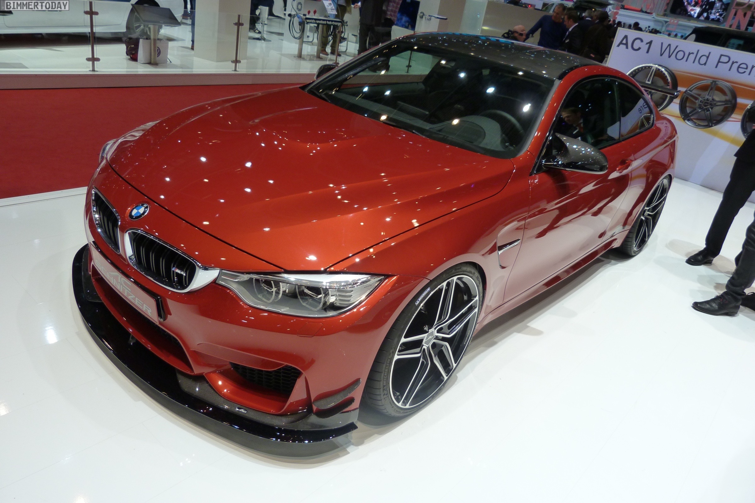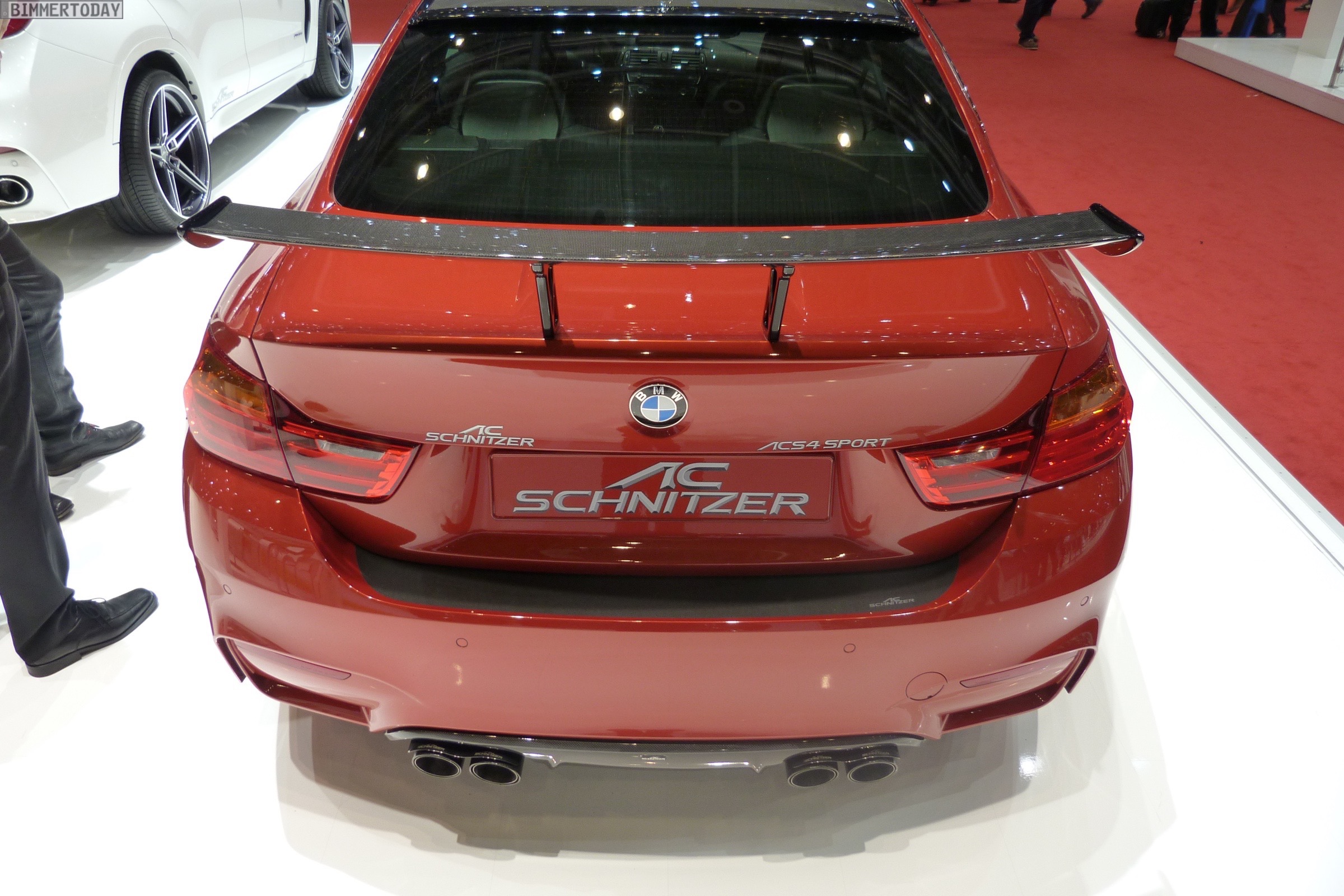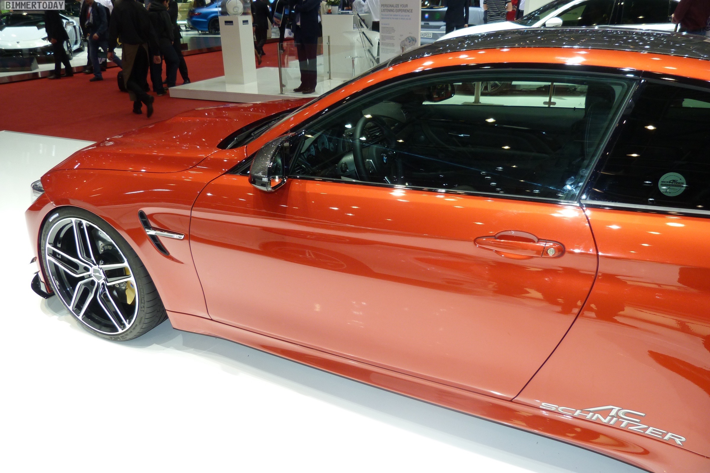 Einen besonders sportlichen Hingucker in Sakhir Orange präsentiert AC Schnitzer auf dem Genfer Autosalon 2015. Das BMW M4 Coupé mit zahlreichen Tuning-Komponenten aus Aachen präsentiert sich aus jeder Perspektive im Rennsport-Look und erinnert mit Frontsplitter, Flaps und großem Heckflügel eher an eine Motorsport-Variante als an ein Serienfahrzeug. Die auffälligen Bauteile dienen nicht nur der Optik, sondern sorgen auch für spürbar mehr Anpressdruck an Vorder- und Hinterachse.
