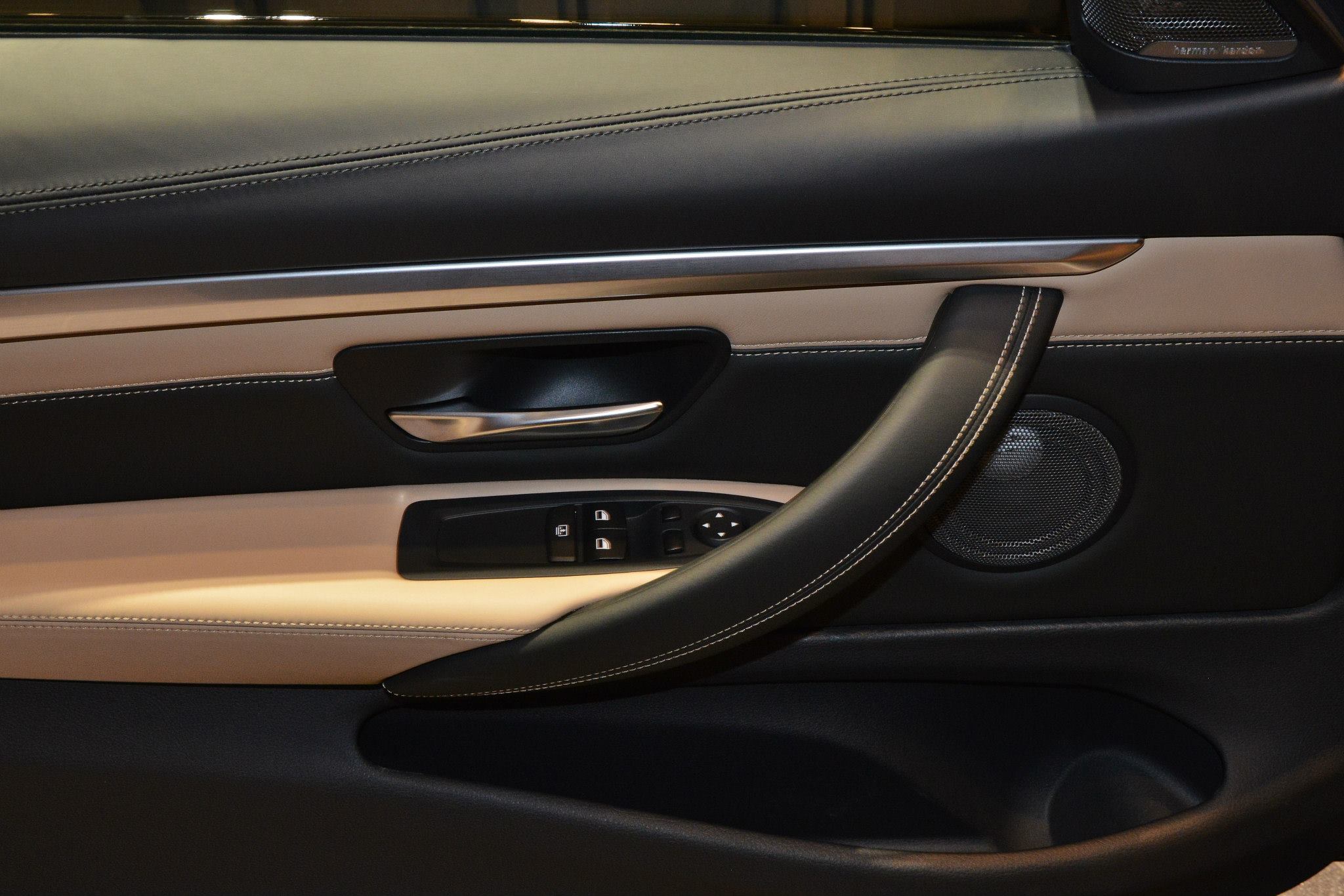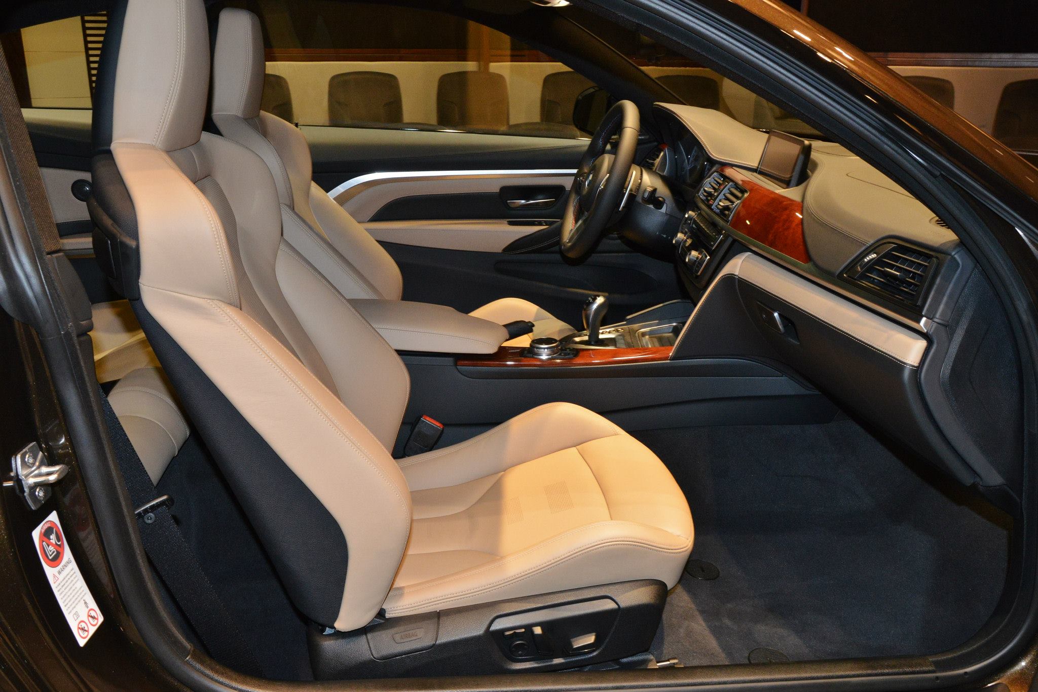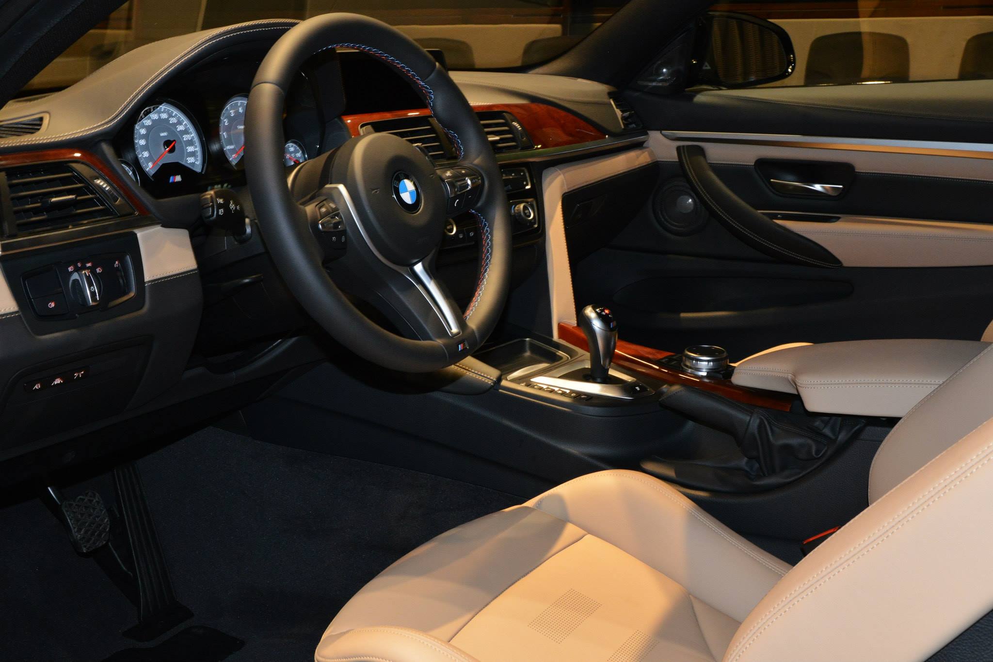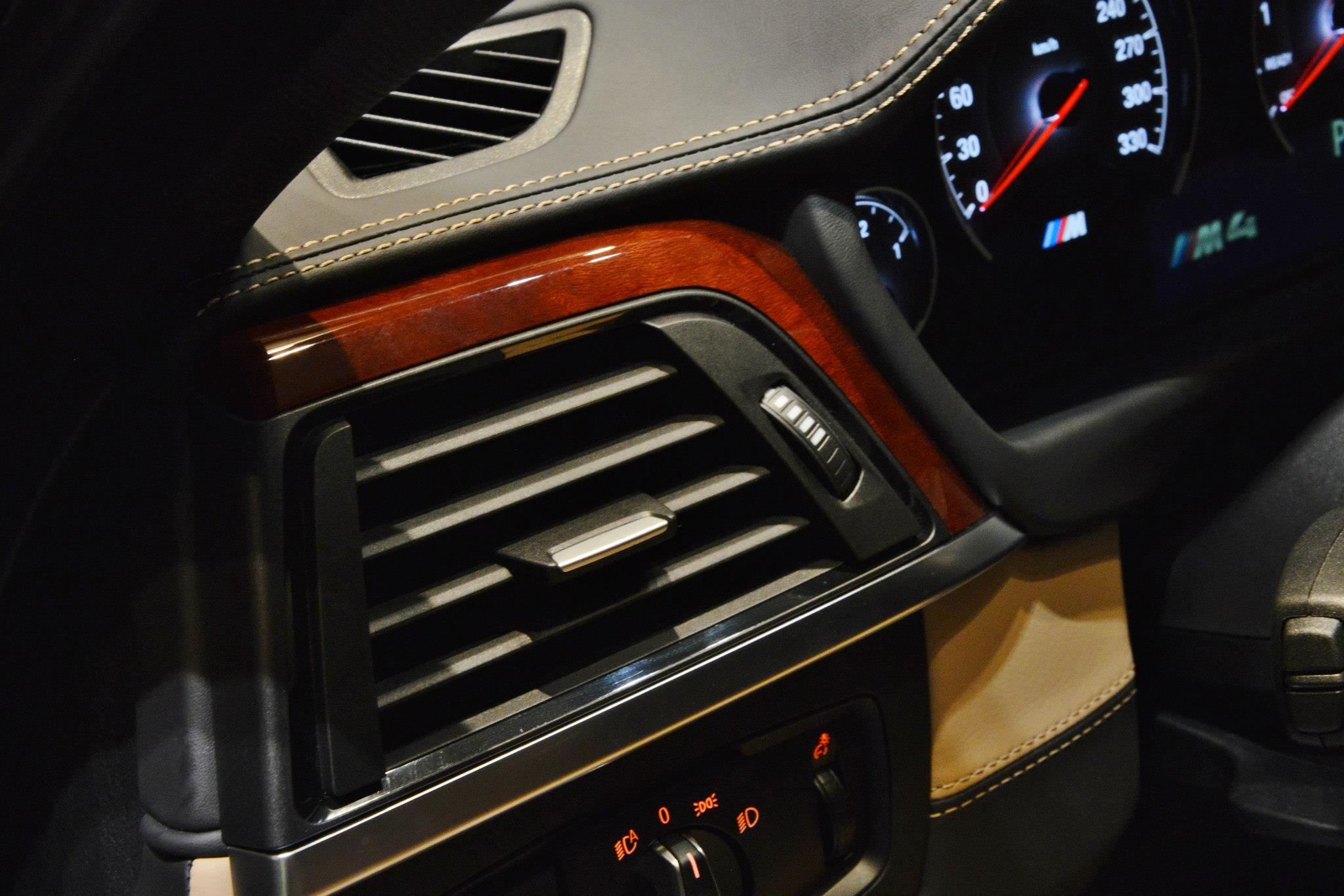 Im Innenraum sehen wir die Volllederausstattung Merino in Sonoma Beige, die mit der BMW Individual Edelholzausführung Platane Rotbraun dunkel kombiniert sind. So betonen Interieur und Exterieur die elegant-hochwertige Seite des BMW M4 Coupé und lassen den athletischen Charakter zumindest optisch in den Hintergrund treten.