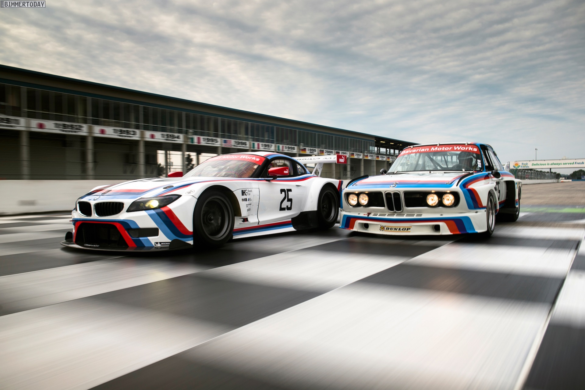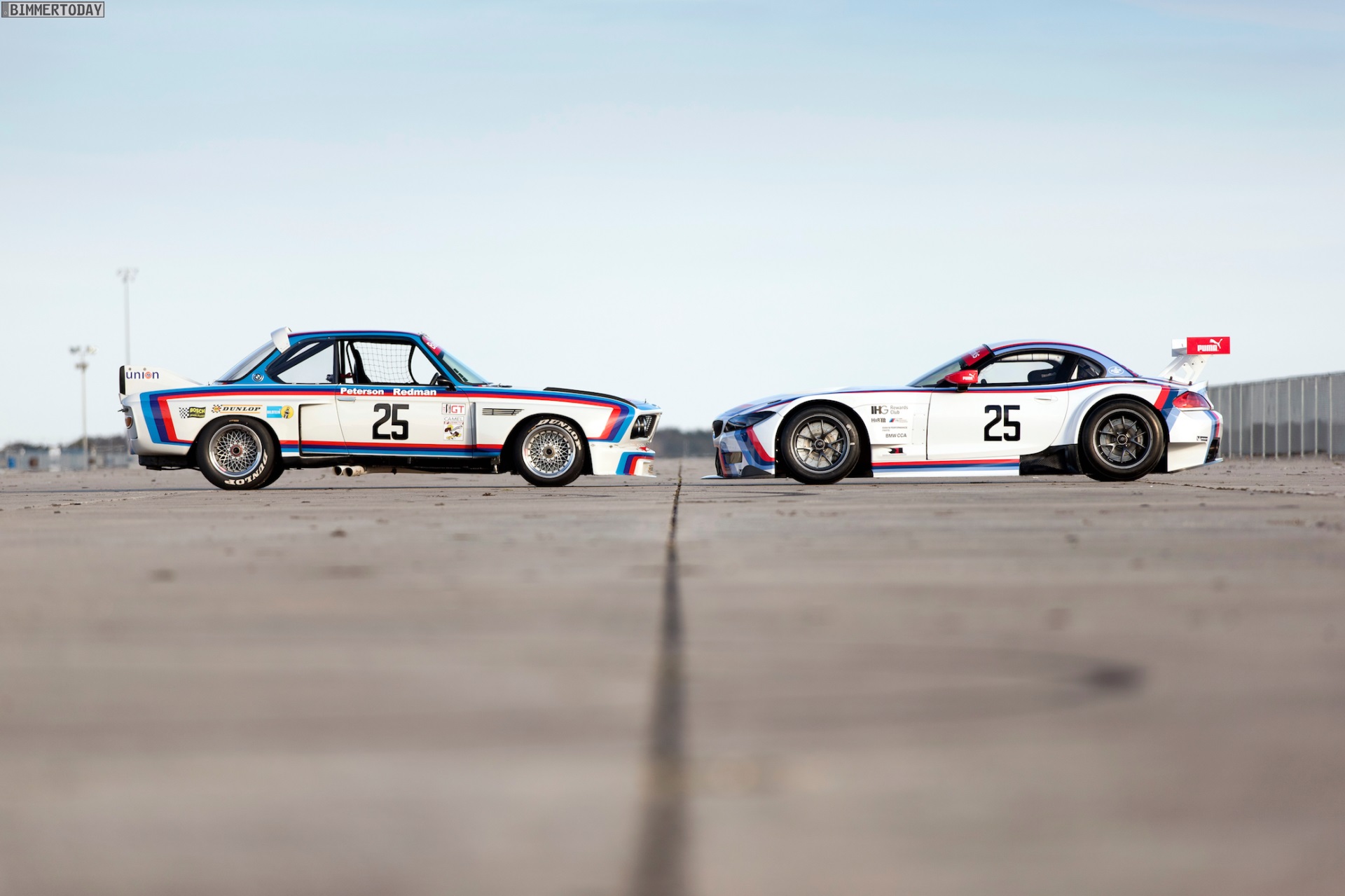 Auf einem ersten Foto sehen wir den BMW Z4 GT3 neben seinem historischen Vorbild, das vor vier Jahrzehnten maßgeblich zum Bekanntwerden der Marke BMW in den USA beigetragen hat: