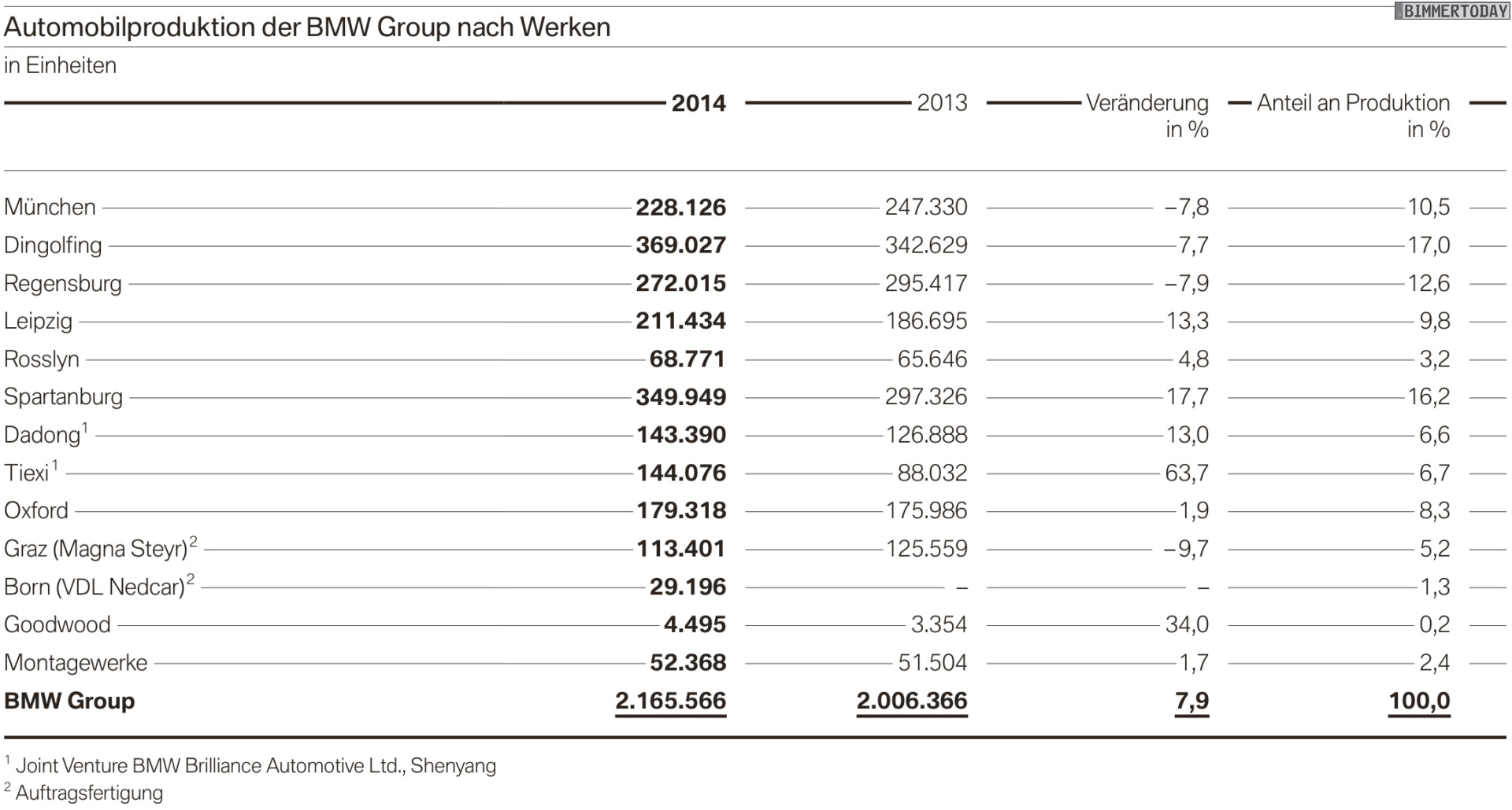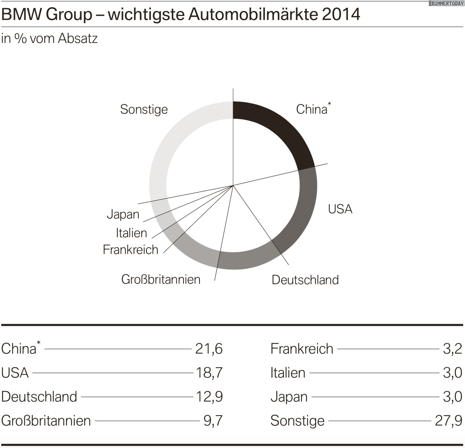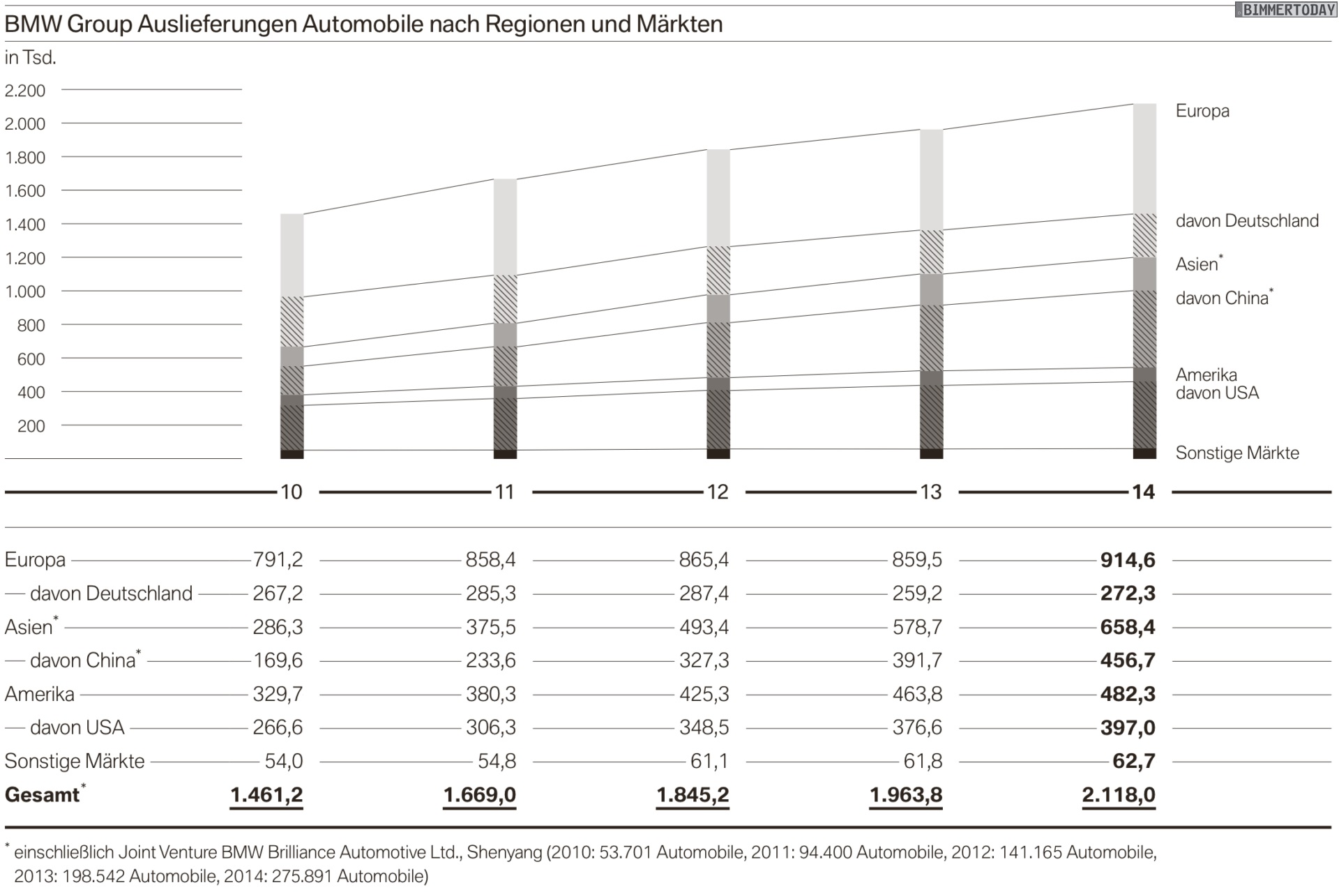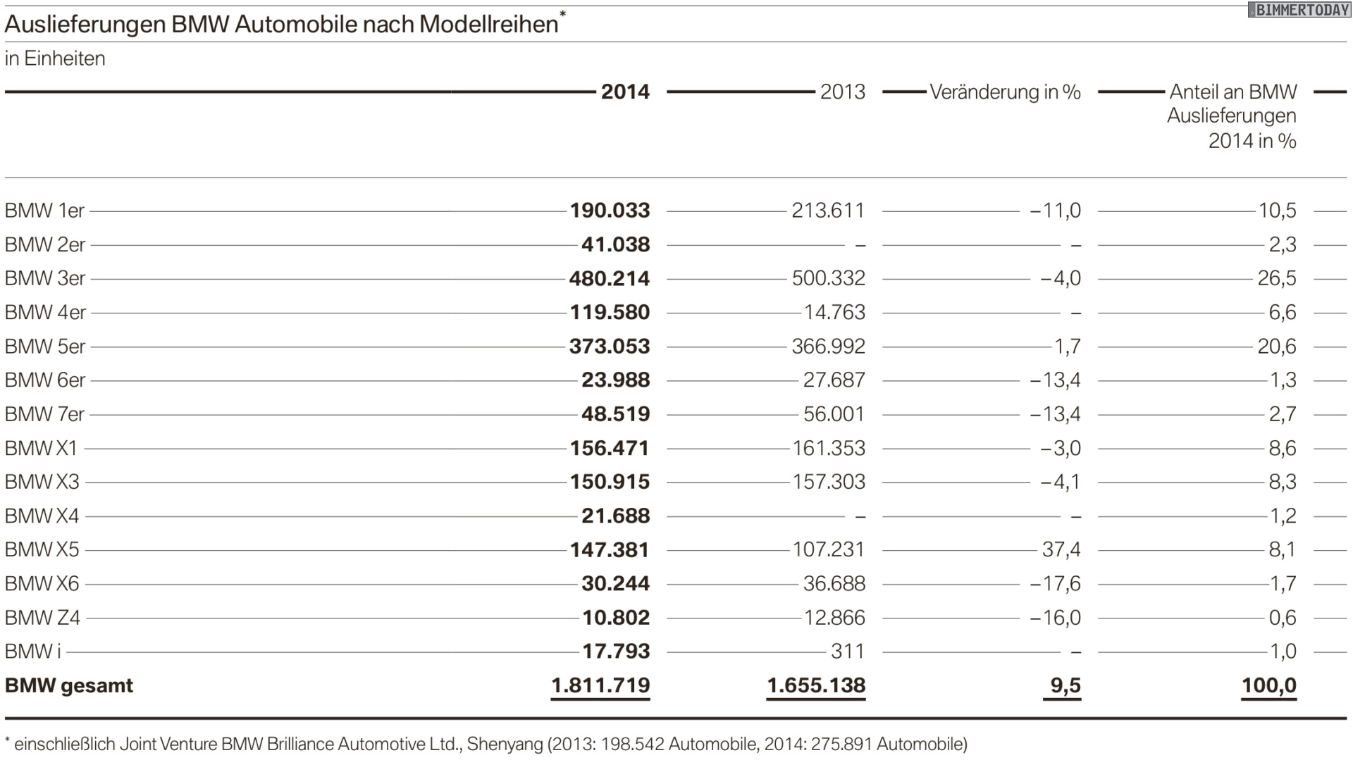 Sämtliche BMW X-Modelle kommen gemeinsam auf etwas mehr als 500.000 Einheiten, was einem Anteil von knapp 28 Prozent entspricht. Eine kaum zu überschätzende Rolle spielt auch die BMW 5er-Reihe, denn mehr als jeder fünfte verkaufte BMW trägt die 5 im Namen. Einen wichtigen Beitrag zum Gesamt-Absatz liefern die Modelle der 1er- und 2er-Reihe: Die Kompaktklasse-Vertreter fanden 2014 weltweit mehr als 230.000 Kunden und kommen gemeinsam auf einen Anteil von 12,8 Prozent der insgesamt 1.811.719 verkauften BMW.