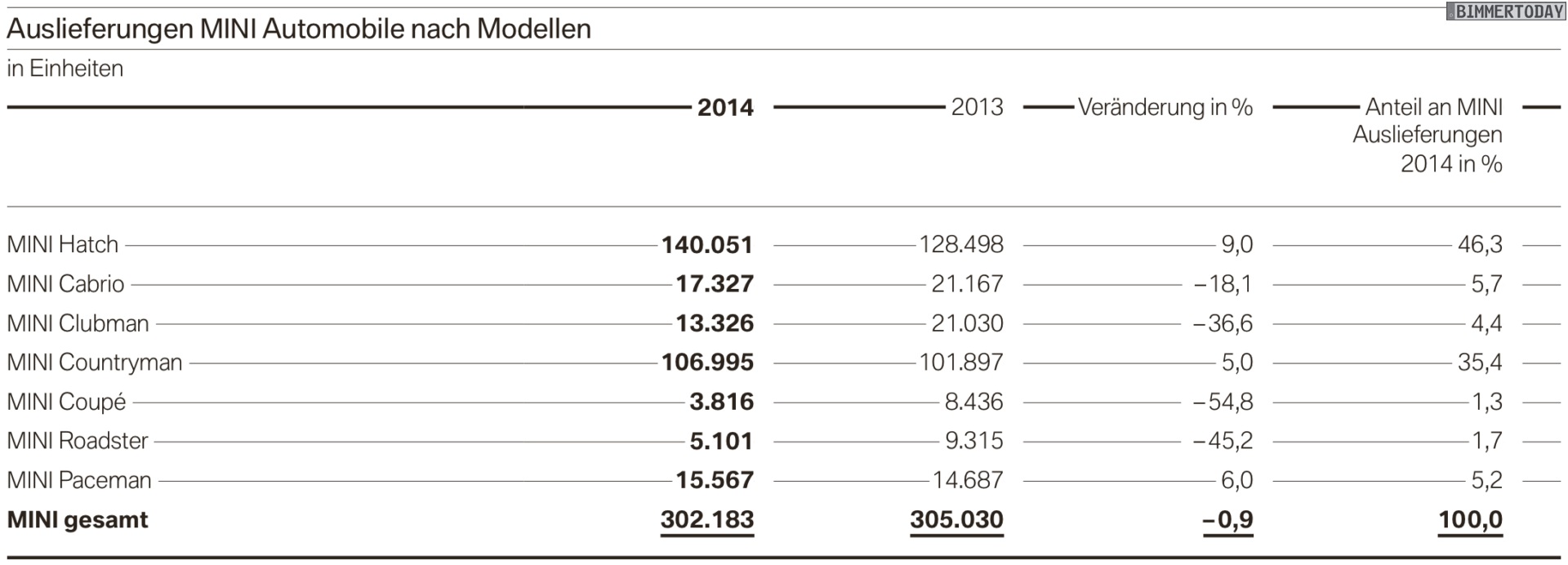 Bei der Marke MINI dominiert der neue MINI Hatch die Verkaufszahlen, der seit Ende des Jahres erstmals auch als Fünftürer erhältliche Kleinwagen fand 2014 weltweit 140.051 Kunden und steht damit fast für die Hälfte aller verkauften MINIs. Mit der flächendeckenden Einführung des MINI Fünftürers F55 dürfte der Anteil im Jahr 2015 sogar noch weiter steigen. Eine ähnlich wichtige Rolle spielt nur noch der MINI Countryman, der mit 106.995 verkauften Fahrzeugen für 35,4 Prozent des Marken-Absatzes stand.