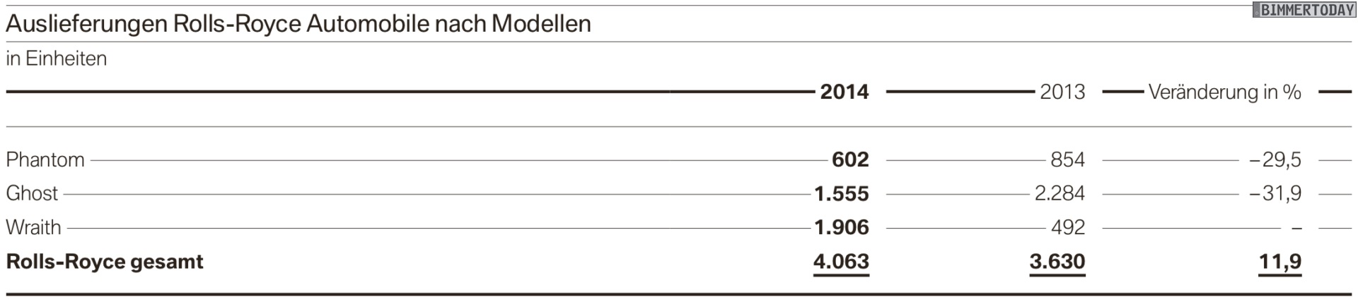 Die Luxusmarke Rolls-Royce steigerte ihren Absatz im Jahr 2014 um 11,9 Prozent auf 4.063 Einheiten und verdankt diesen Zuwachs vor allem dem neuen Rolls-Royce Wraith. Das Luxus-Coupé fand weltweit 1.906 Kunden und stand damit fast für die Hälfte aller verkauften Rolls-Royce. Sowohl das Topmodell Phantom als auch die im Lauf des Jahres überarbeitete Ghost-Familie mussten deutliche Rückgänge bei den Verkaufszahlen hinnehmen.
