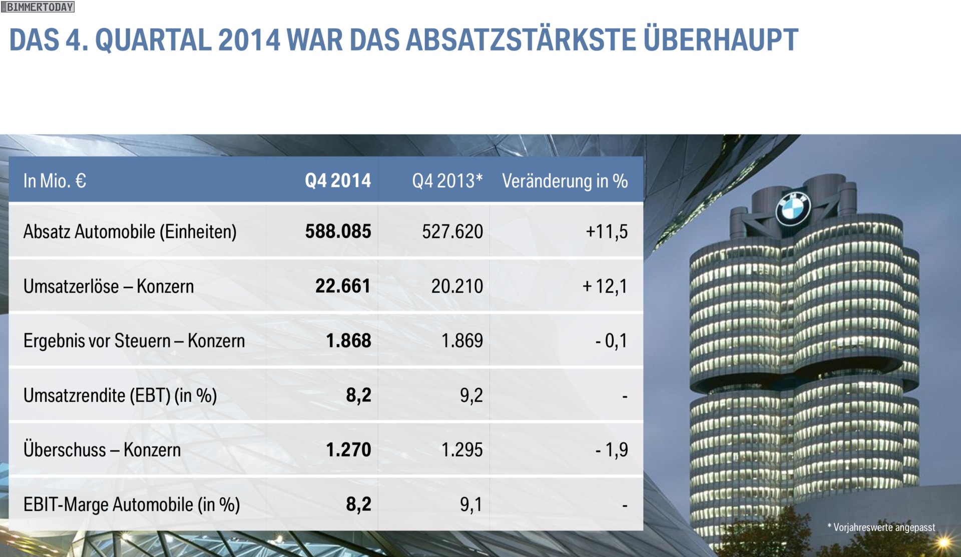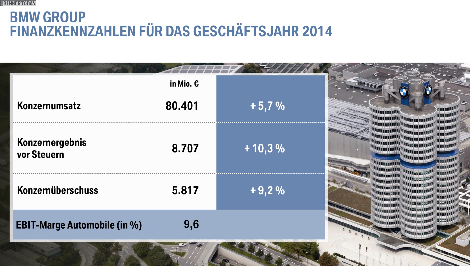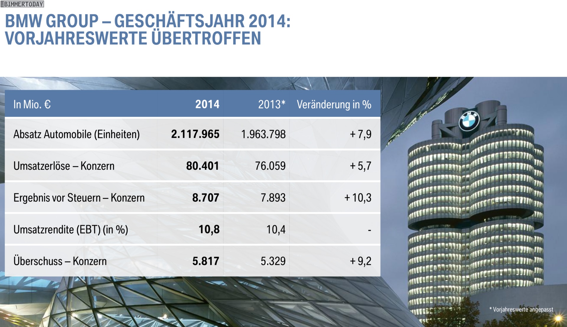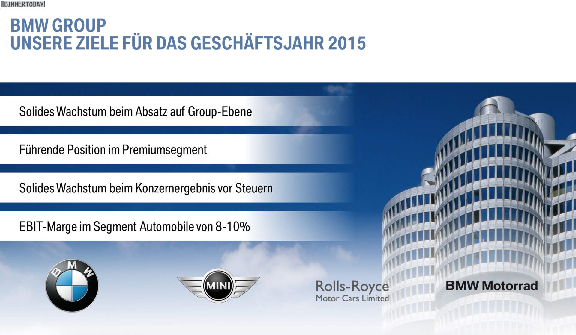 Dr. Norbert Reithofer (Vorsitzender des Vorstands der BMW AG): “Im Geschäftsjahr 2014 haben wir unsere erfolgreiche Entwicklung seit der globalen Finanz und Wirtschaftskrise 2008 / 2009 fortgesetzt. In einem schwierigen Umfeld hatten wir uns ambitionierte Ziele gesetzt: einen Absatzrekord mit über 2 Millionen Automobilen; einen neuen Bestwert beim Konzernergebnis vor Steuern, der deutlich über dem Wert des Vorjahres liegt; eine EBITMarge im Segment Automobile im Zielkorridor von 8 bis 10 Prozent.