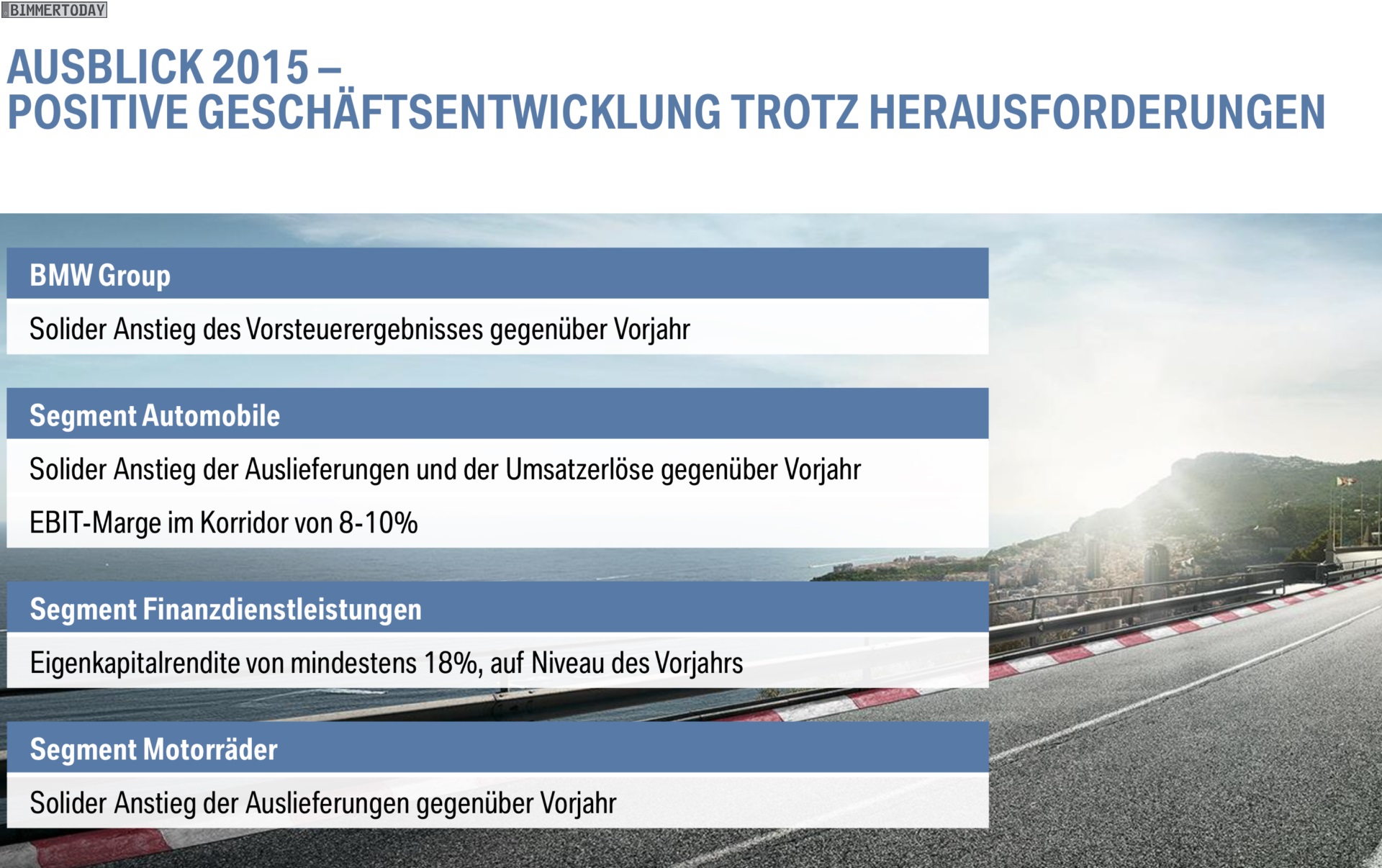 Für das bereits positiv begonnene Jahr 2015 kündigte der scheidende BMW-Vorstandsvorsitzende Dr. Norbert Reithofer weitere Bestwerte und das Verteidigen der seit 2005 gehaltenen Stellung als weltweit erfolgreichster Anbieter von Premium-Automobilen an: “Wir streben im laufenden Geschäftsjahr bei Absatz und Konzernergebnis vor Steuern solide Zuwächse auf jeweils neue Bestmarken an. Wir wollen der weltweit führende Hersteller von Premiumfahrzeugen bleiben.”
