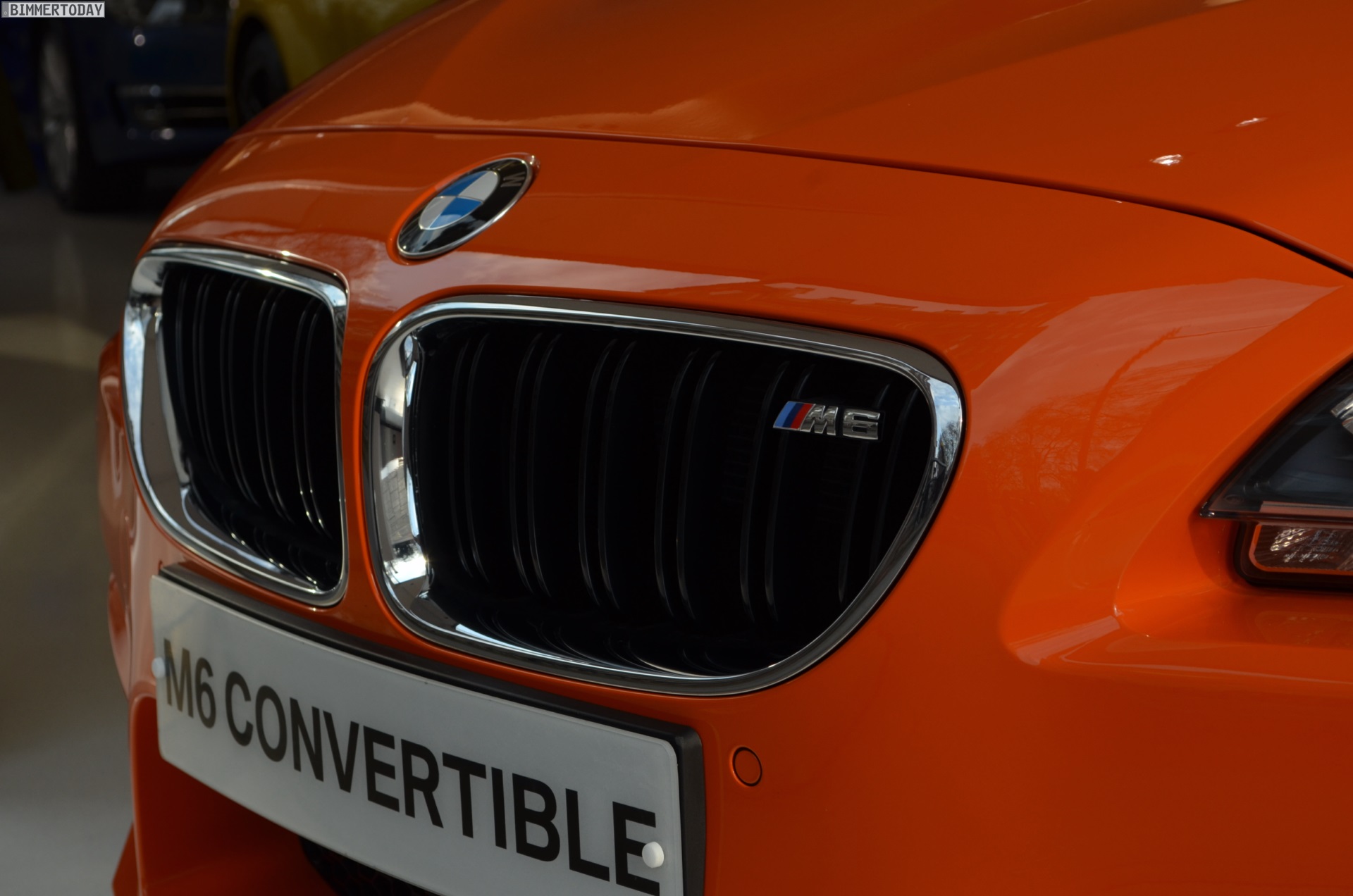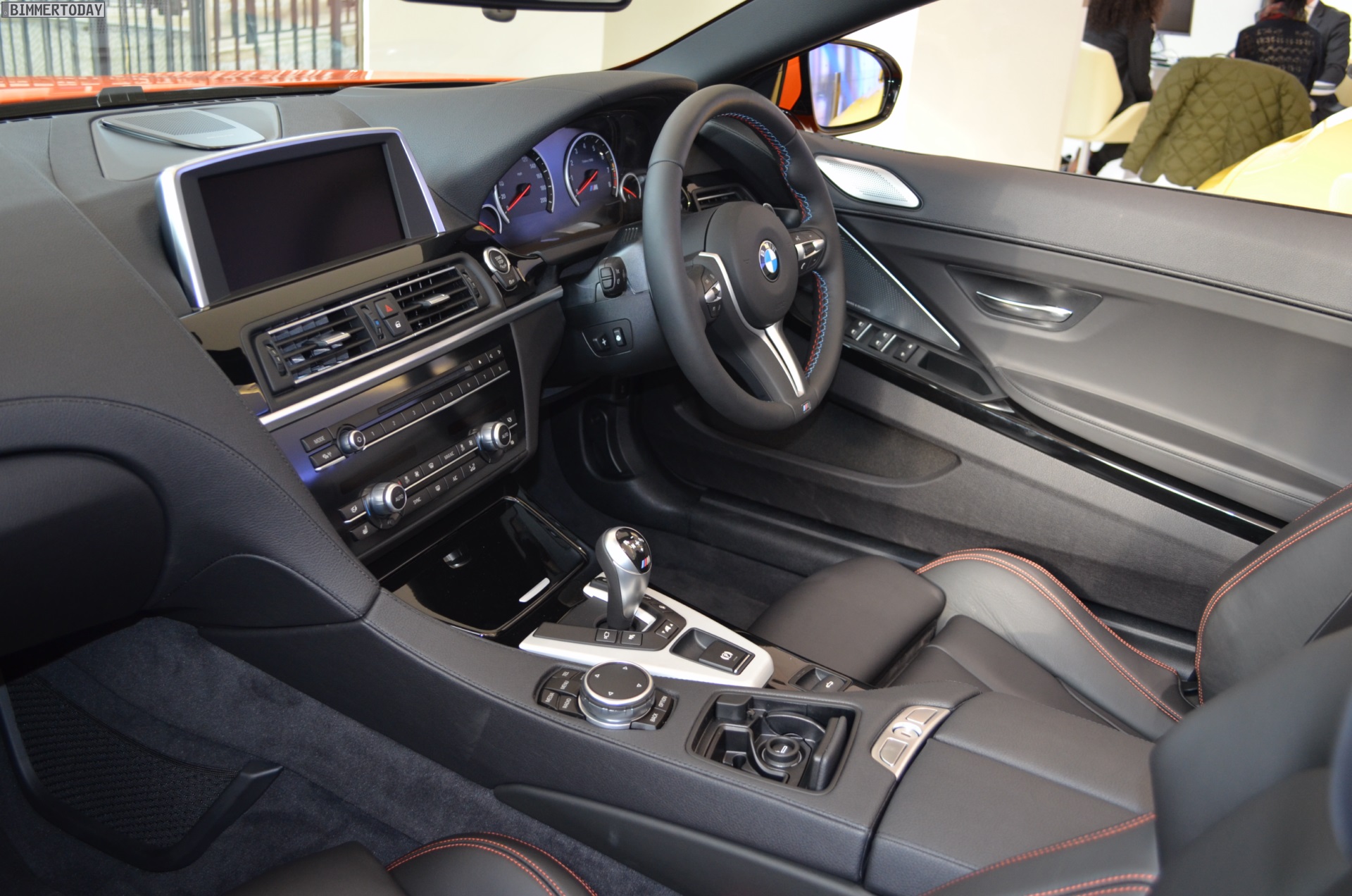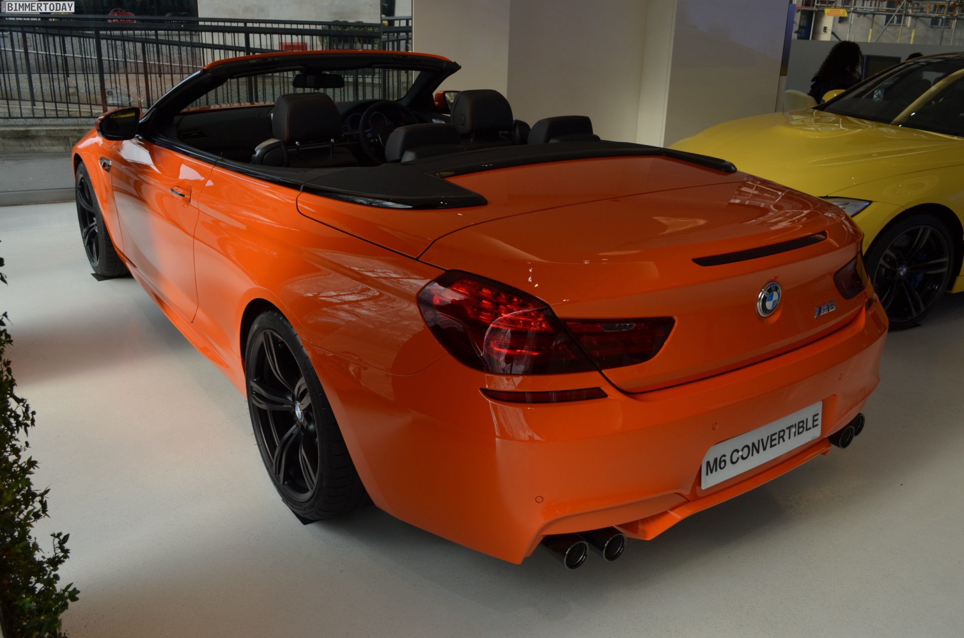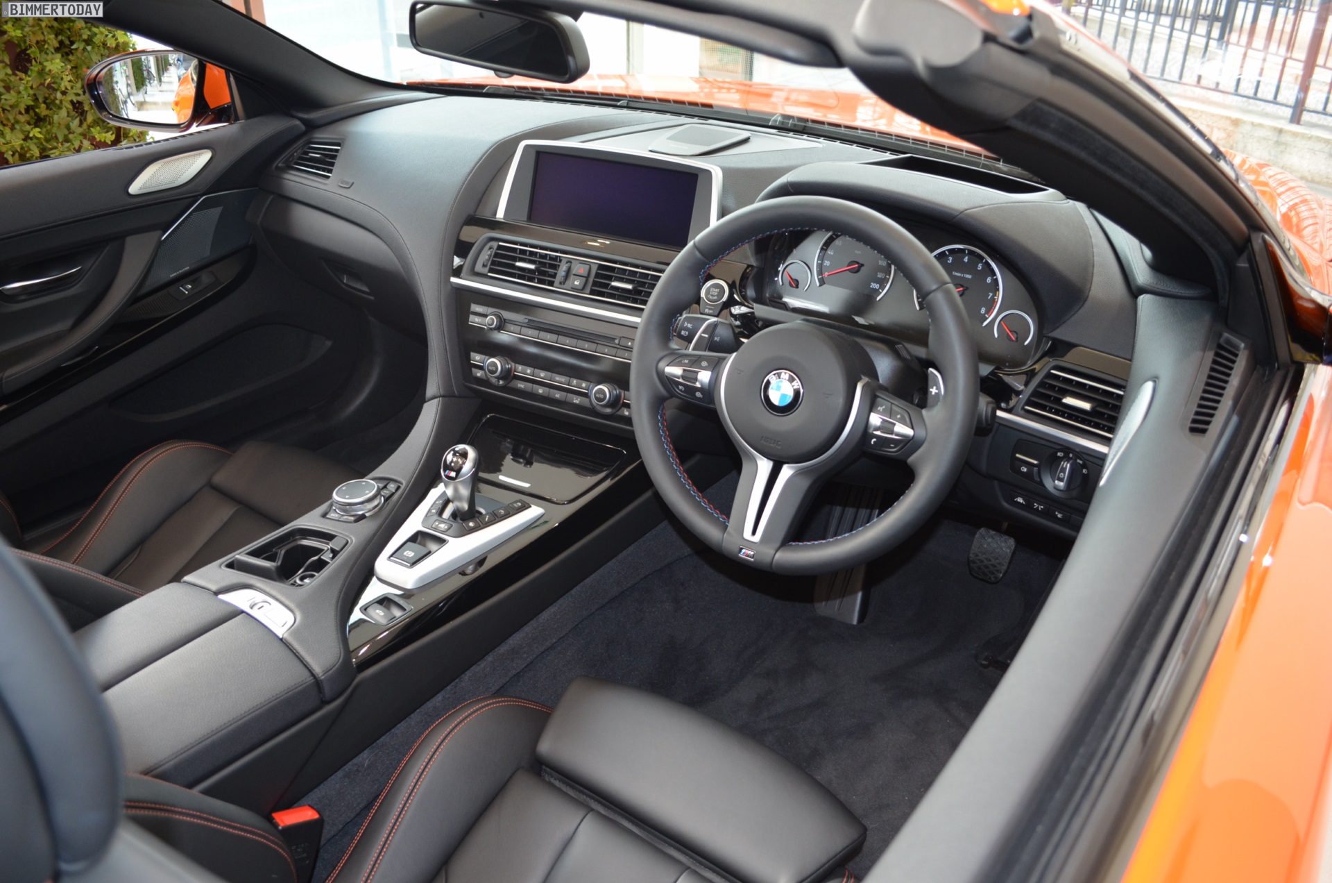 Bei dem in London gezeigten BMW M6 Cabrio spielt die Farbe auch im Innenraum eine Rolle, orange Kontrast-Nähte auf dem schwarzen Leder lassen die Außenfarbe auch im Interieur dezent wiederkehren. Sicher ist: Mit seinem 560 PS starken V8-Biturbo kann sich der offene M6 den extravaganten Auftritt in Feuerorange leisten.