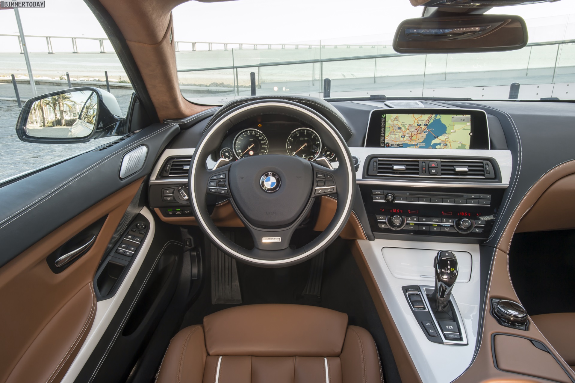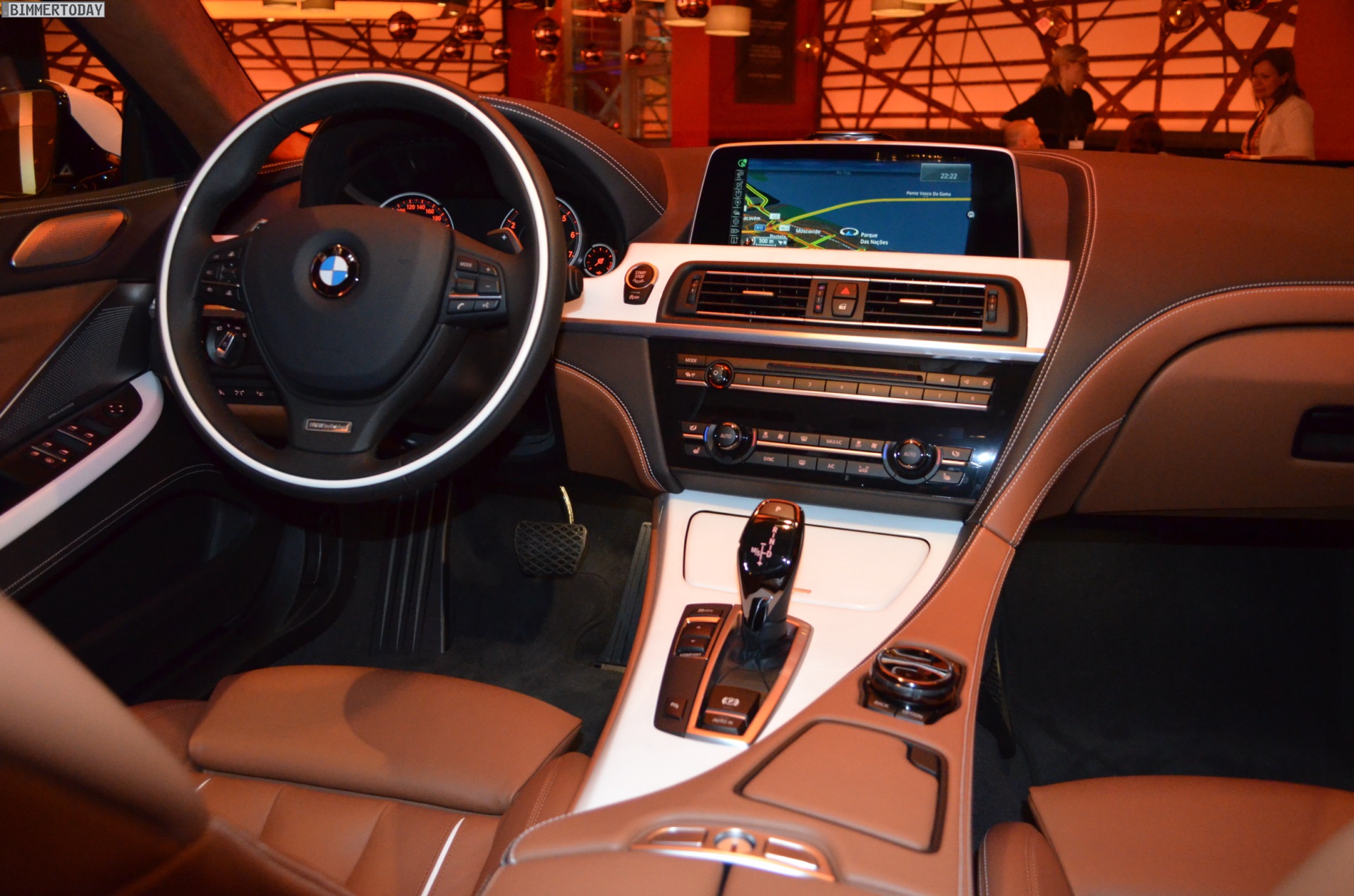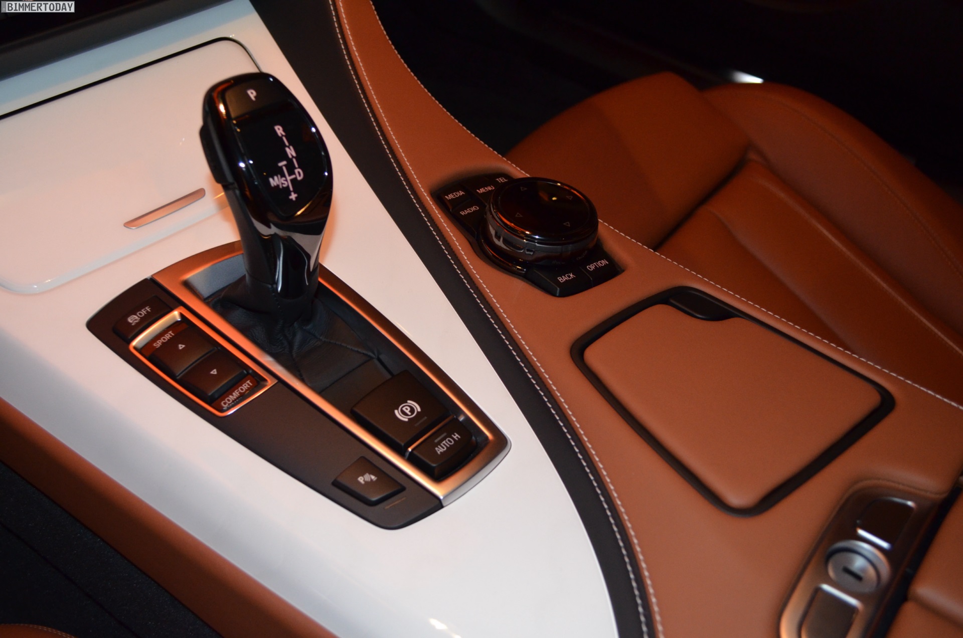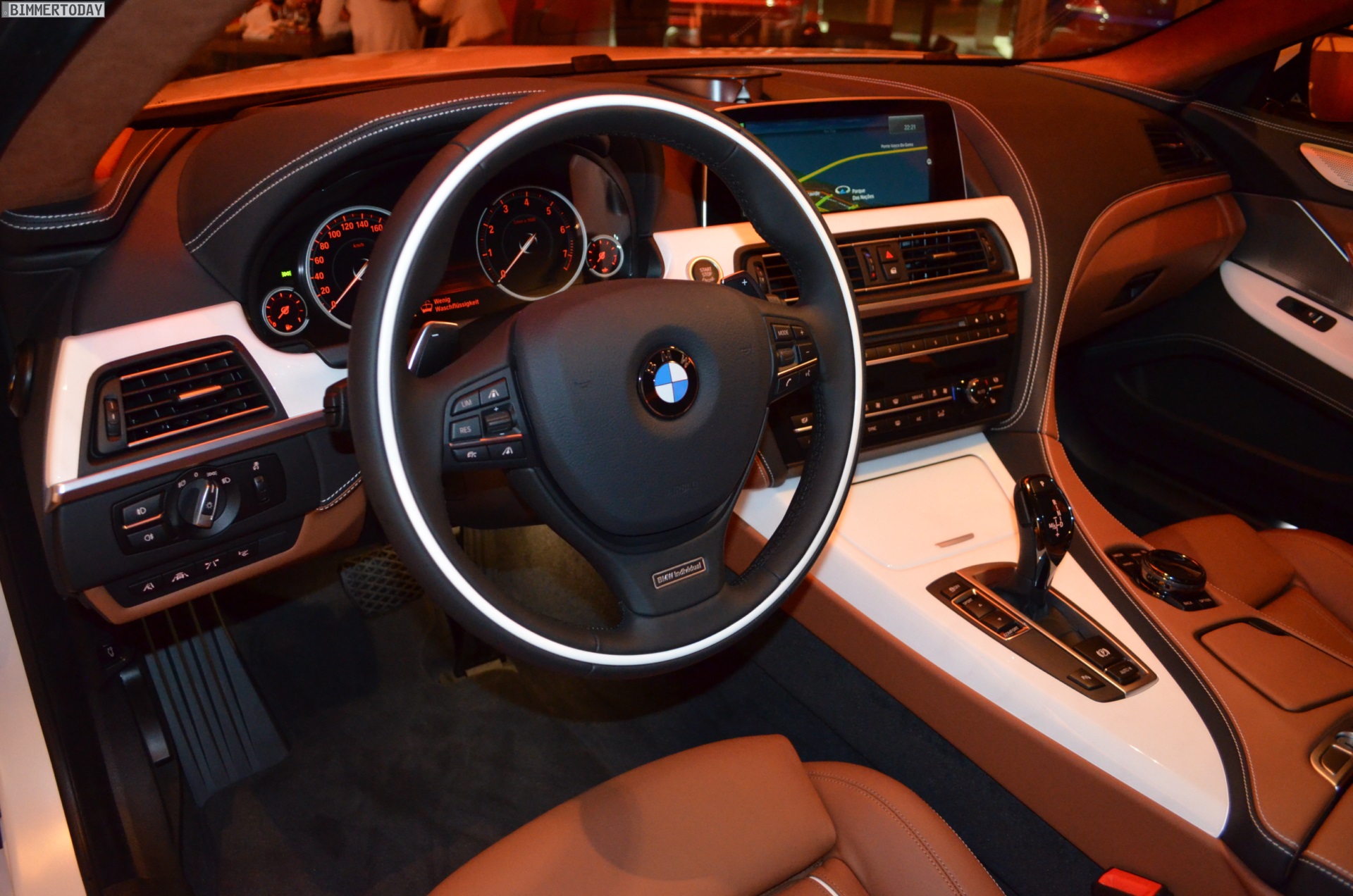 Die eigentlichen Highlights des gezeigten Fahrzeugs verbergen sich jedoch im Innenraum mit edler BMW Individual-Ausstattung. Die Insassen können es sich auf Merino-Leder Feinnarbe in Amarobraun und Weiß bequem machen, die überwiegend schwarz belederte Armaturentafel greift diese Farben in Kombination mit weißen Kontrastnähten erneut auf. Weitere helle Akzente setzen die Edelholz-Interieurleisten Esche Maser Weiß, die auch als Intarsie am Lenkrad wiederkehren. Der komplett in Amarobraun gehaltene Alcantara-Dachhimmel rundet das Gesamtpaket stilvoll ab.