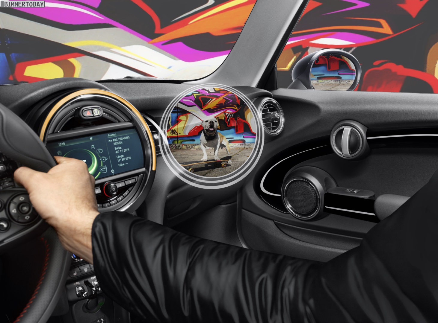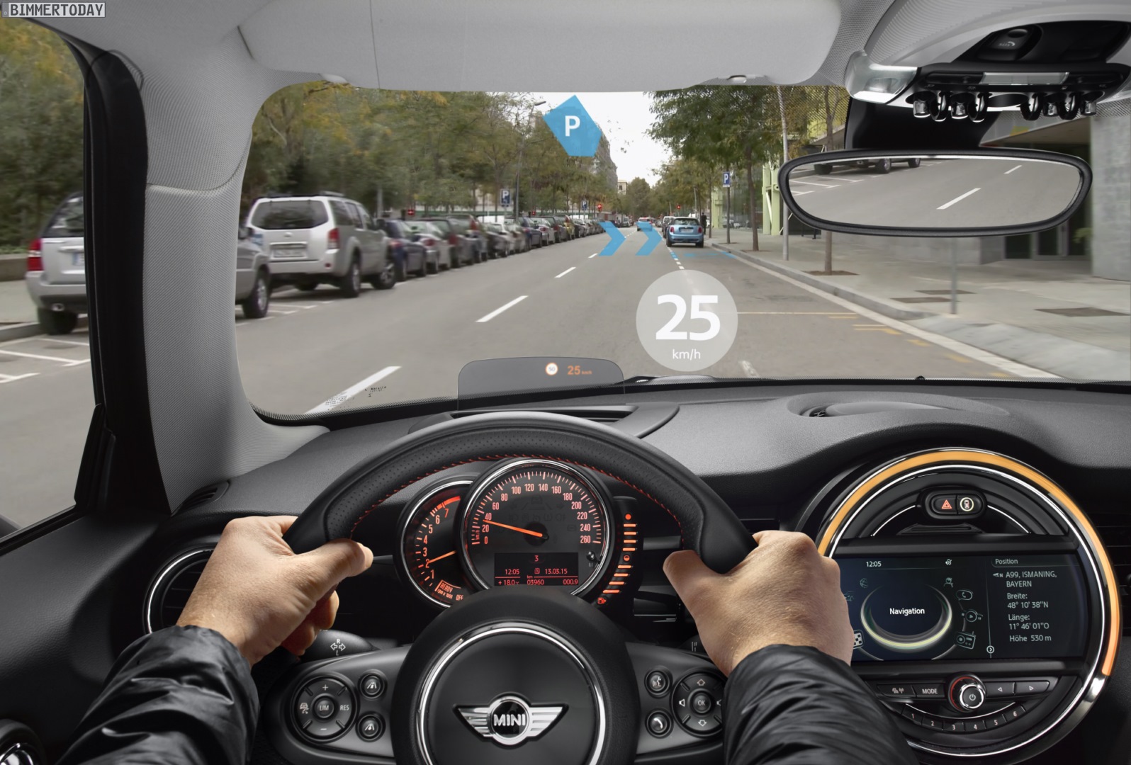 Noch mehr Sicherheit verspricht der virtuelle Blick durch A-Säulen und Türen, denn mit Hilfe von Kameras im Außenspiegel und MINI Augmented Vision können diverse Bauteile des Fahrzeugs virtuell transparent gemacht werden. Anwendungsmöglichkeiten sind nicht nur die Hervorhebung von eigentlich verdeckten Hindernissen im Stadtverkehr, sondern auch ein besserer Überblick beim Einparken.