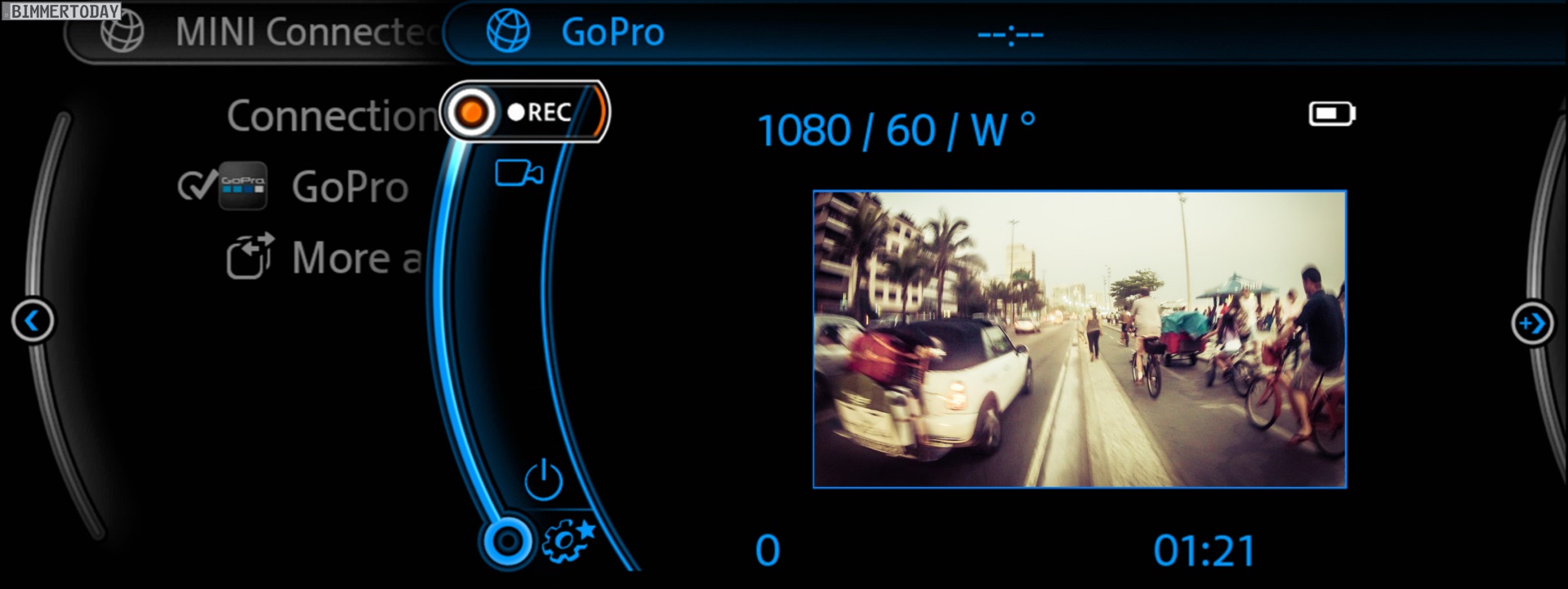 Mit Hilfe der BMW GoPro-App kann das Bild der Kamera auf dem zentralen Infotainment-Display angezeigt werden. Auch die Aufnahme-Funktionen und diverse Einstellungen lassen sich mit Hilfe des BMW iDrive-Systems komfortabel und ohne die reduzierte Ansicht auf dem kleinen GoPro-Display steuern.