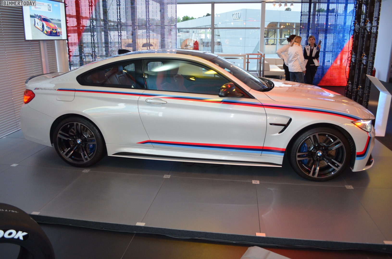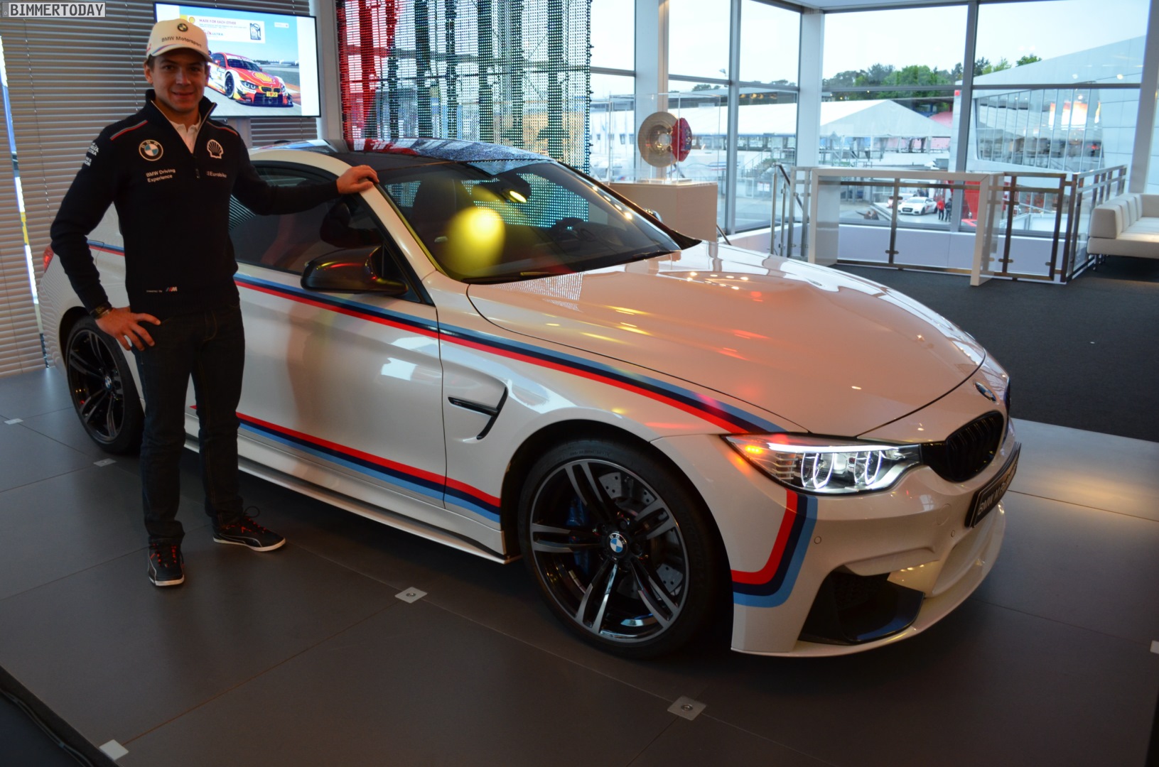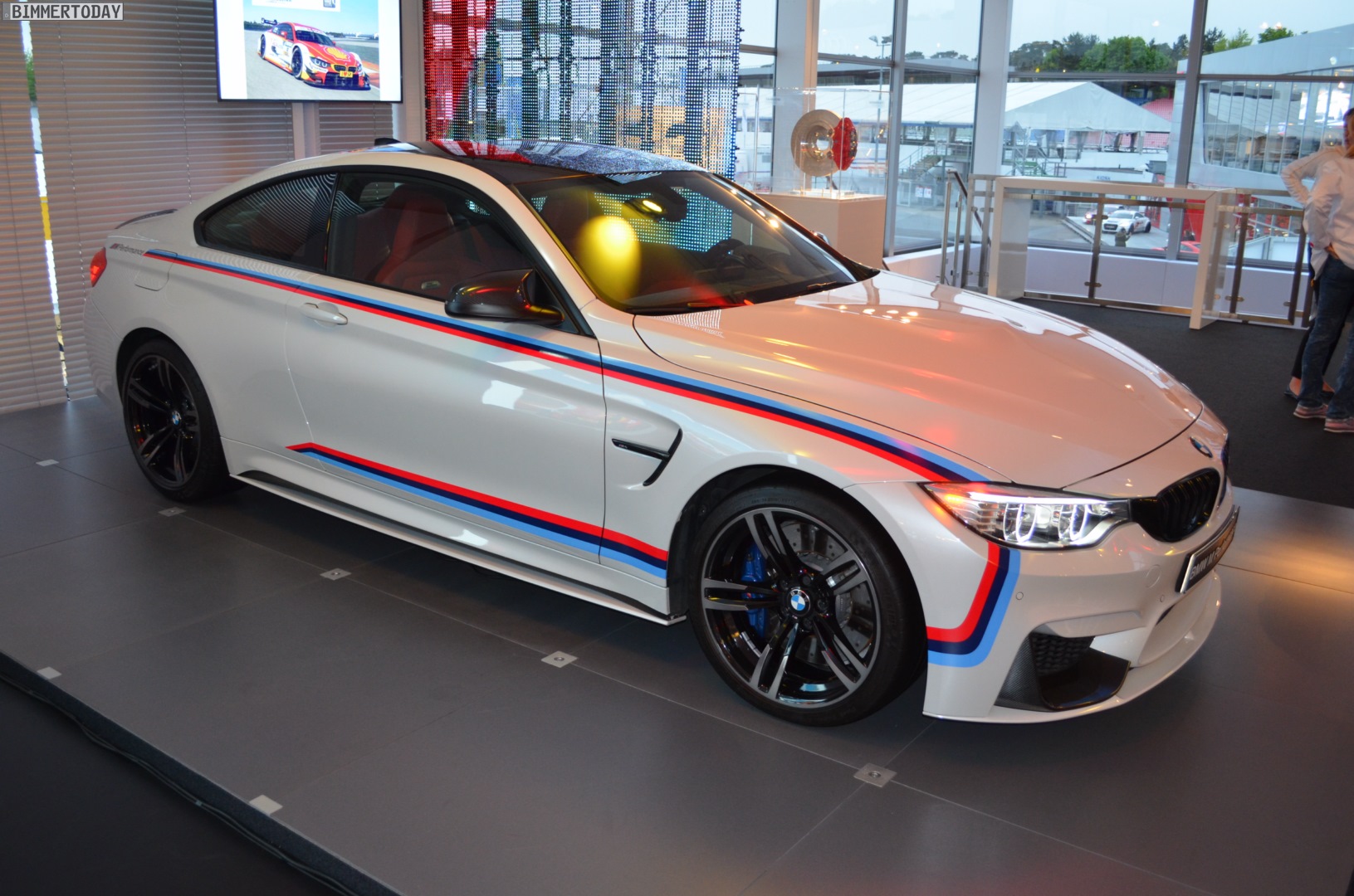 Einer der Stars in der BMW Motorsport Hospitality ist ein BMW M4 DTM mit Tuning-Zubehör von BMW M Performance. Wie schon bei früheren Gelegenheiten präsentiert BMW das Sportcoupé mit weißer Lackierung, schließlich kommen die BMW Motorsport-Farben der Dekor-Streifen so besonders gut zur Geltung.