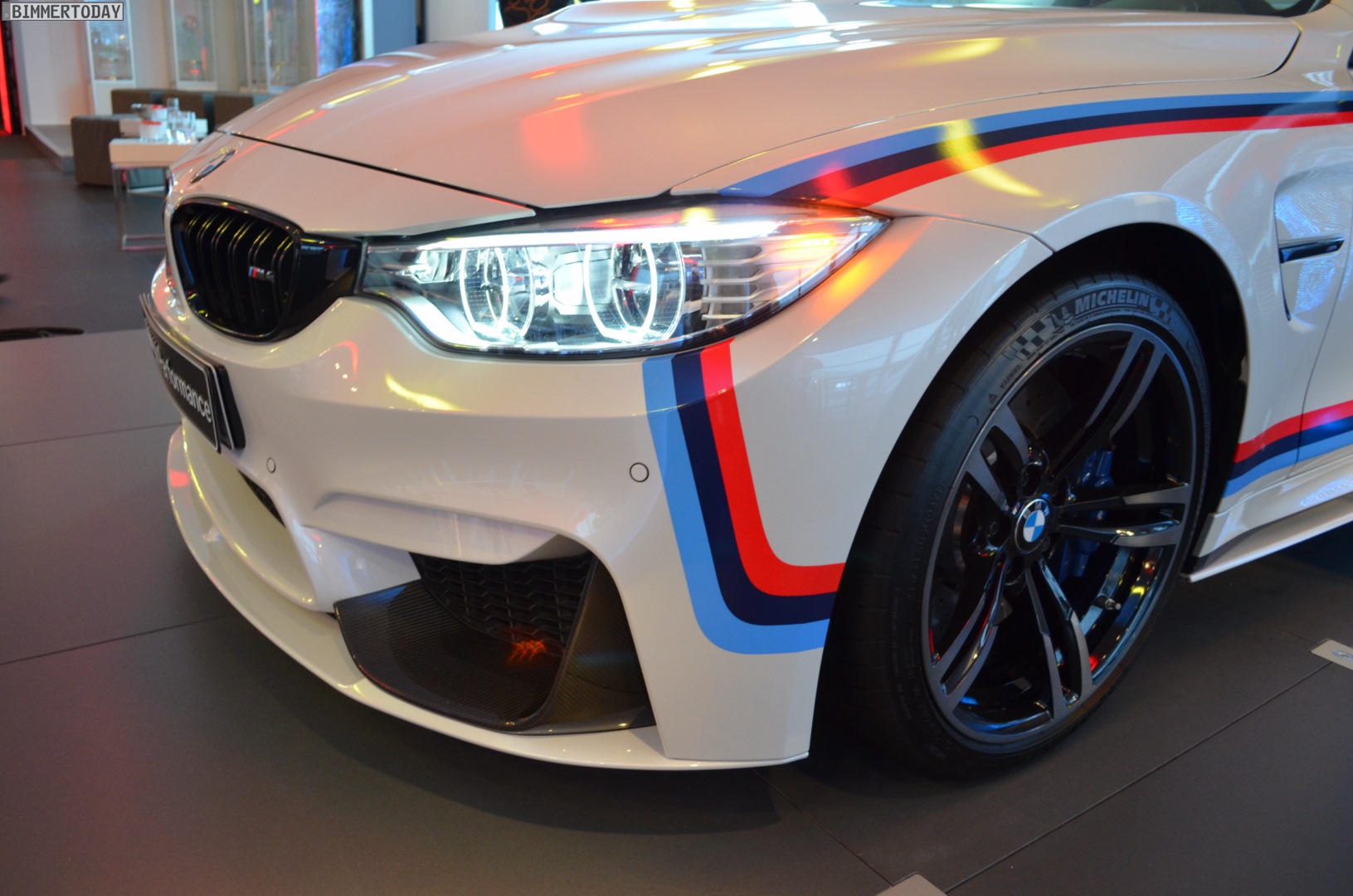 In erster Linie fürs Auge sind hingegen die in hochglänzendem Schwarz ausgeführten Nieren, die Carbon-Außenspiegelkappen und natürlich die Dekor-Folierung in den Farben von BMW Motorsport. Die Ohren freuen sich unterdessen über den erheblich kernigeren Sound, den die BMW M Performance Abgasanlage mit Klappensteuerung und Titan-Endschalldämpfer in die Umwelt entlässt. Mit der Wahl des Fahrmodus kann der Fahrer aus dem Cockpit heraus auch die Klanggewalt der Abgasanlage steuern.