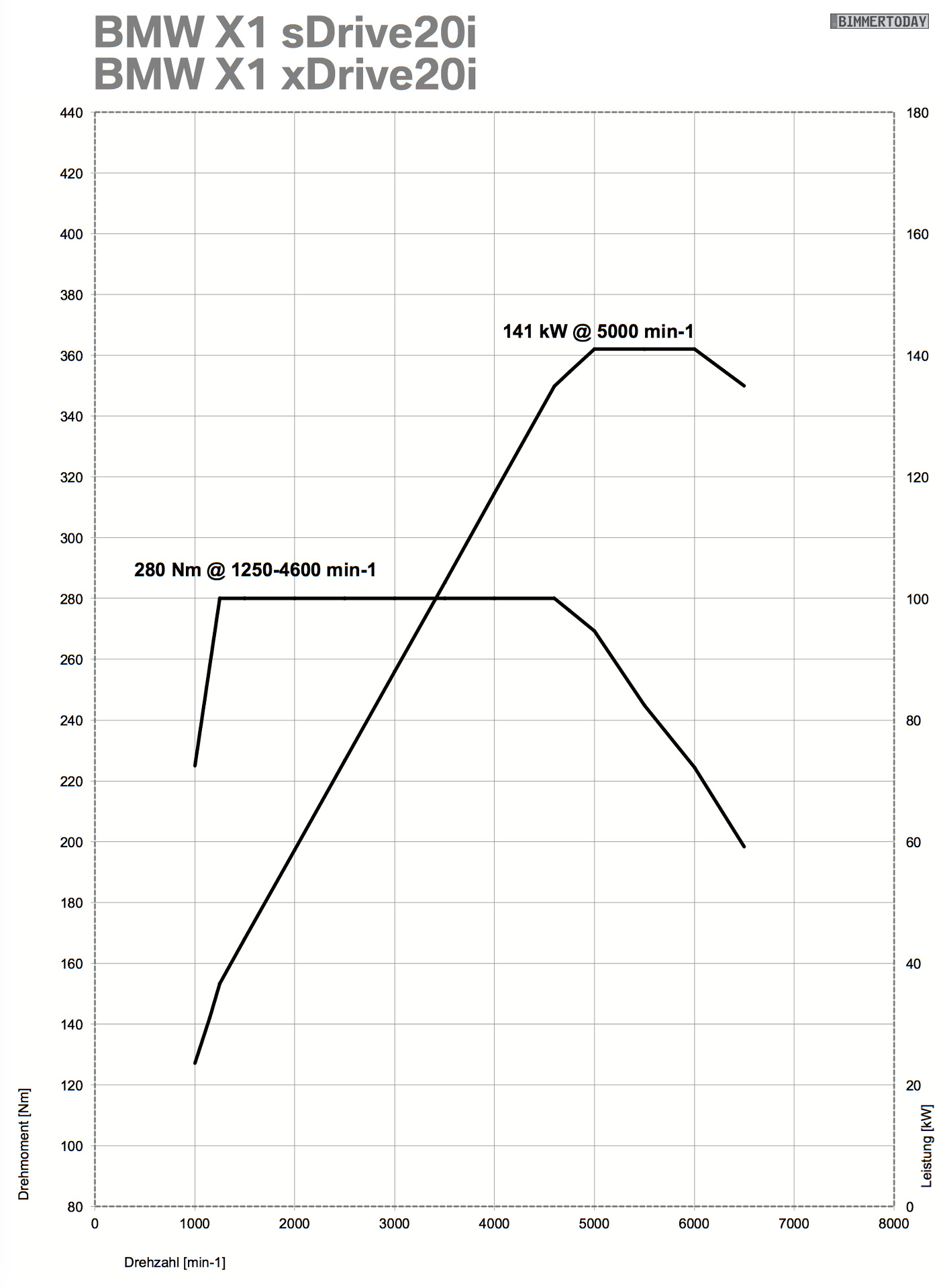 - BMW X1 sDrive20i: 192 PS, 280 Nm, 7,7s 0-100, 5,9-6,0 l/100km