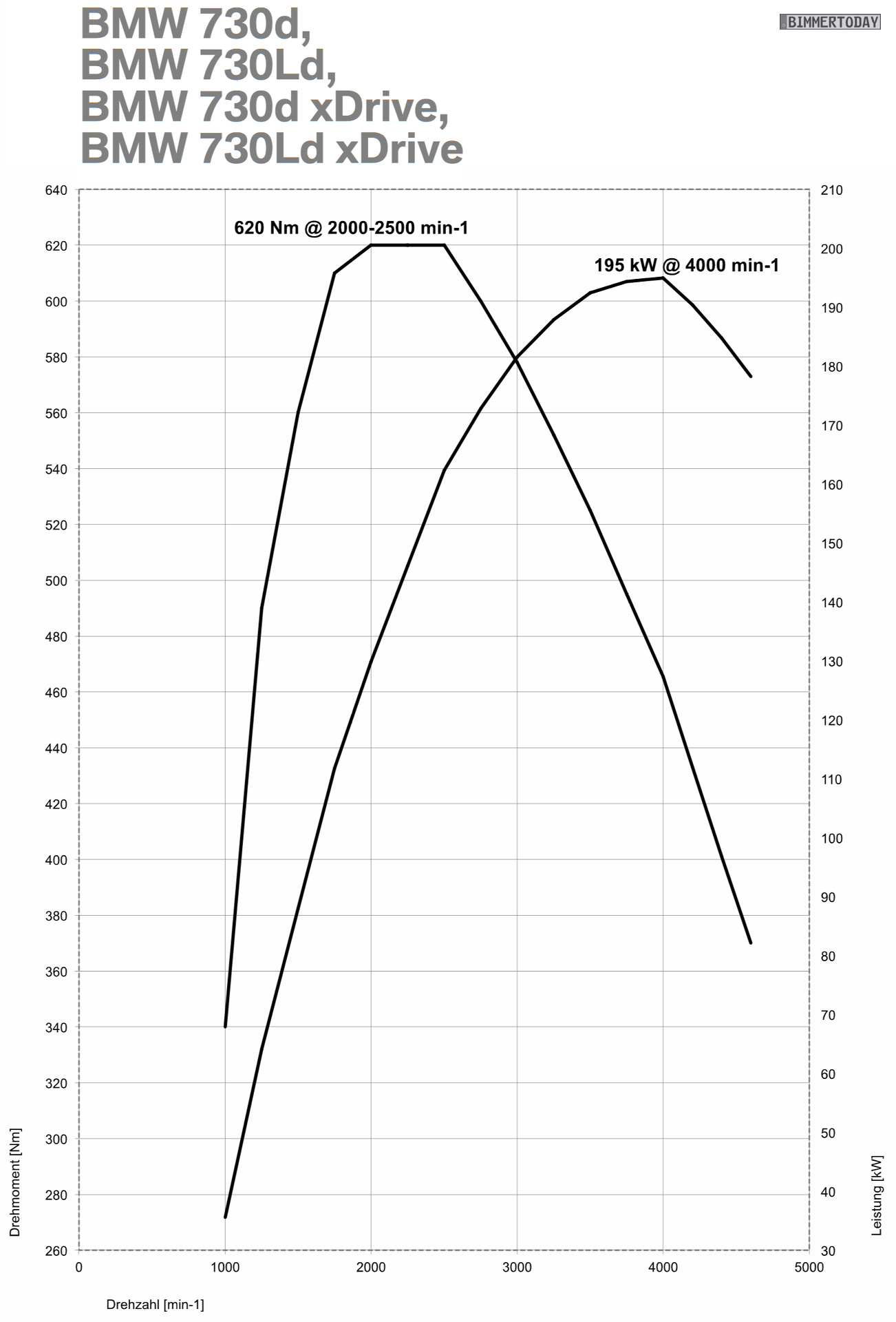 BMW 730d xDrive: 265 PS, 620 Nm, 5,8s 0-100, 4,8-5,2 l/100km, 1900 kg