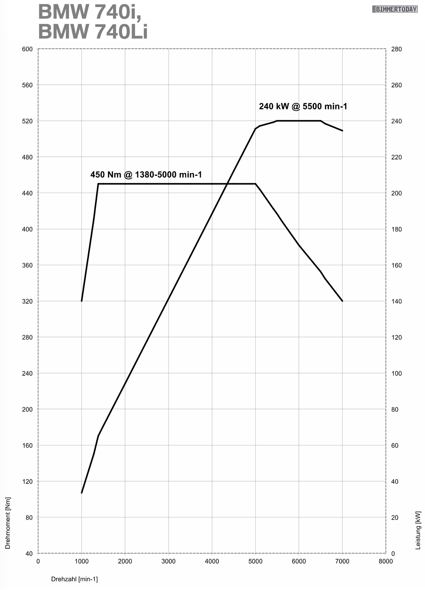BMW 740i: 326 PS, 450 Nm, 5,5s 0-100, 6,6-7,0 l/100km, 1800 kg