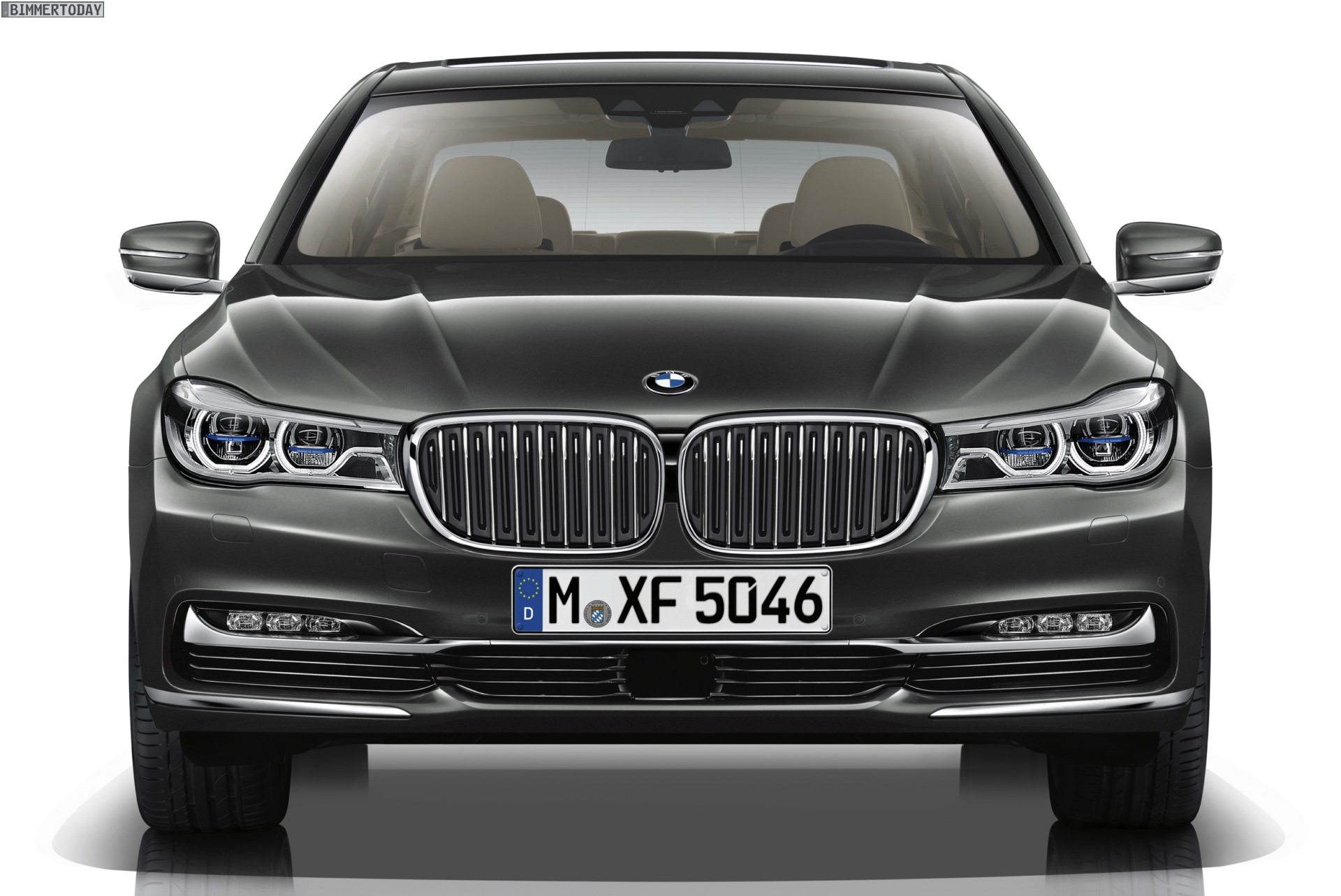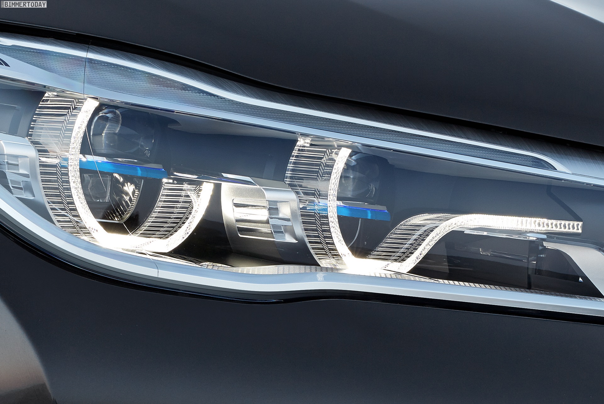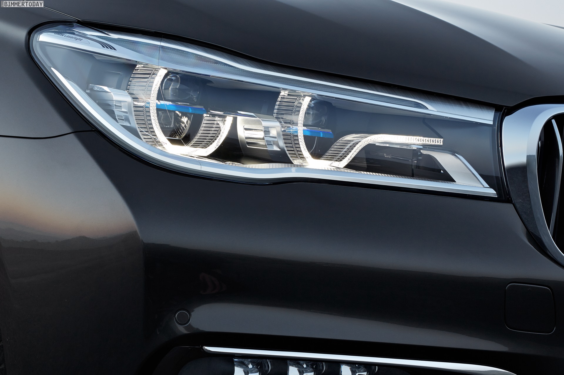 Auch bei Tageslicht erkennbar sind die für keinen Wettbewerber des BMW 7er G11 / G12 erhältlichen oder auch nur angekündigten Laserlicht-Scheinwerfer an einem blau gefärbten Steg im Zentrum der Leuchten. Zusätzlich zur größeren Reichweite bietet das besonders helle und reinweiße Laserlicht noch einen weiteren Vorteil: der Energiebedarf fällt um 30 Prozent niedriger als bei LED-Scheinwerfern aus.