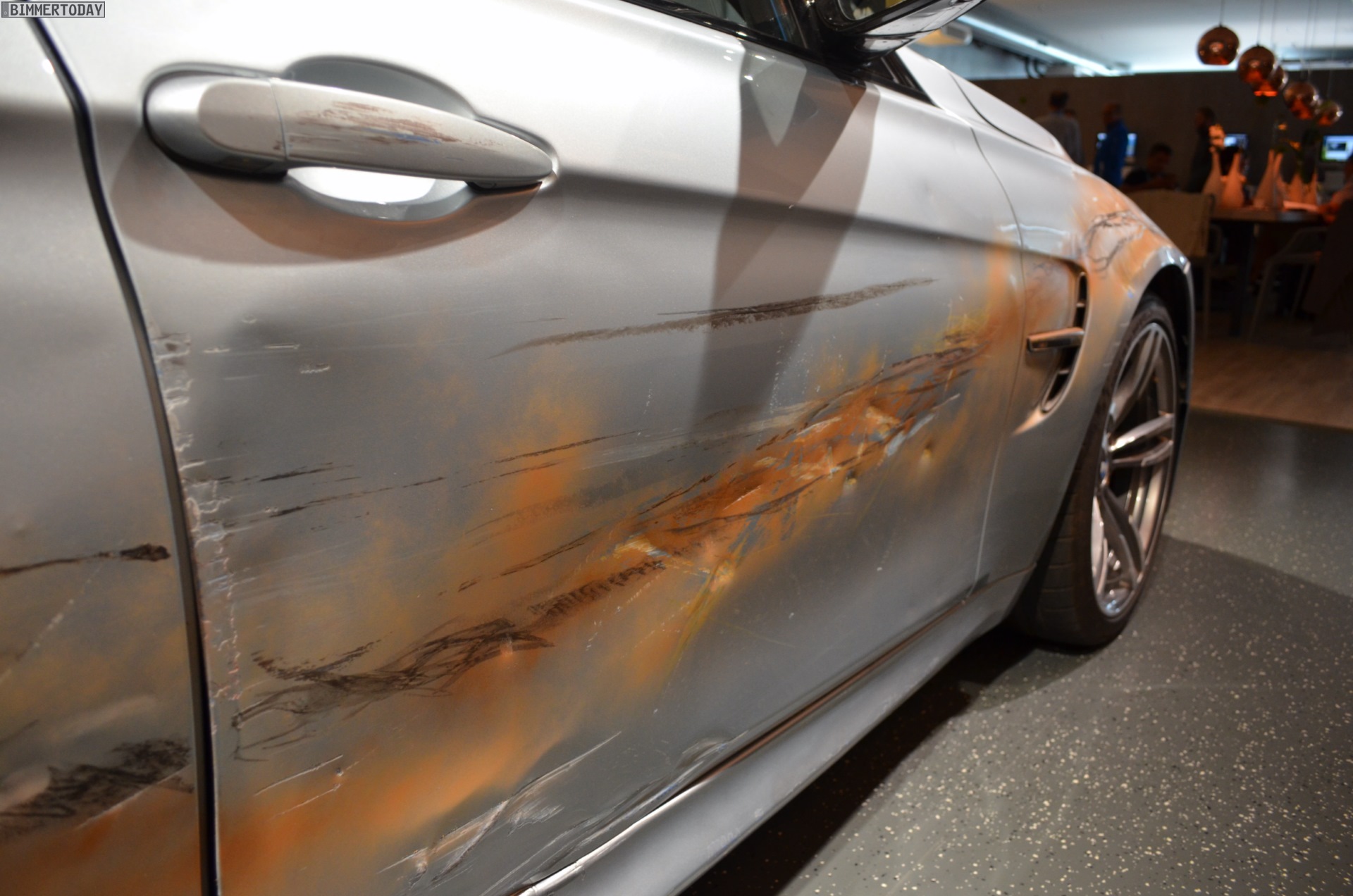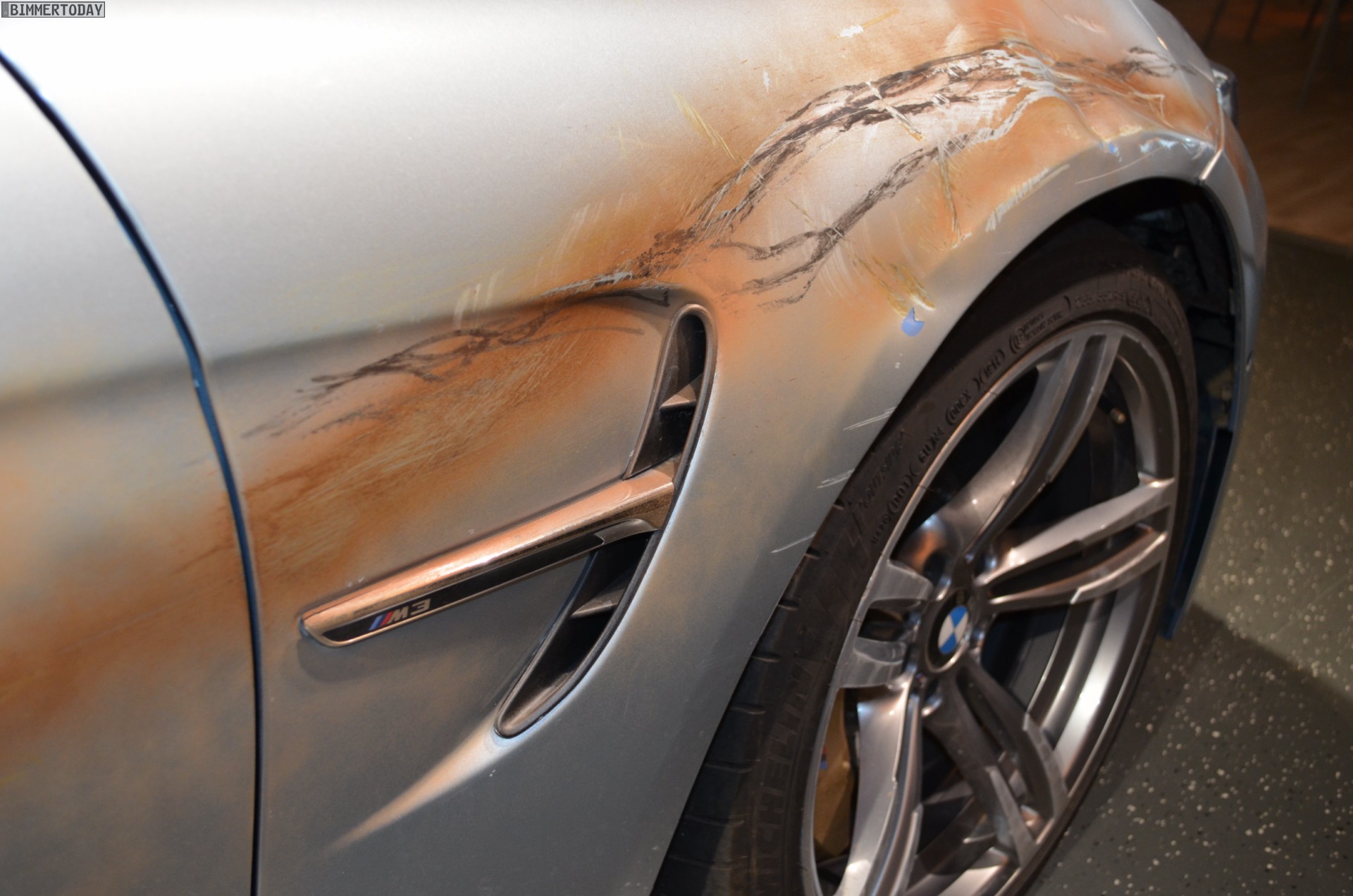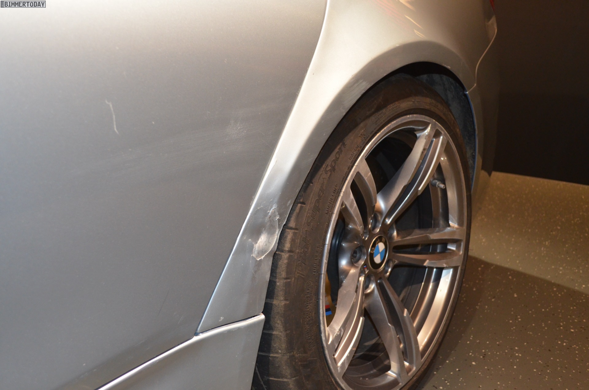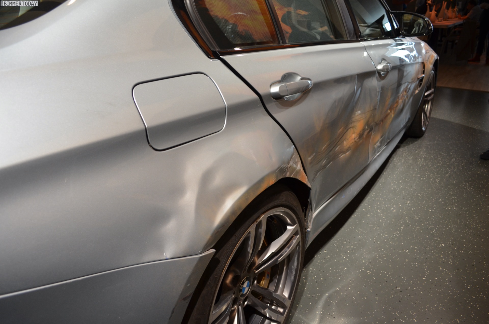 Neben kleineren Beschädigungen an der Frontschürze sowie am Carbon-Dach weist die BMW M3 Limousine aus Mission Impossible V auch großflächige Schäden an der rechten Fahrzeugseite sowie einige Einschusslöcher in der Kofferraum-Haube auf.