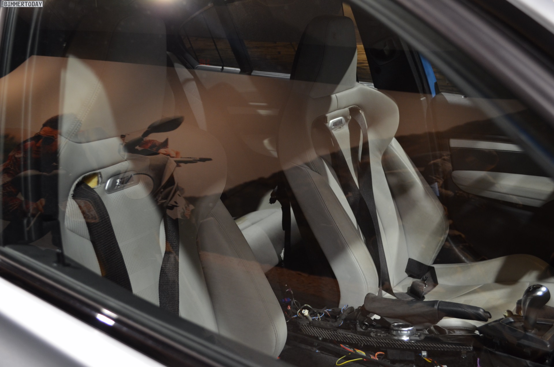 Wir durften nun eines der Fahrzeuge aus nächster Nähe betrachten, das direkt an den Dreharbeiten beteiligt war. Der äußerlich ziemlich ramponierte BMW M3 F80 trägt eine professionelle Folierung in Silverstone Metallic, schließlich ist diese Farbe im Film als einzige zu sehen. Darunter lässt sich jedoch an einigen Stellen die Original-Lackierung in Yas Marina Blau erkennen, denn BMW hat aus naheliegenden Gründen keine brandneuen M3 zur Verfügung gestellt – einige Exemplare waren frühere Testfahrzeuge, die ohnehin den Weg in die Schrottpresse gefunden hätten.