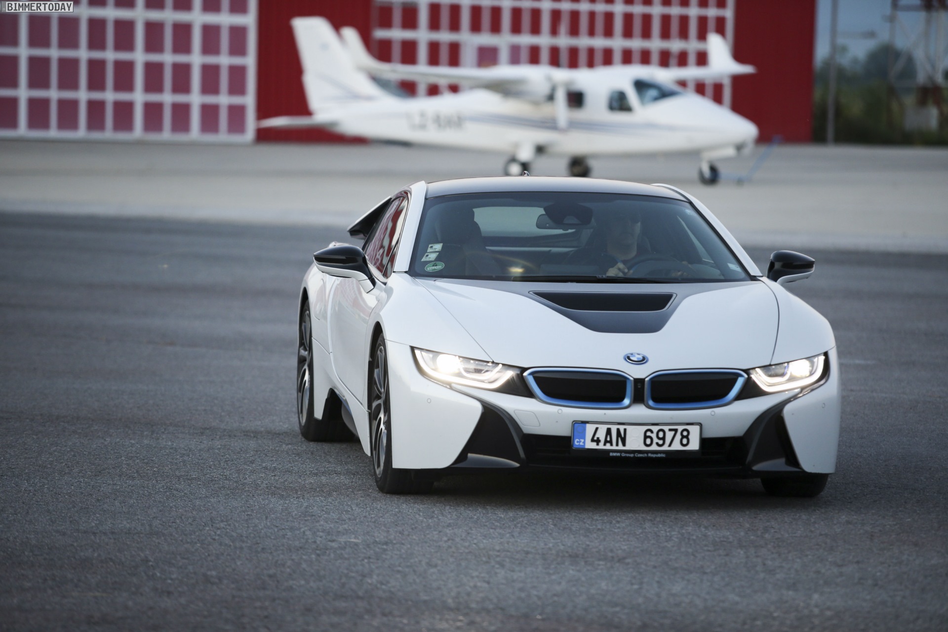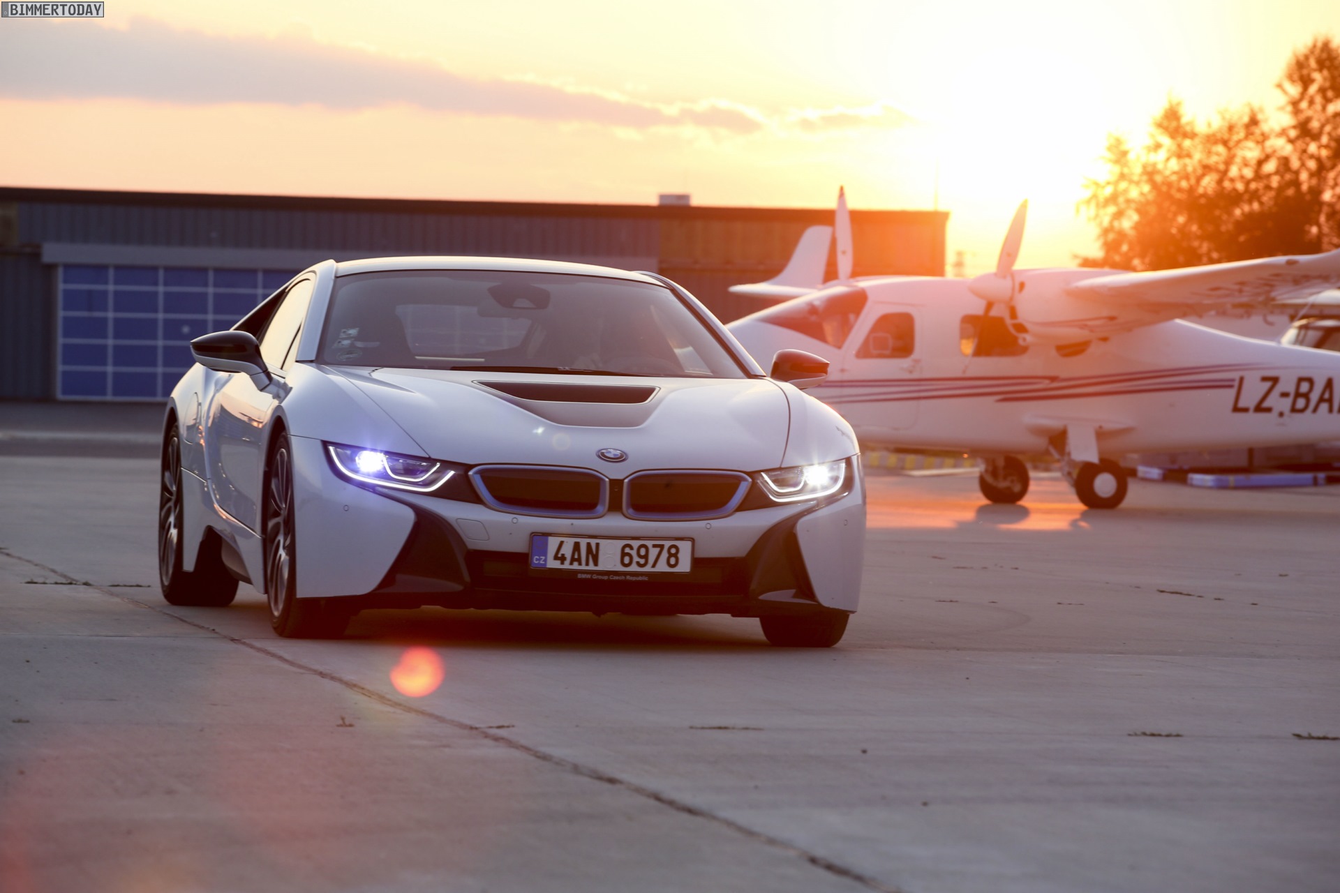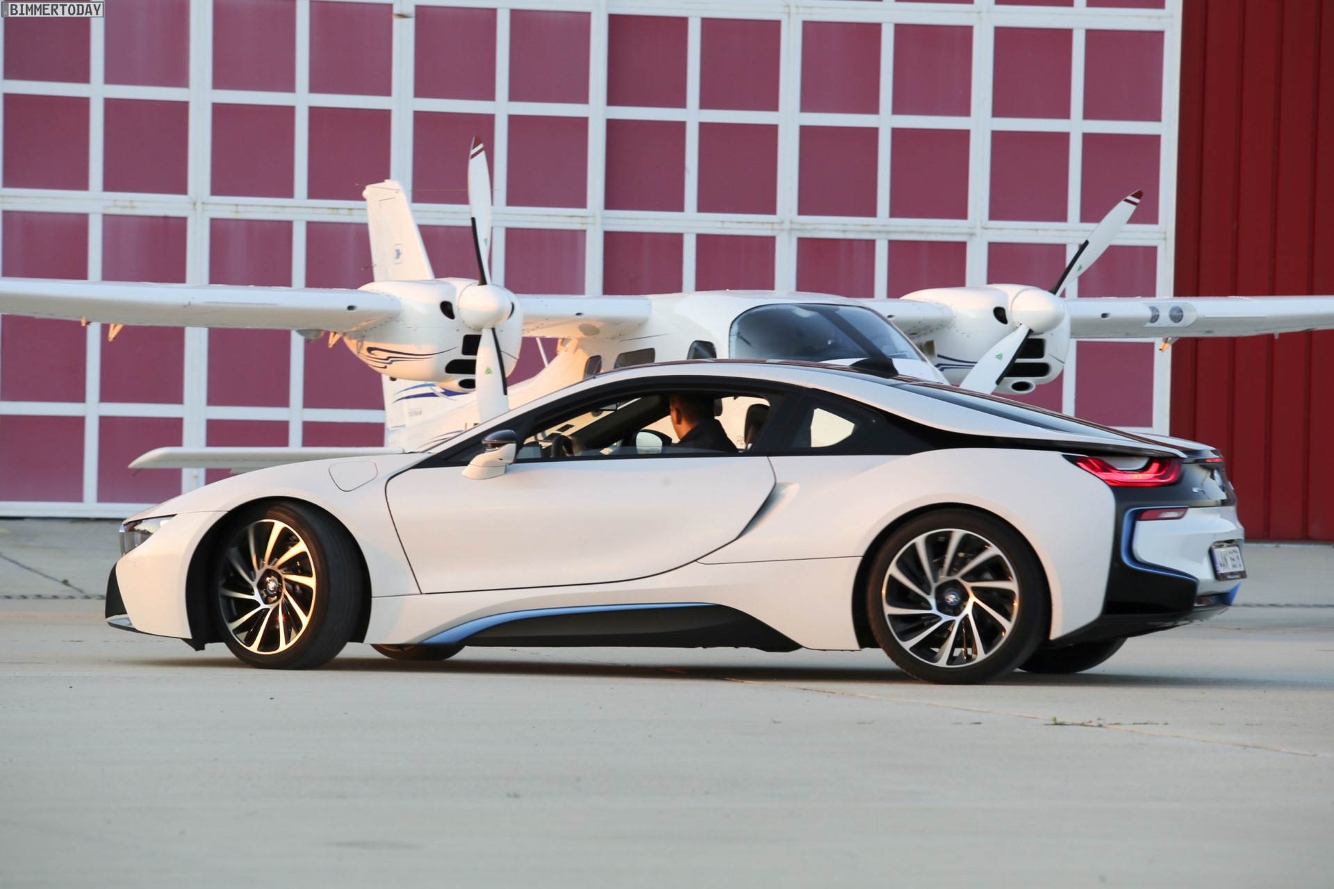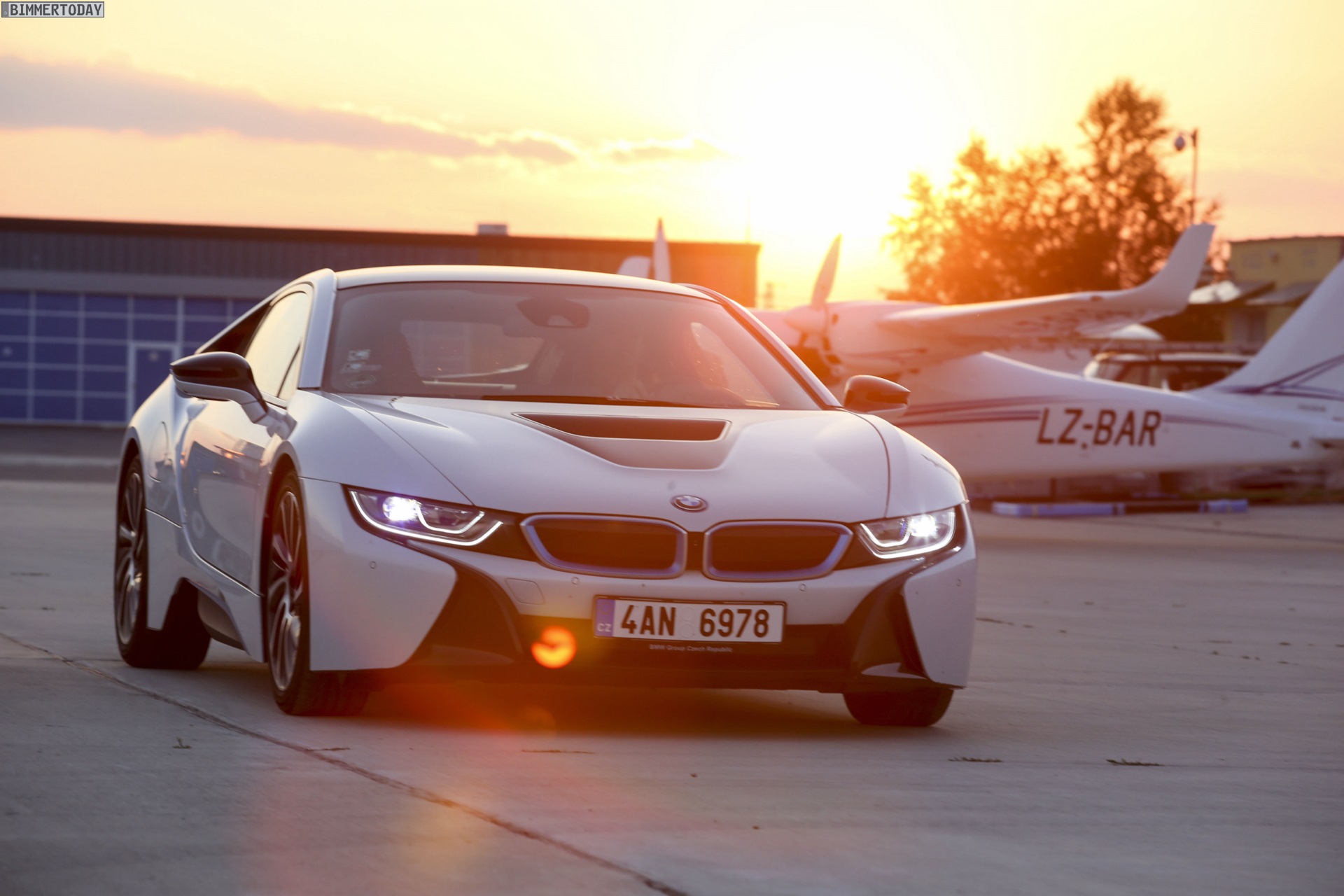 Aus Slowenien erreichen uns neue BMW i8-Fotos mit Wallpaper-Qualitäten. Die zum Teil auf dem Lesnovo Airport entstandenen Aufnahmen zeigen den Flügeltürer mit Plug-in-Hybrid-Antrieb in Kristallweiß Perleffekt mit Akzentein BMW i-Blau, die Elemente des sogenannten Black Belt sind natürlich auch bei dieser Variante in Schwarz ausgeführt.