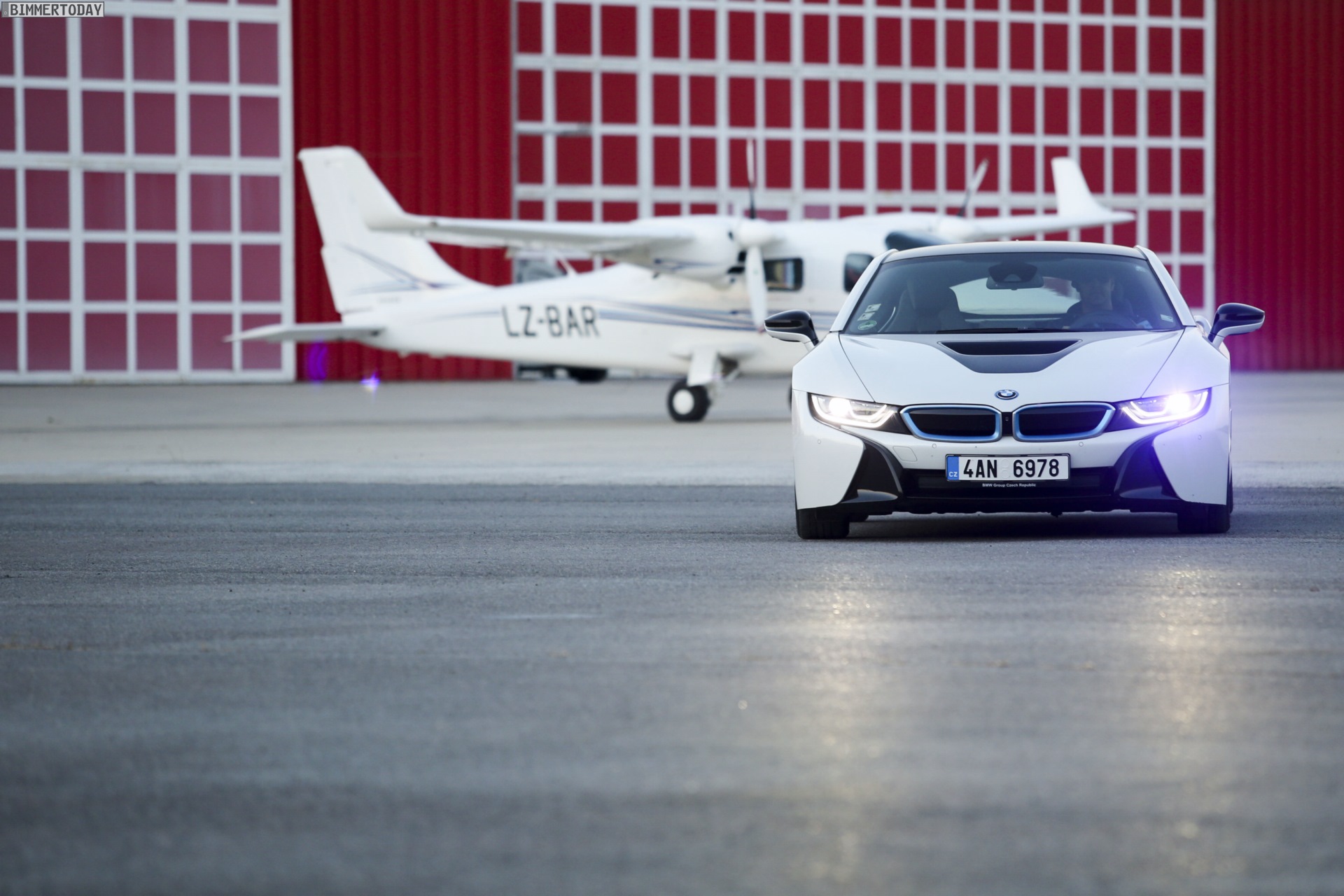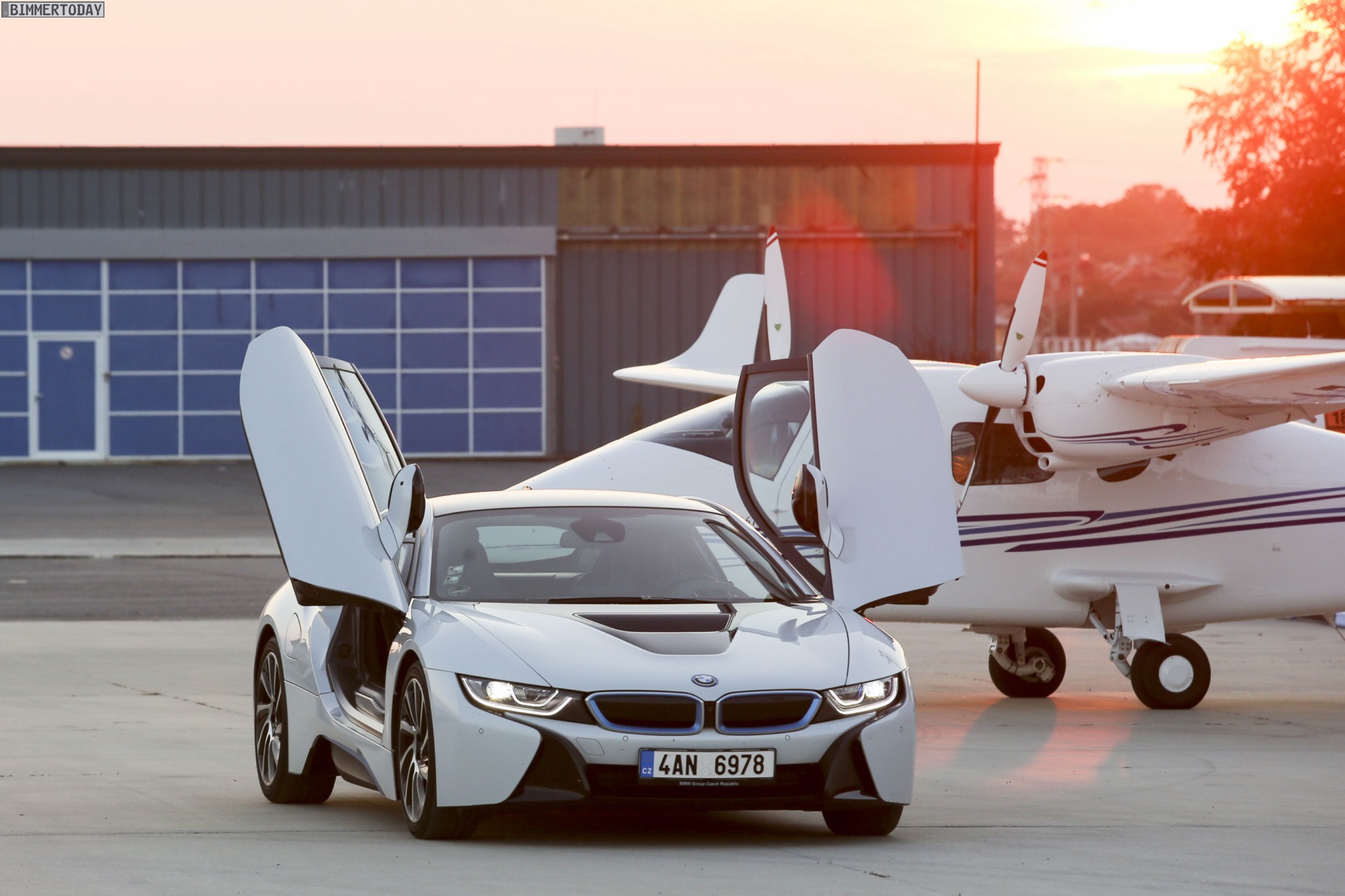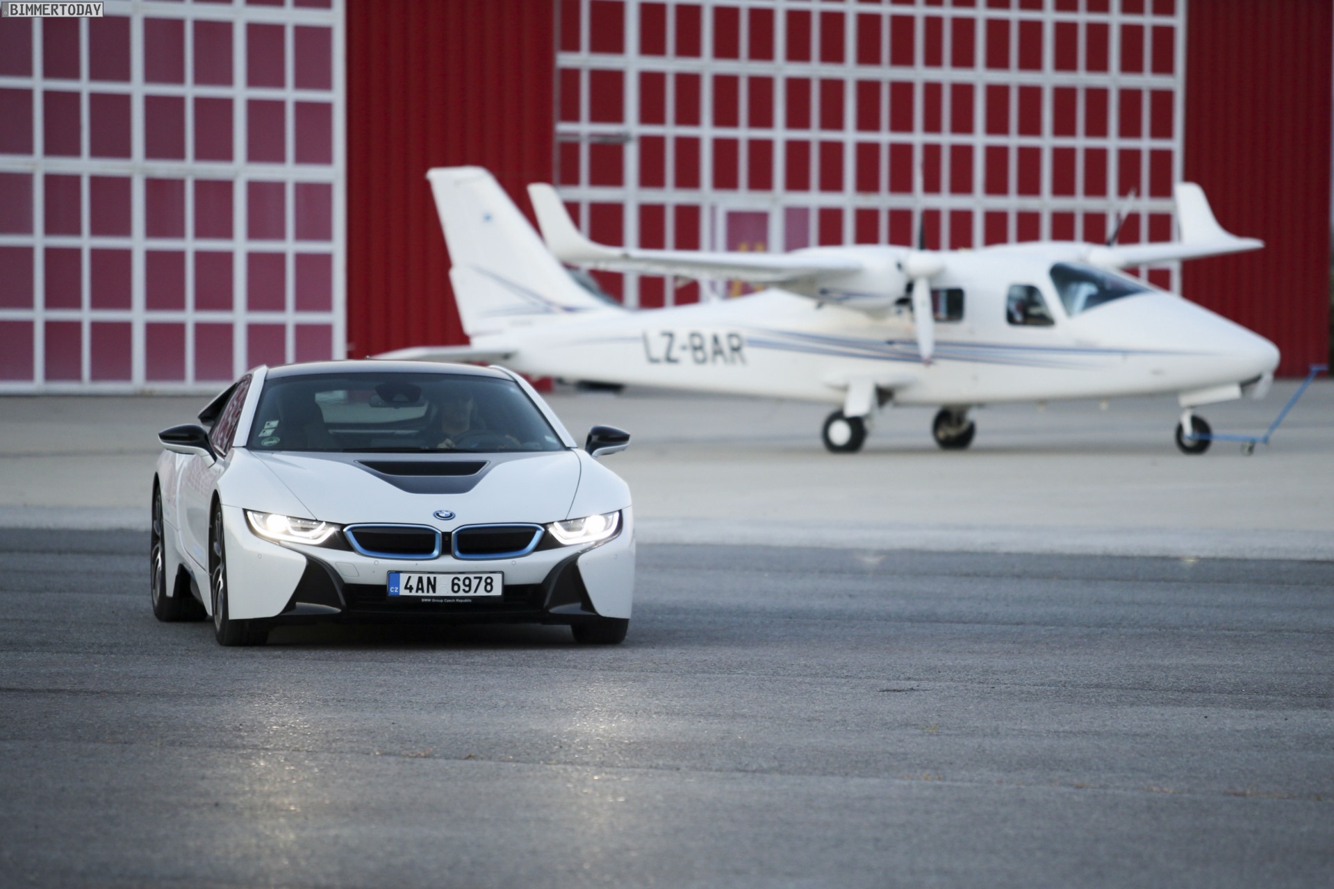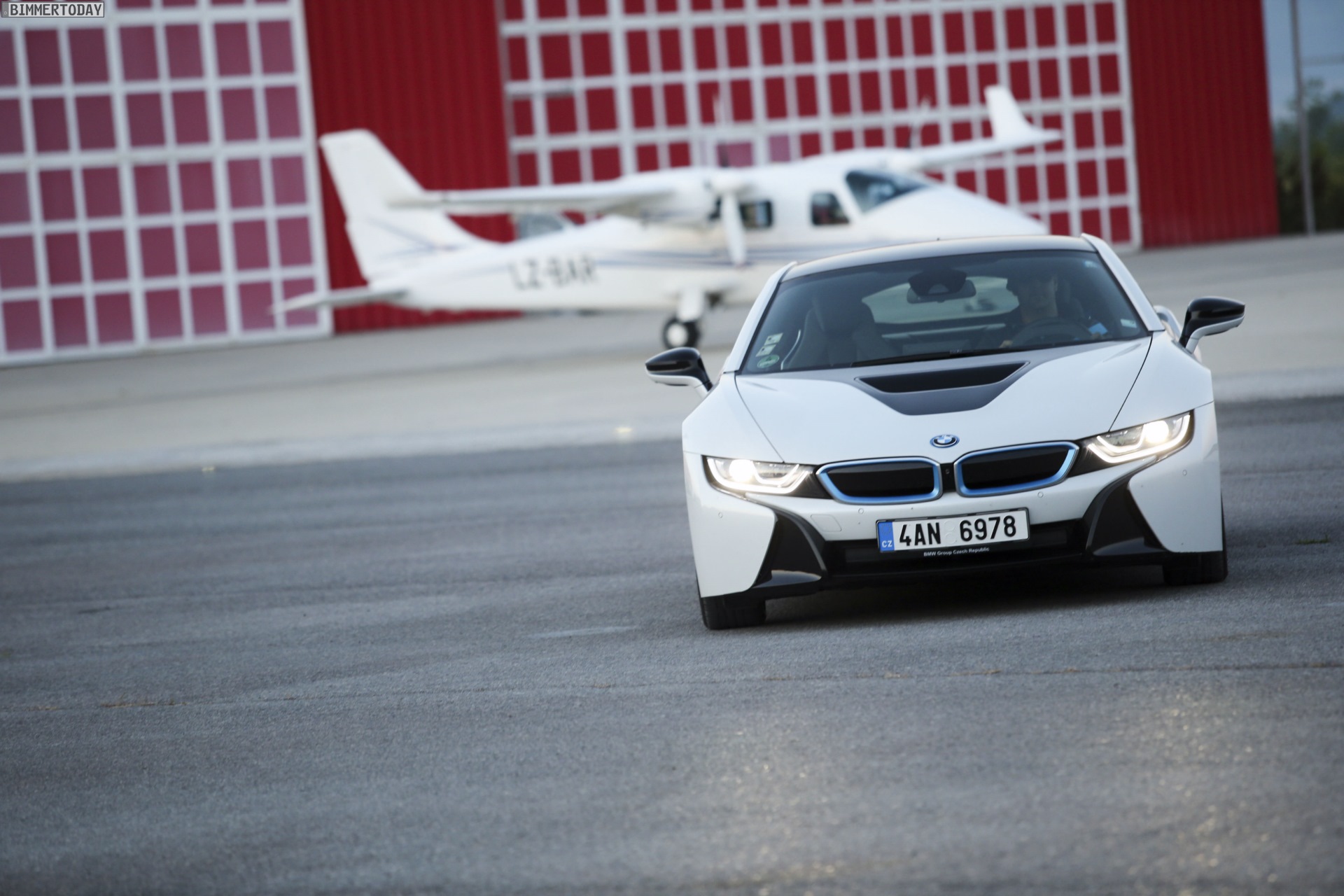 Aus Slowenien erreichen uns neue BMW i8-Fotos mit Wallpaper-Qualitäten. Die zum Teil auf dem Lesnovo Airport entstandenen Aufnahmen zeigen den Flügeltürer mit Plug-in-Hybrid-Antrieb in Kristallweiß Perleffekt mit Akzentein BMW i-Blau, die Elemente des sogenannten Black Belt sind natürlich auch bei dieser Variante in Schwarz ausgeführt.