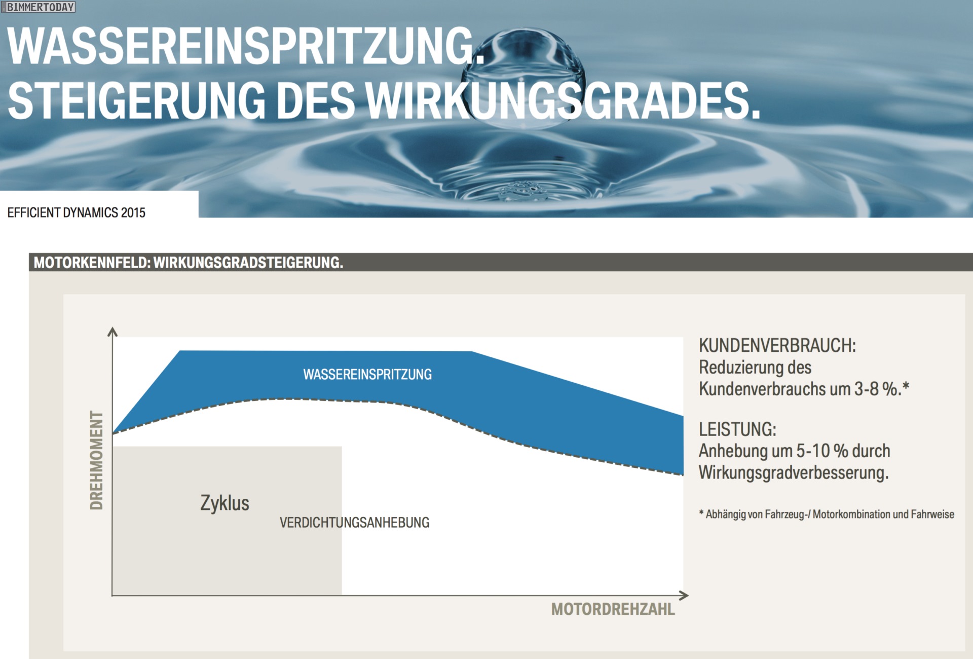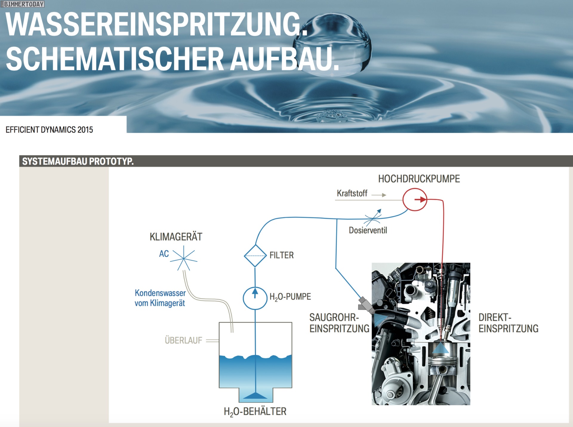 Schon jetzt wird in München auch an der zweiten Generation der Wassereinspritzung gearbeitet, bei dieser Technik wird Wasser direkt in den Brennraum eingespritzt und verhindert dort durch niedrigere Temperaturen eine unkontrollierte Verbrennung. Im Ergebnis kann der Motor stärker aufgeladen werden, ohne Nachteile bei Verbrauch oder Haltbarkeit von Bauteilen in Kauf nehmen zu müssen.