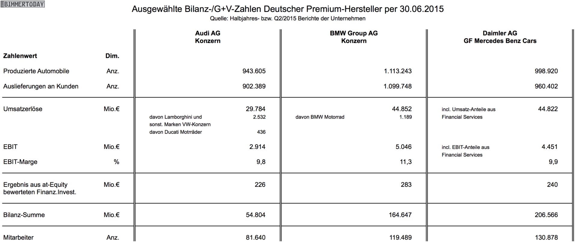 In der vergangenen Woche hat BMW als letzter der drei deutschen Premiumhersteller die Q2-Informationen und damit die bilanziellen Zahlen für das 1. Halbjahr 2015 vorgelegt. Grund für uns einmal alle relevanten Informationen aus den Abschlüssen der drei Unternehmen als Gegenüberstellung zu zeigen.