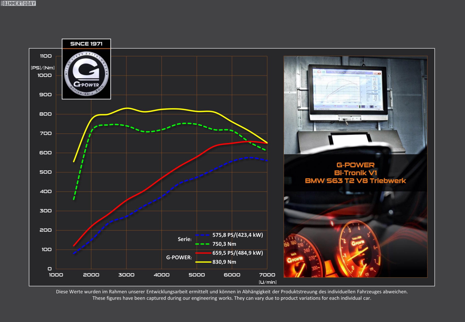 In beiden Varianten verspricht G-Power eine Steigerung der Motorleistung um 75 auf 650 PS, das maximale Drehmoment von 830 Newtonmeter steht in einem breiten Fenster zwischen 2.500 und 5.500 U/min zur Verfügung. Auf Wunsch deaktiviert G-Power außerdem die elektronische Vmax-Limitierung bei 250 oder 280 km/h und erlaubt dem BMW X6 M so eine Höchstgeschwindigkeit jenseits der 300 km/h.