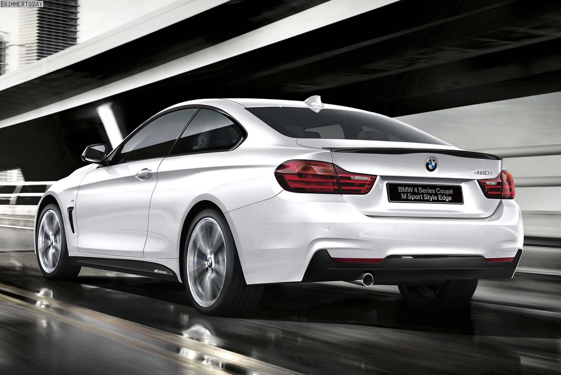 Für eine sportlichere Optik sorgen das für alle BMW 4er F32 erhältliche M Sportpaket sowie einige Tuning-Komponenten aus dem Programm von BMW M Performance: Schwarze Nieren, Seitenschweller mit schwarzen Elementen und M Performance-Schriftzug und die ebenfalls farblich abgesetzte Heckspoiler-Lippe lassen den BMW 4er M Sport Style Edge deutlich dynamischer auftreten.