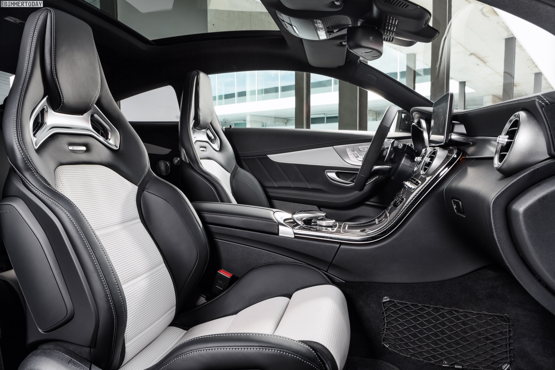 Mercedes-AMG C 63 S Coupé (C 205) 2015; Interieur: Leder kristallgrau/schwarz, AMG Performance Sitze für Fahrer und Beifahrer mit stärker konturierter Sitzform für gesteigerten Seitenhalt, integrierten Kopfstützen und AMG Plakette in den Sitzlehnen, AMG Zierteile Carbon/Aluminium mit Längsschliff hell