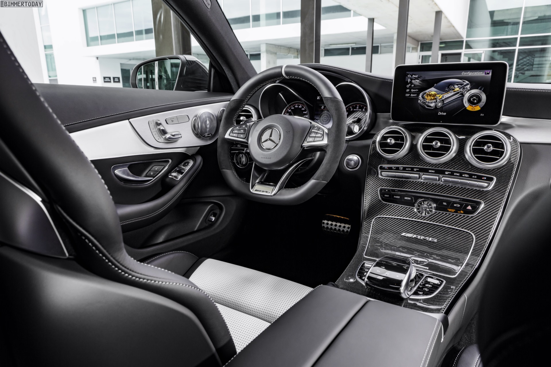 Mercedes-AMG C 63 S Coupé (C 205) 2015; Interieur: Leder kristallgrau/schwarz, AMG Performance Lenkrad in Leder Nappa schwarz/Mikrofaser DINAMICA im 3-Speichen-Design unten abgeflacht, 12 Uhr-Markierung in Schwarz, Lenkradblende in Silberchrom mit “AMG” Schriftzug und silberfarbenen Aluminium-Schaltpaddles, AMG Zierteile Carbon/Aluminium mit Längsschliff hell