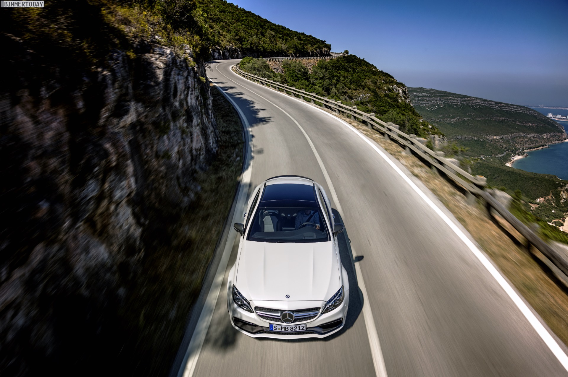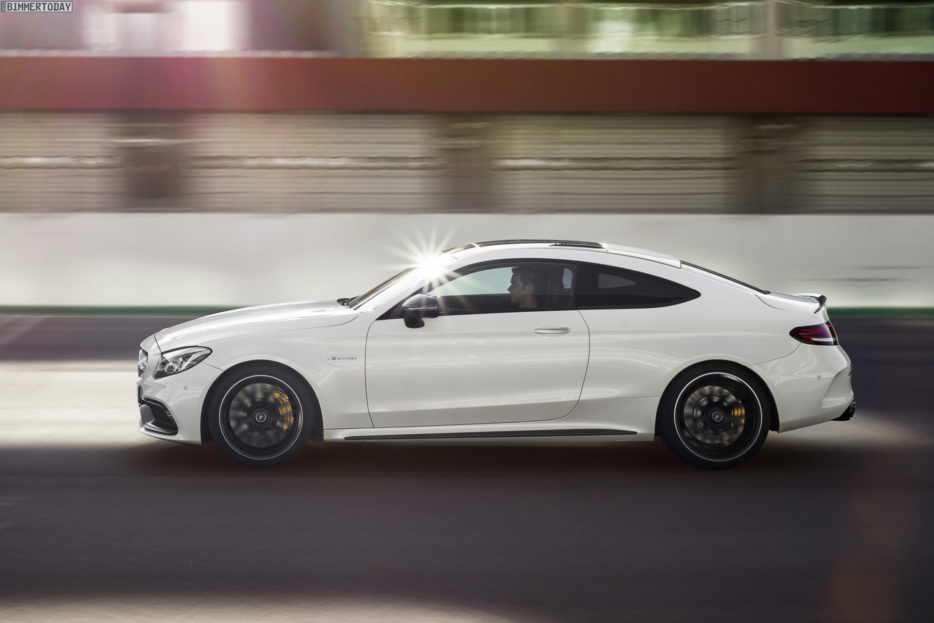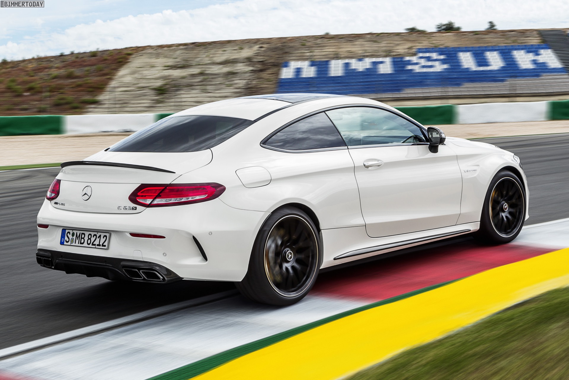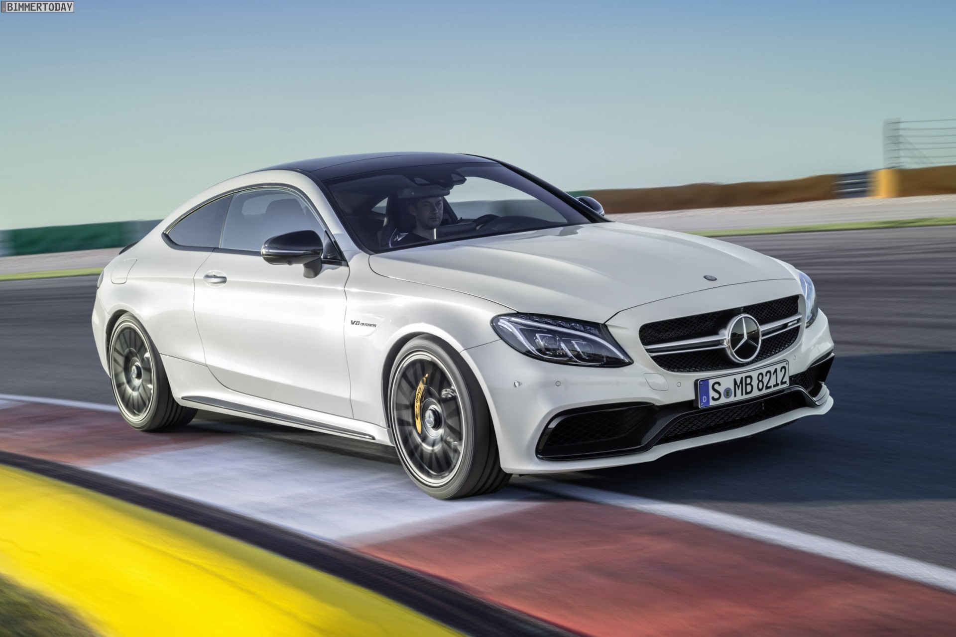 Mercedes-AMG C 63 S Coupé (C 205) 2015; Exterieur: designo diamantweiß bright, Night Paket, AMG Keramik Hochleistungs-Verbundbremsanlage mit Verbundbremsscheiben 402 x 39 mm vorn und Integralbremsscheiben 360 x 26 mm hinten sowie speziell lackierten Bremssätteln mit “AMG Carbon Ceramic” Schriftzug, 48,3 cm (19″)/50,8 cm (20″) AMG Schmiederäder im Kreuzspeichen-Design schwarz matt lackiert und glanzgedreht
